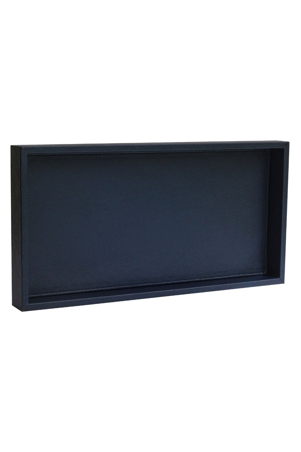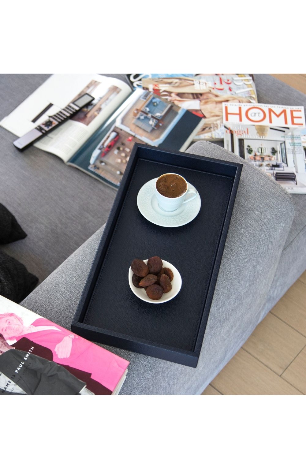 lacivert tonu ve sade tasarımıyla dikkat çeken bu büyük boy suni deri tepsi,