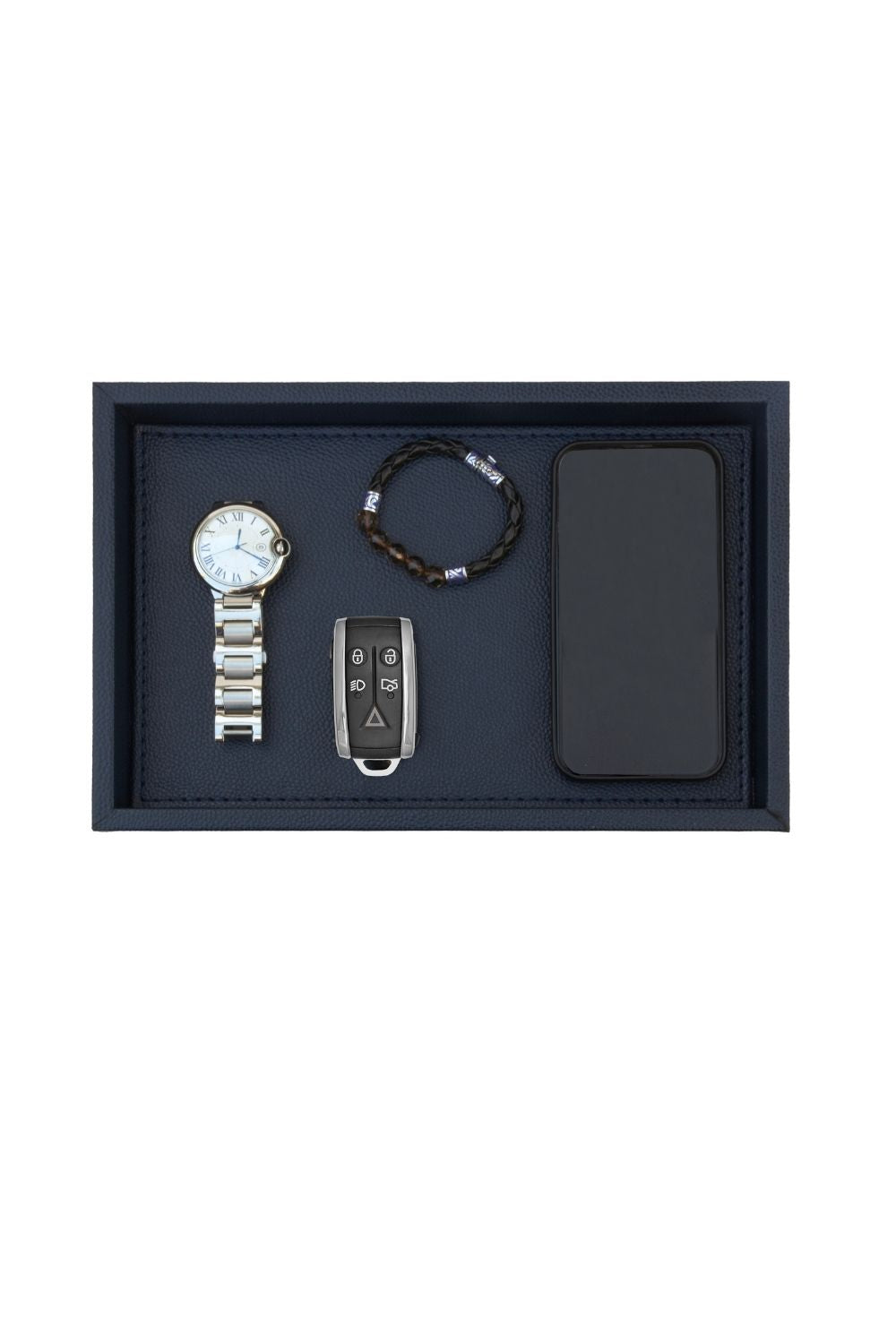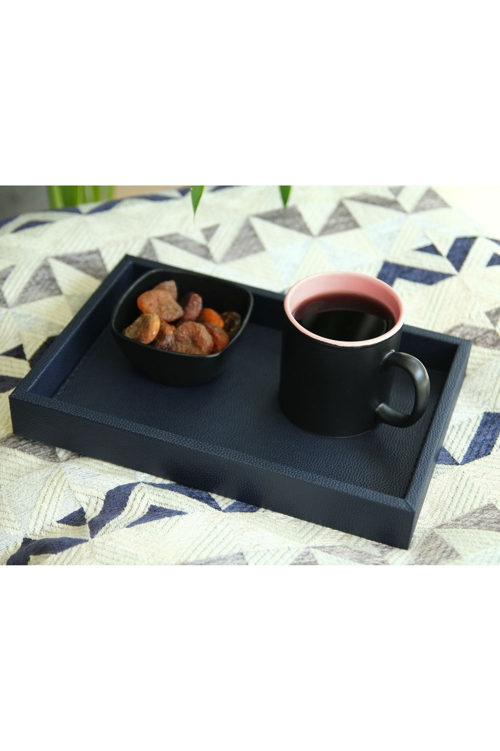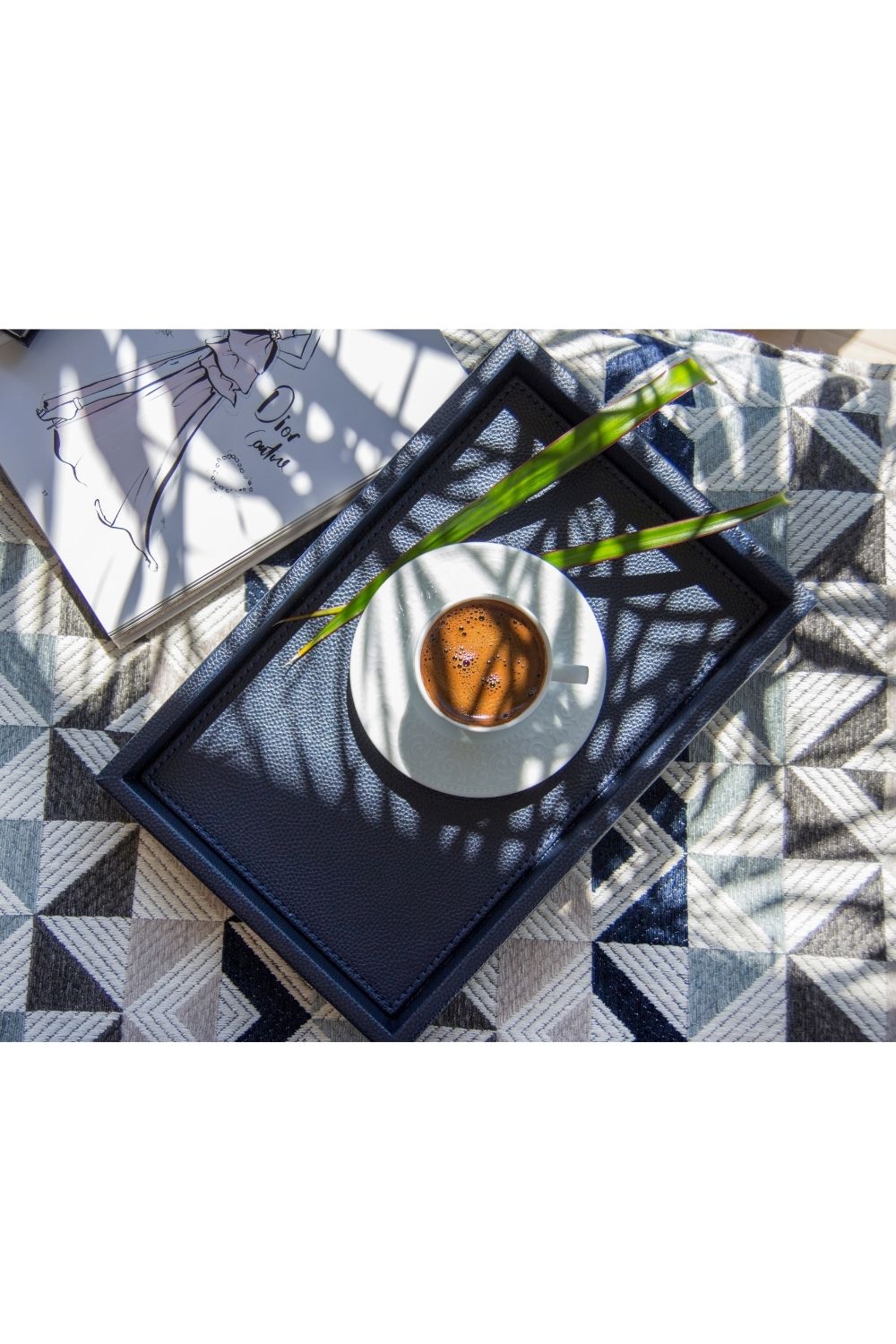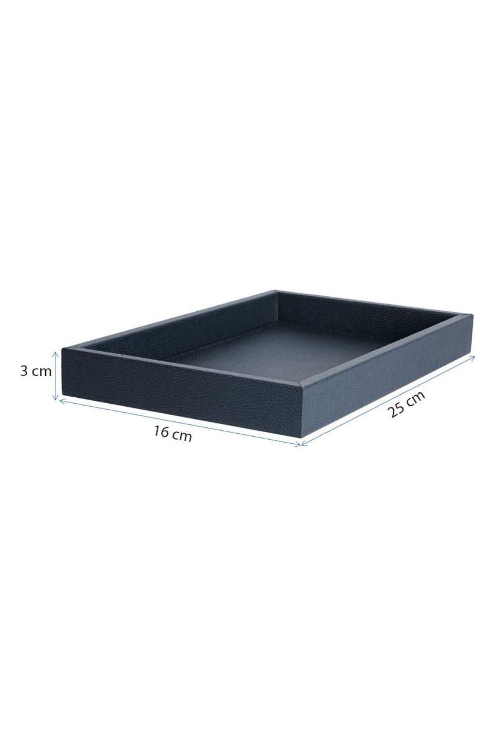 lacivert tonu ve sade tasarımıyla dikkat çeken bu küçük boy suni deri tepsi,