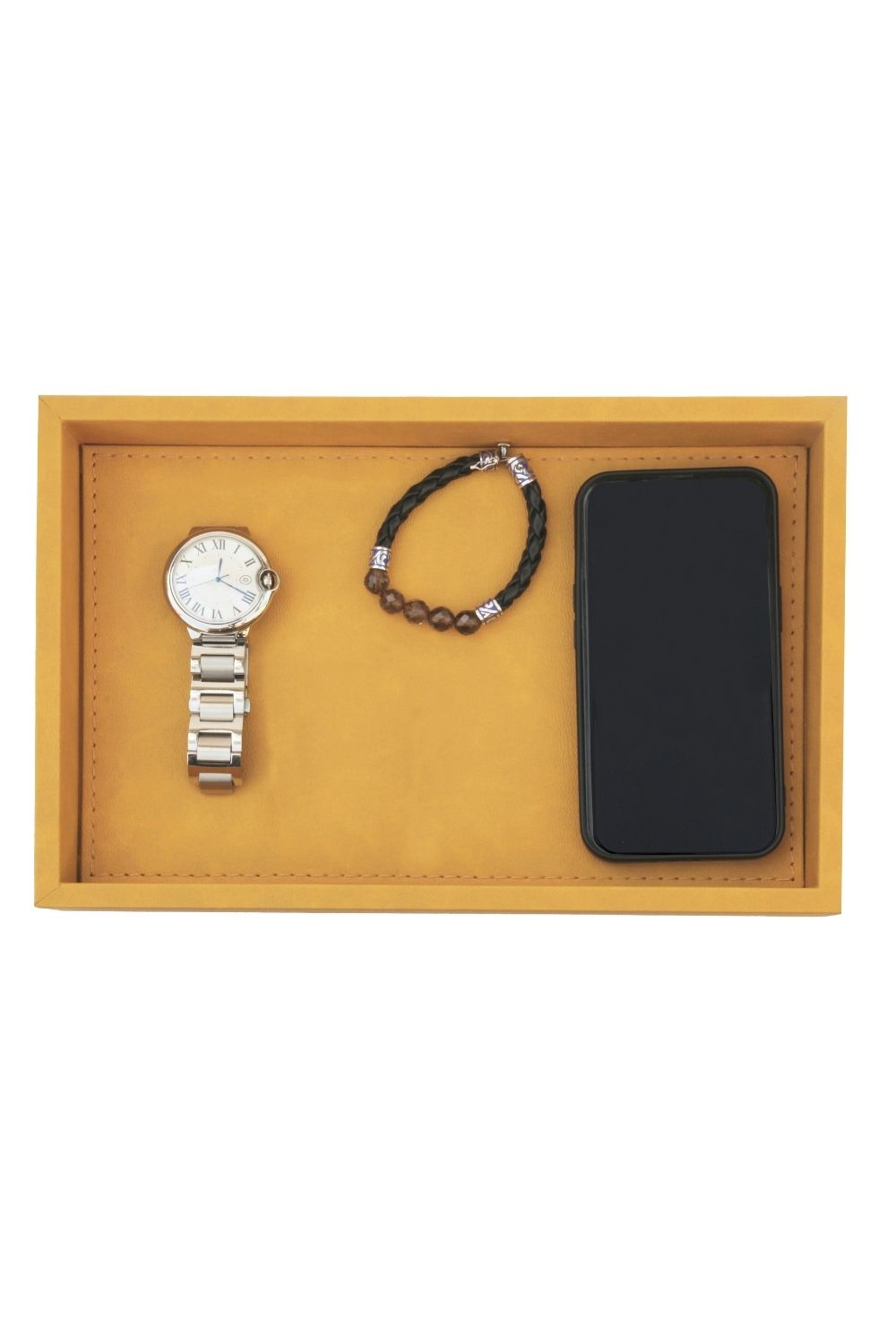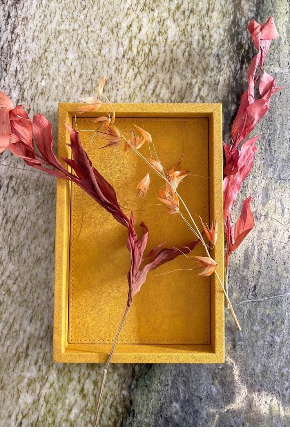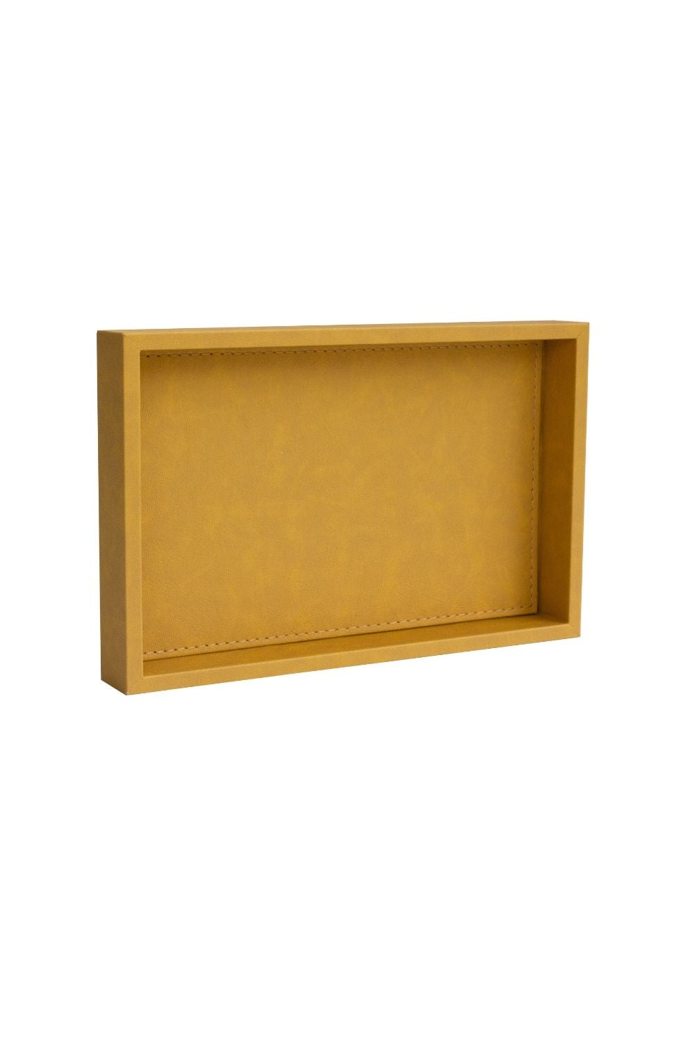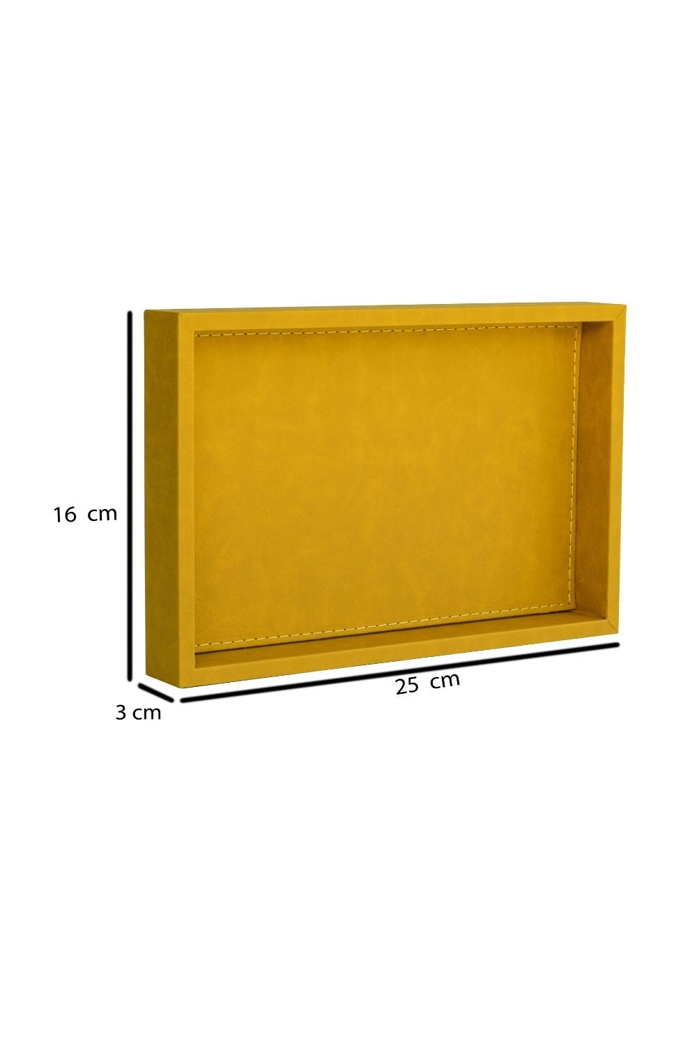 Canlı sarı rengiyle enerjik ve zarif bir görünüm sunan bu küçük  boy suni deri tepsi, hem dekoratif hem de fonksiyonel bir kullanım sağlar. Kaliteli suni deriden üretilmiş olup, sağlam yapısı sayesinde uzun ömürlüdür. Misafir sunumlarında, kahve servislerinde veya konsol üzerinde dekoratif obje olarak şıklıkla kullanılabilir.