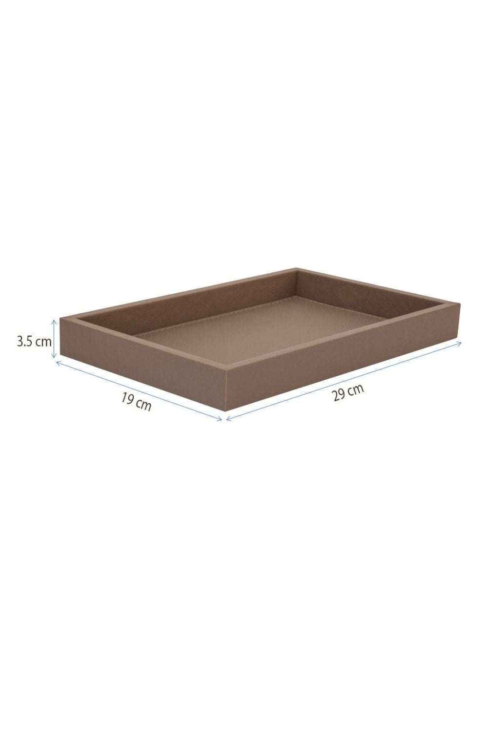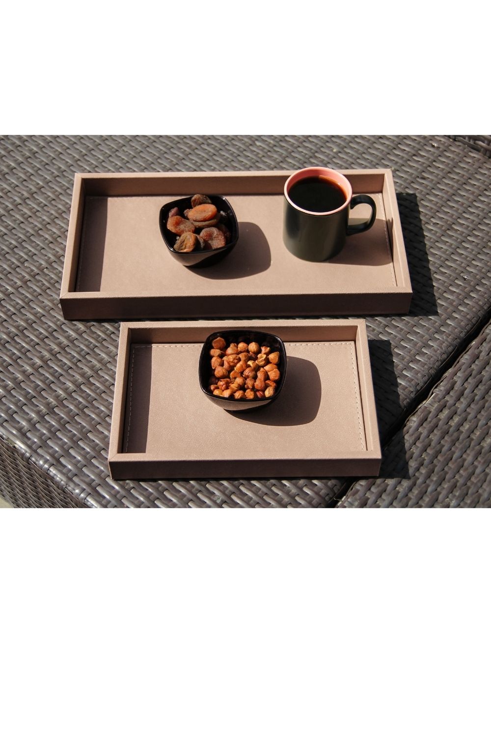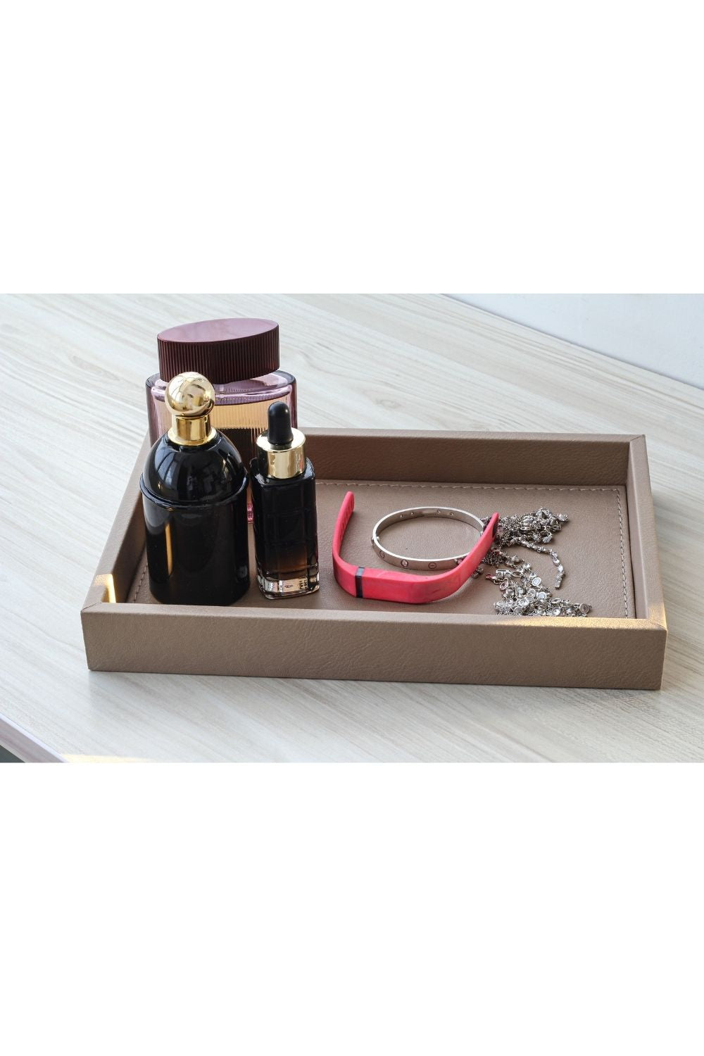tonları ve zarif tasarımıyla dikkat çeken bu orta boy camel renk suni deri tepsi, hem dekoratif