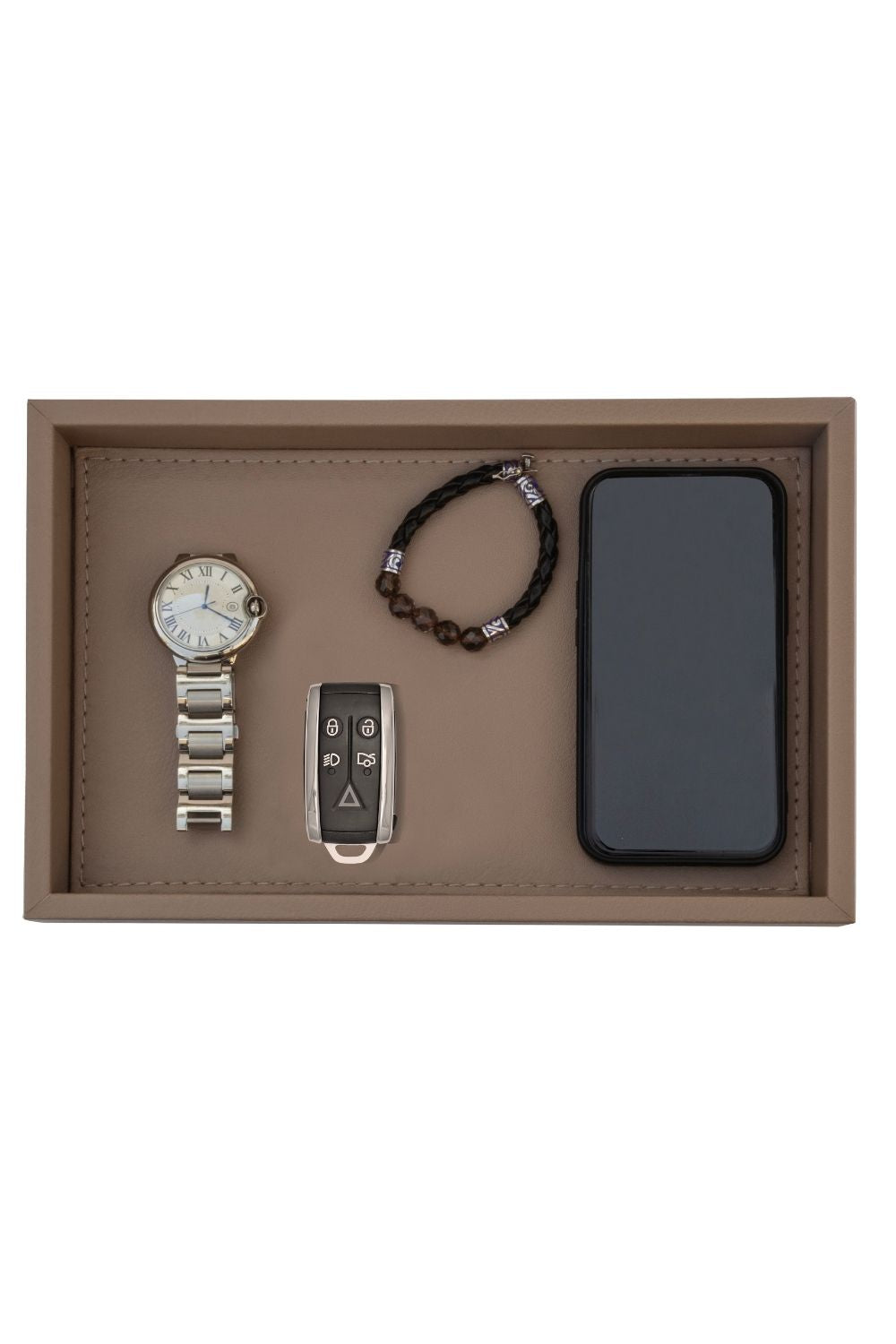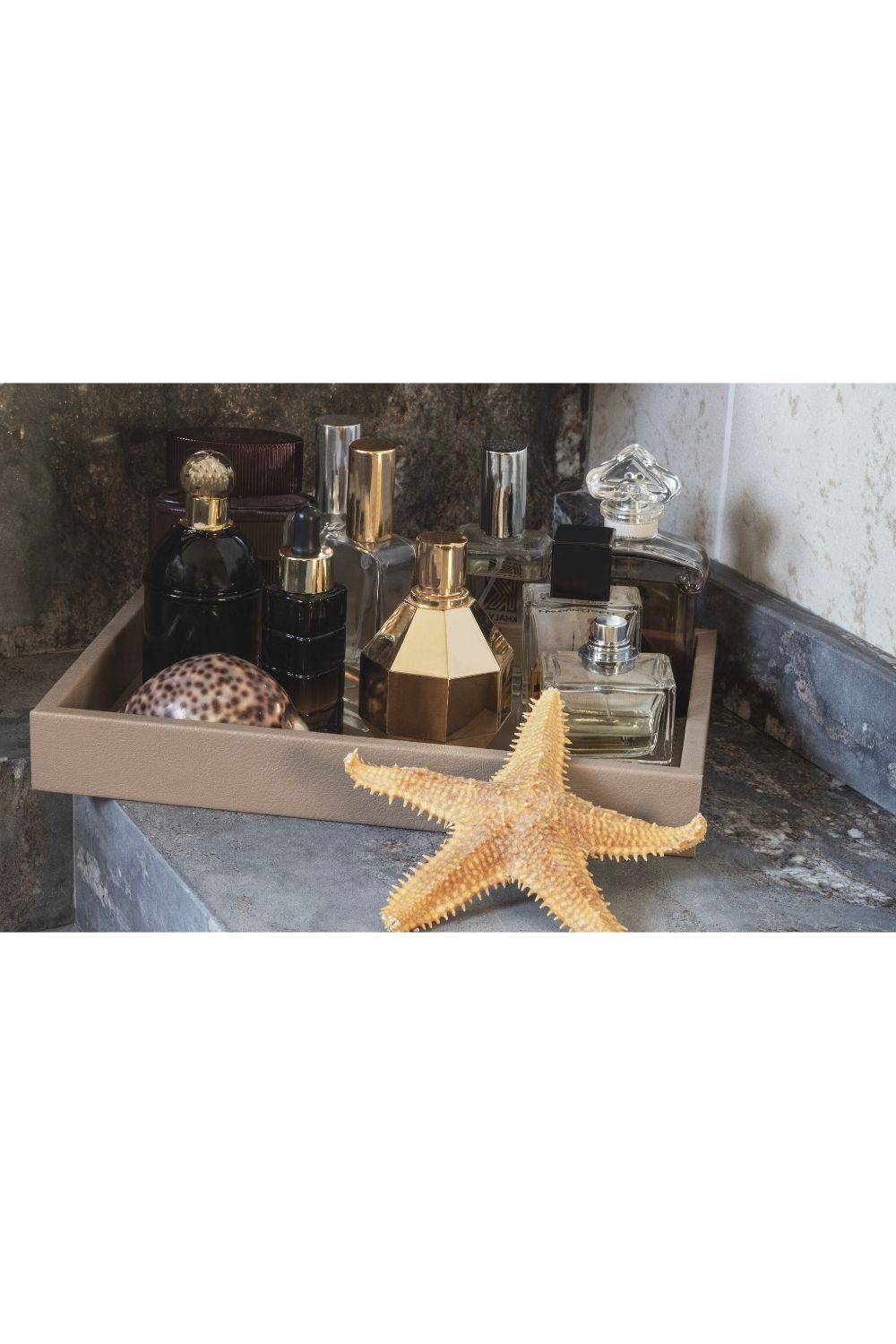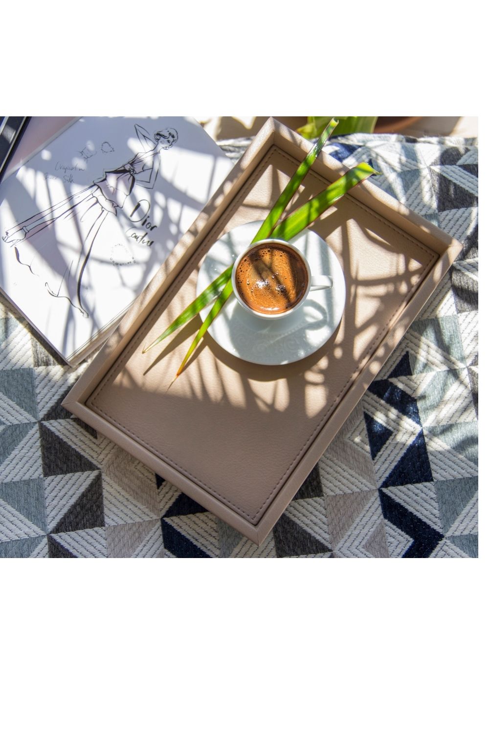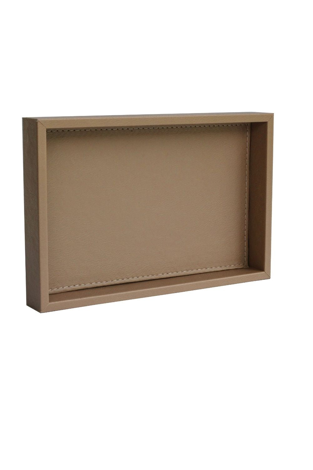 tonları ve zarif tasarımıyla dikkat çeken bu orta boy camel renk suni deri tepsi, hem dekoratif