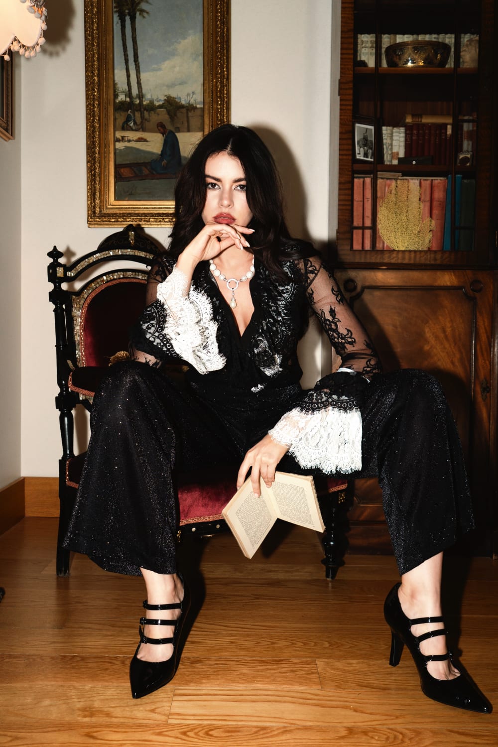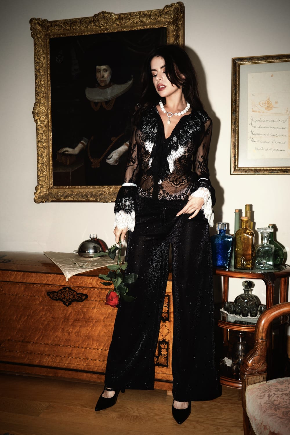 Dantelin içinde hayat bulan bir flamenko rüyası. Transparan siyah dantel kumaşı ve beyaz dantel ile süslenmiş dramatik volanlı manşetleriyle bu parça, asi ve vintage bir baştan çıkarıcılığın mükemmel dengesini kuruyor. Derin V yakası ve ince desen detayları feminen bir cazibe katarken, taşıdığı ruh sahnenin tam ortasında olmayı hak ediyor. Kimse bakmıyor gibi dans etmek için—ama herkesin izlediğini bilerek giymek için tasarlandı.
