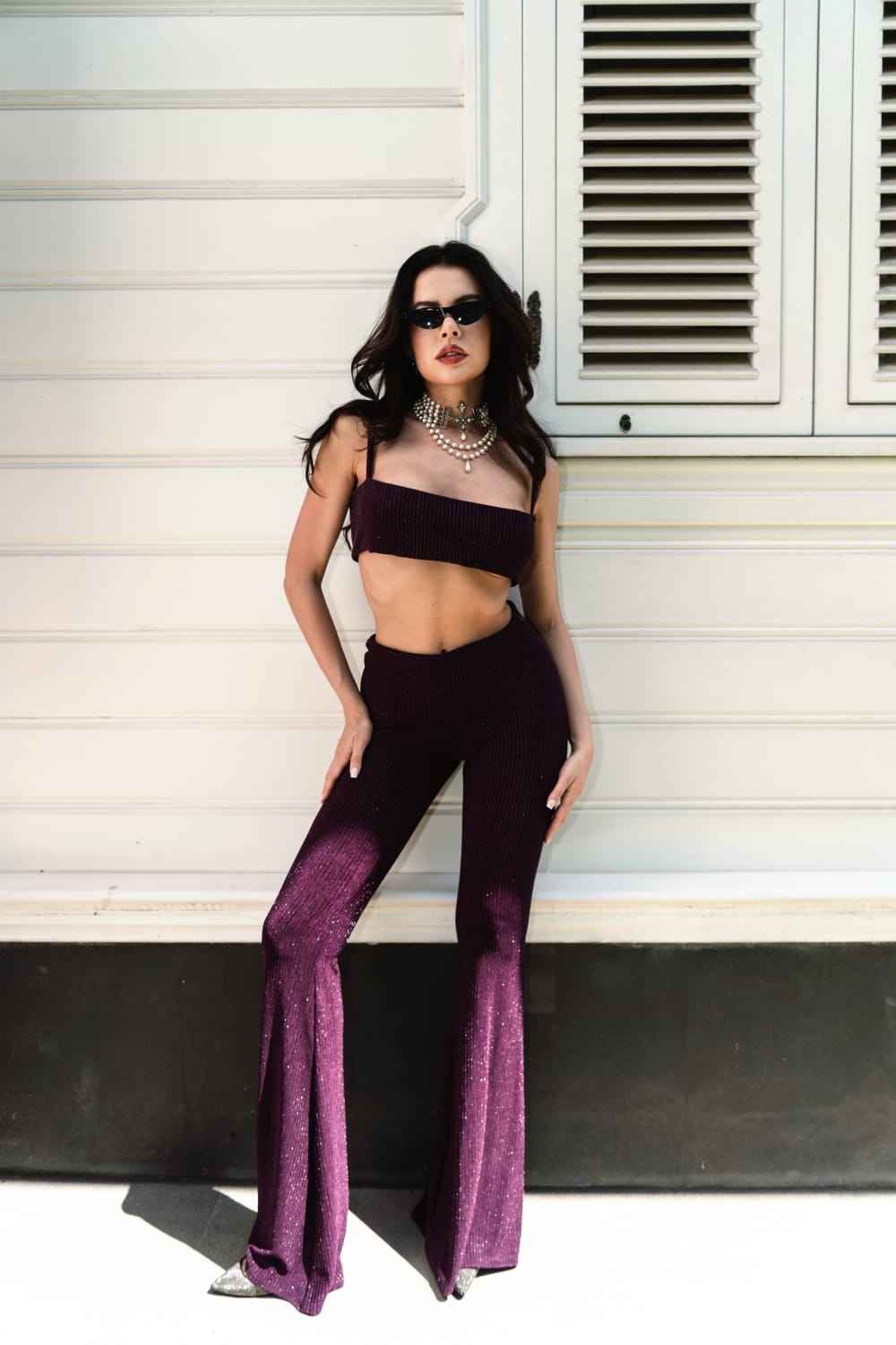 Her adımda bakışları üzerine çek. Bu yüksek bel, bol paça pantolonlar, garnet tonlarında hafif ışıltılı ipliklerle dokunmuş esnek bir kumaştan üretildi. Kalçadan dize kadar vücuda oturan formu, dizden sonra dramatik bir şekilde açılan siluetiyle 70’lerin ruhunu modern bir cazibe ile buluşturuyor. Gündüz şıklığına ışıltı katmak ya da geceye cesur bir giriş yapmak için ideal.
