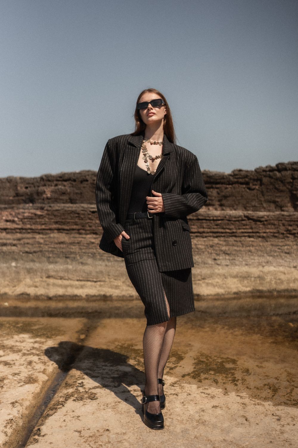 Siyah, Çizgili, Cep Detaylı, Önden Yırtmaçlı Kalem Etek