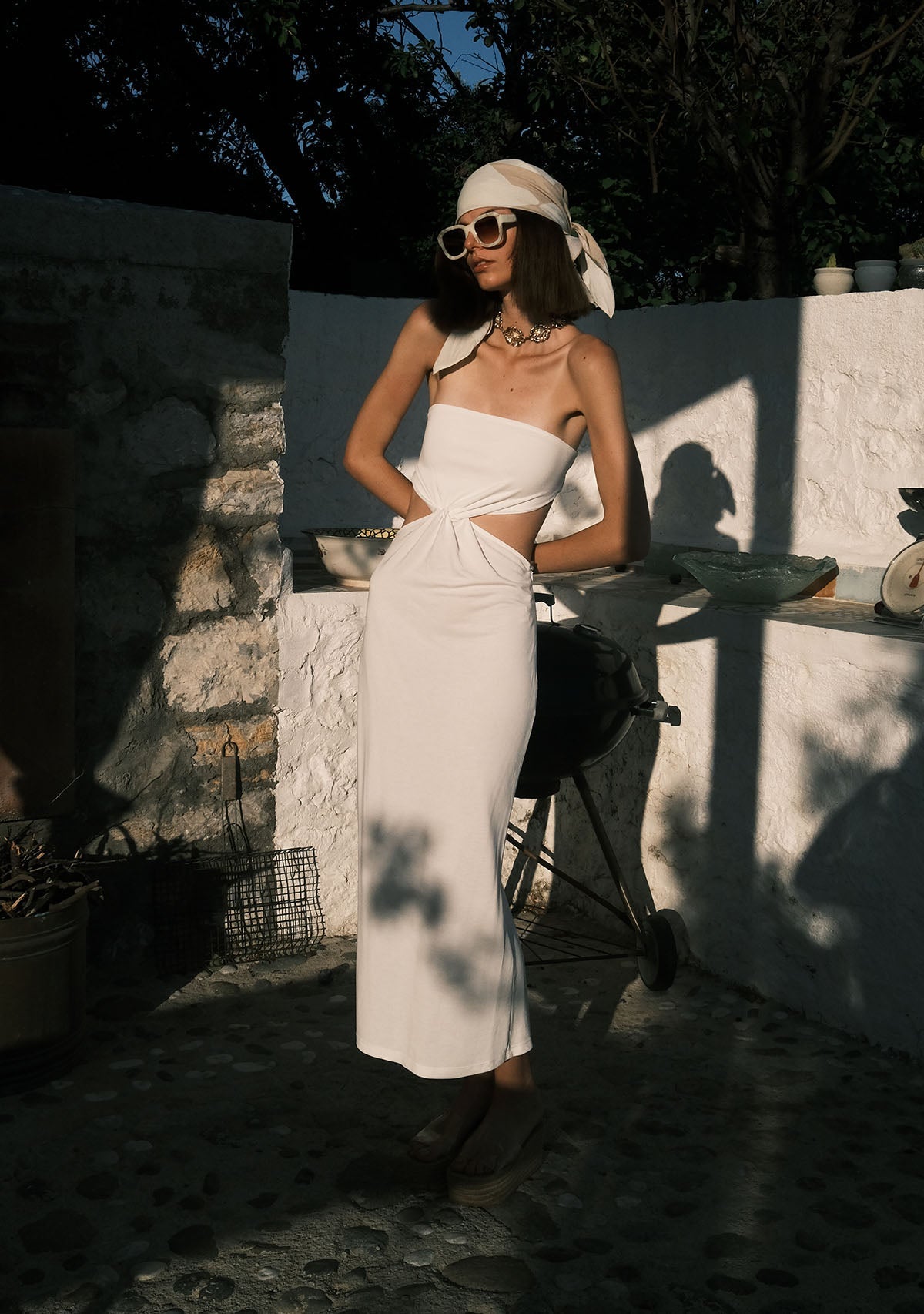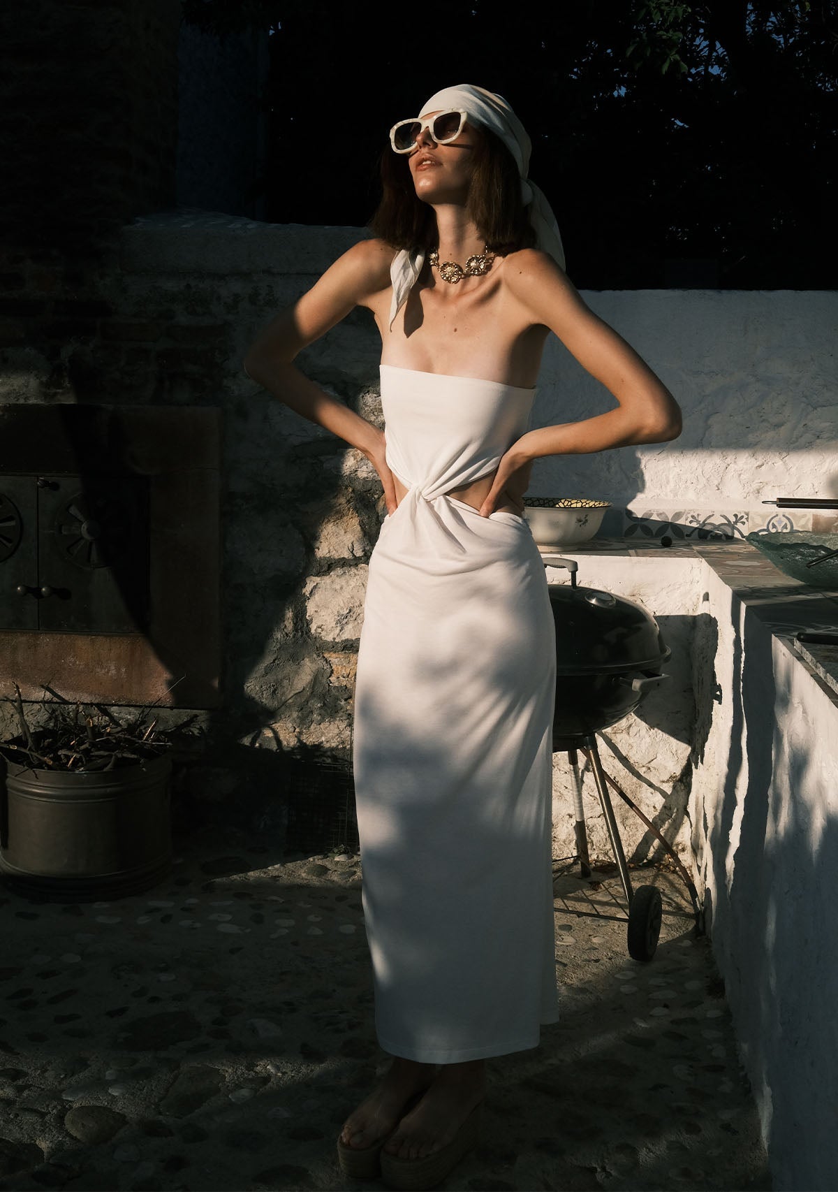 - Beli iki taraftan açıkta bırakan, üçgen detaylı uzun straplez elbise.