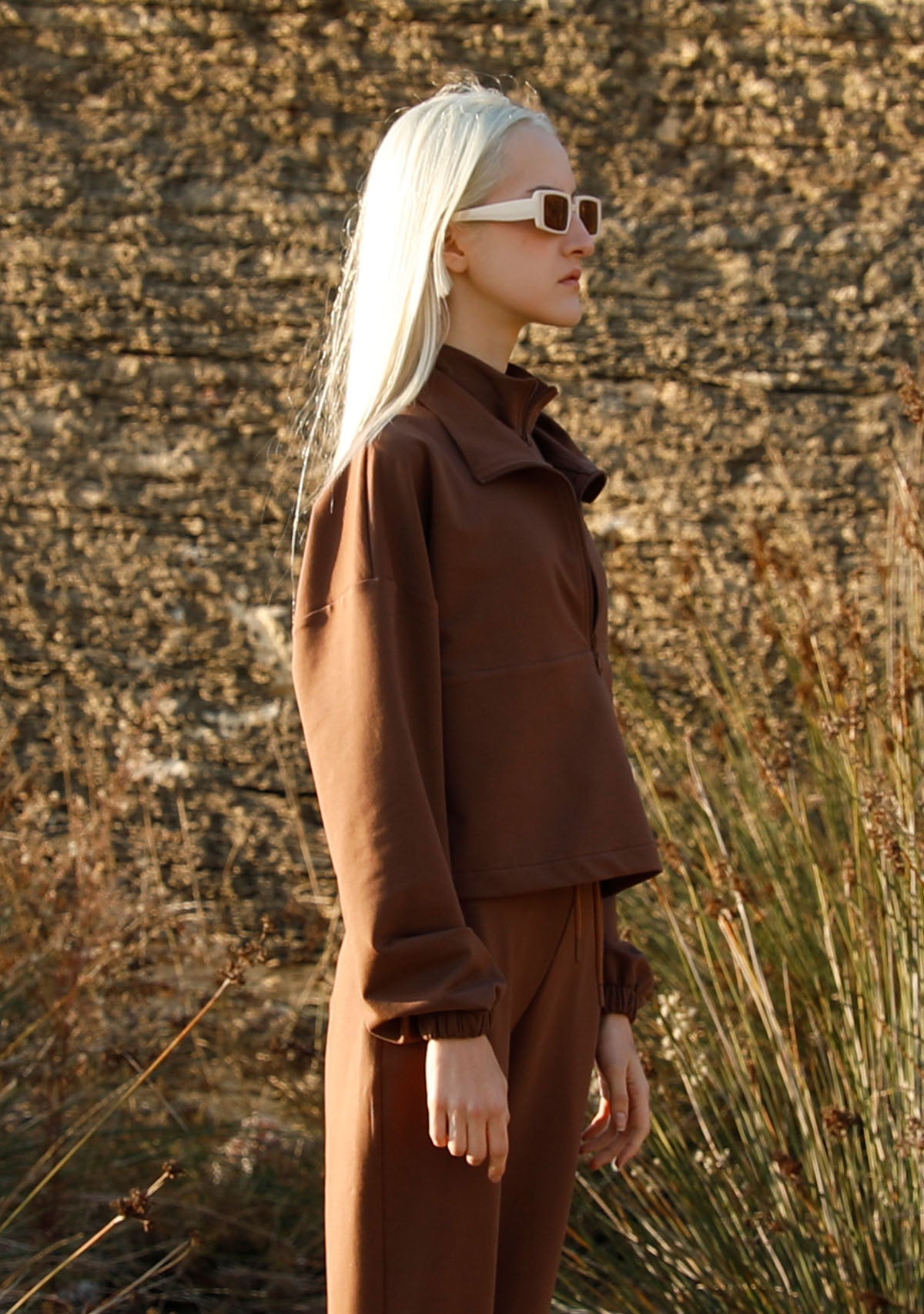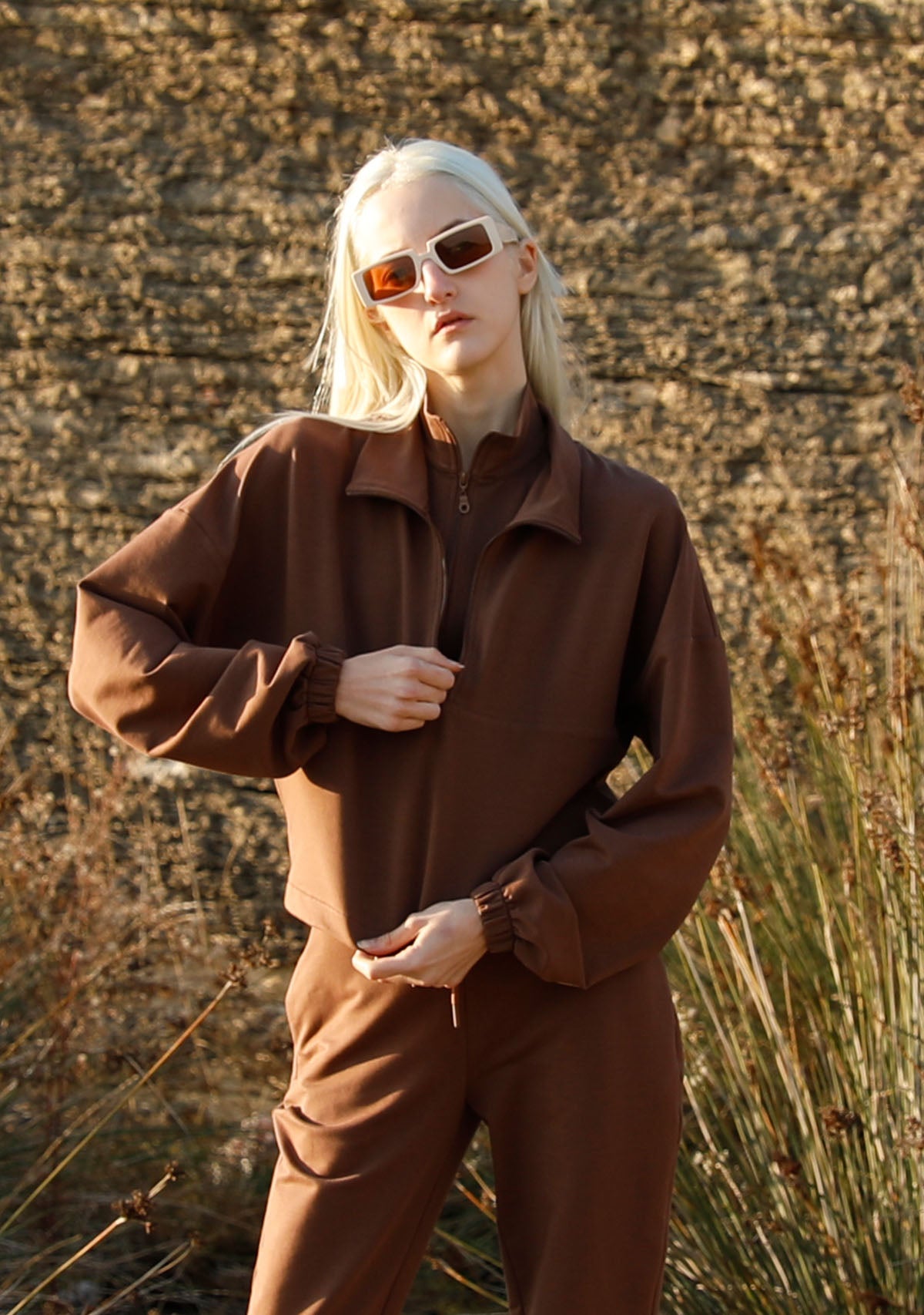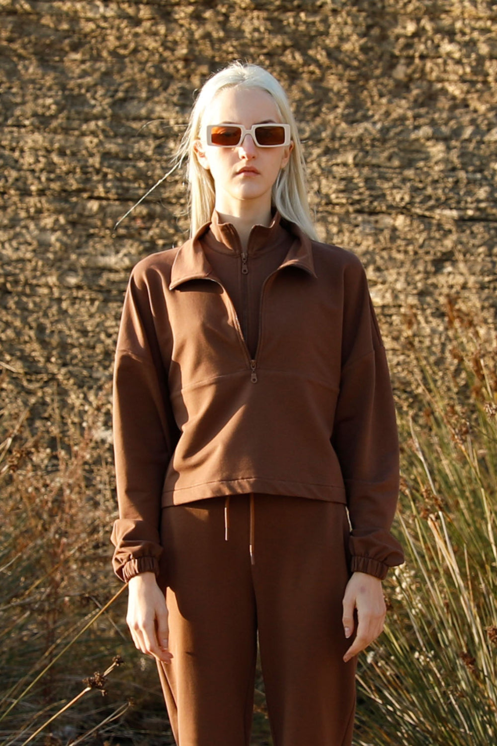 Boğazda Fermuar Detaylı Kahverengi Sweatshirt