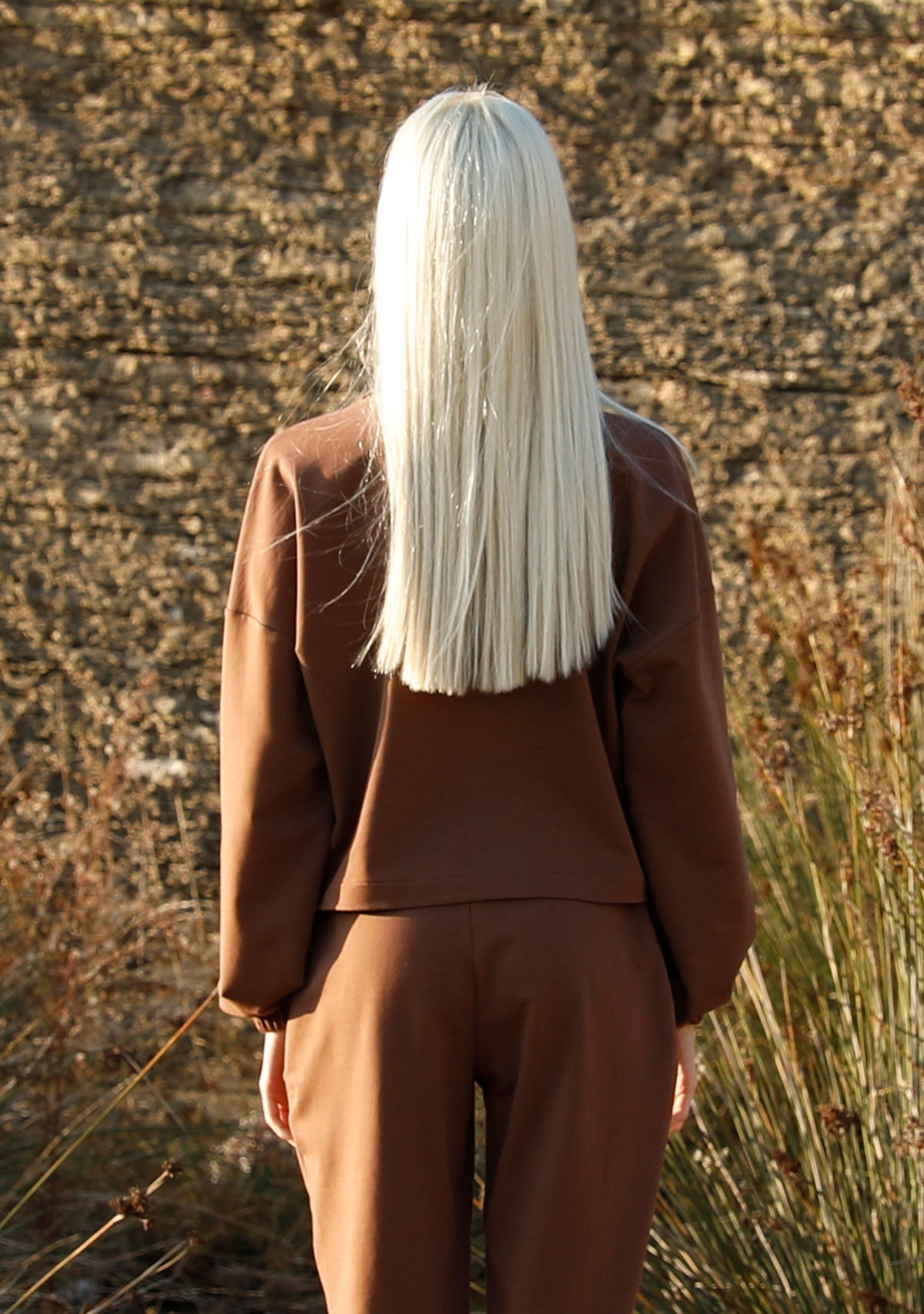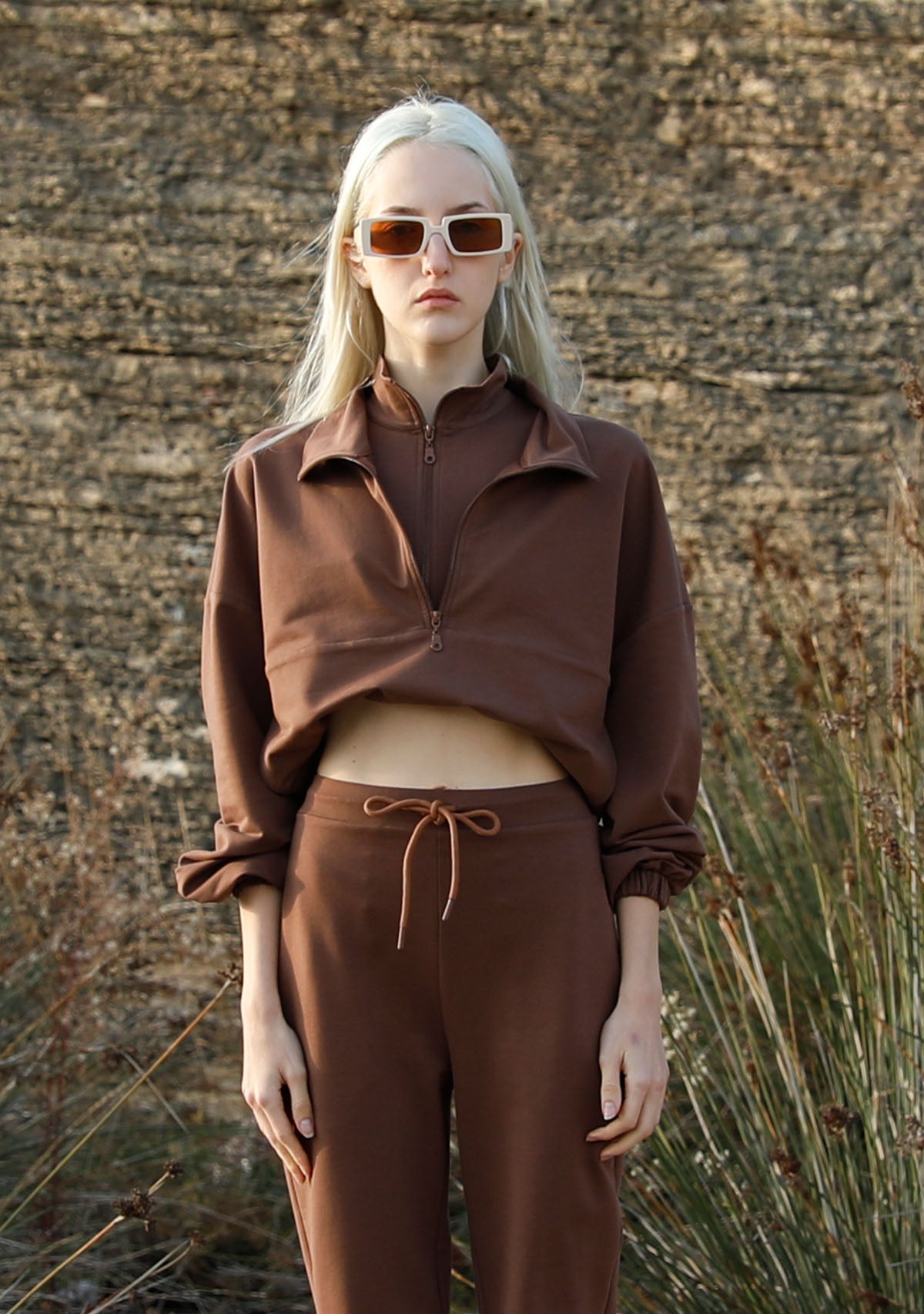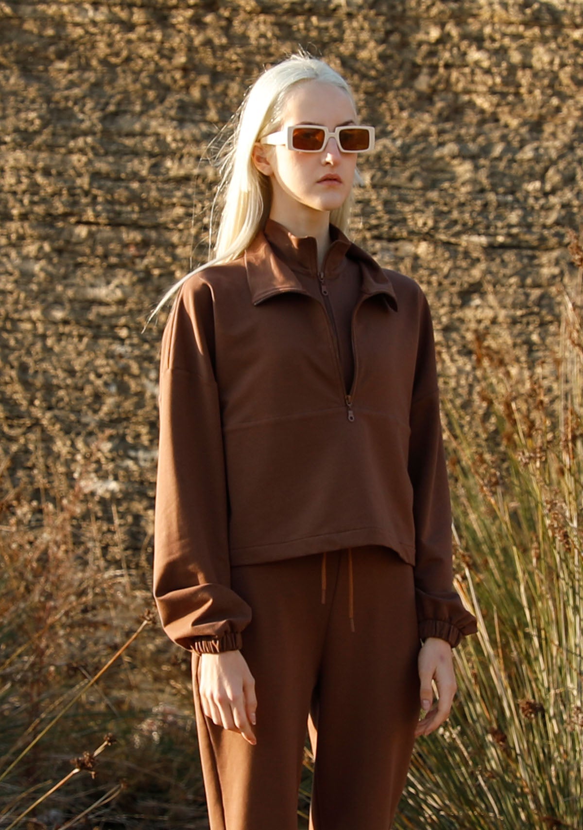 Boğazda Fermuar Detaylı Kahverengi Sweatshirt