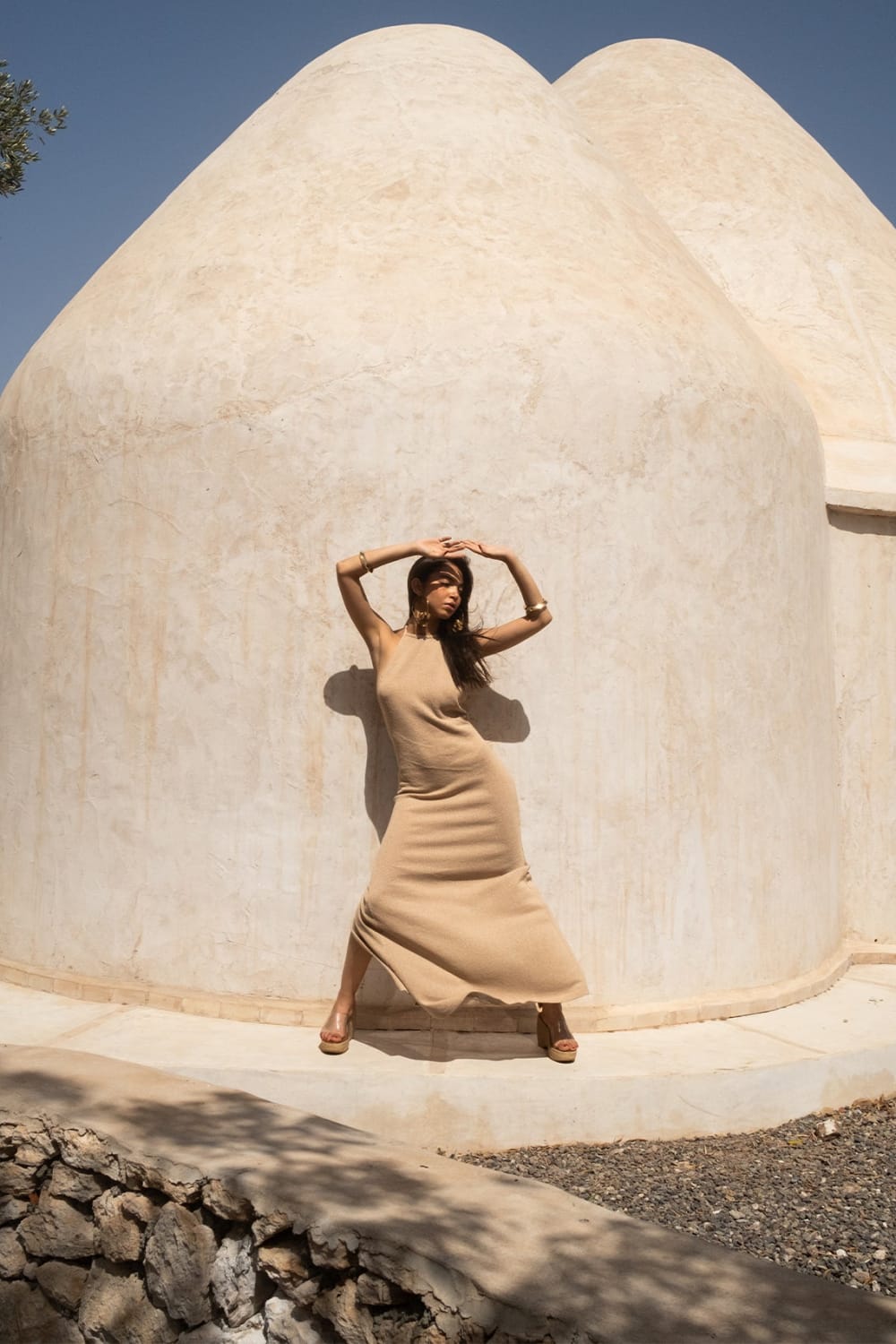 Si Boyundan Bağlamalı Bej Triko Elbise