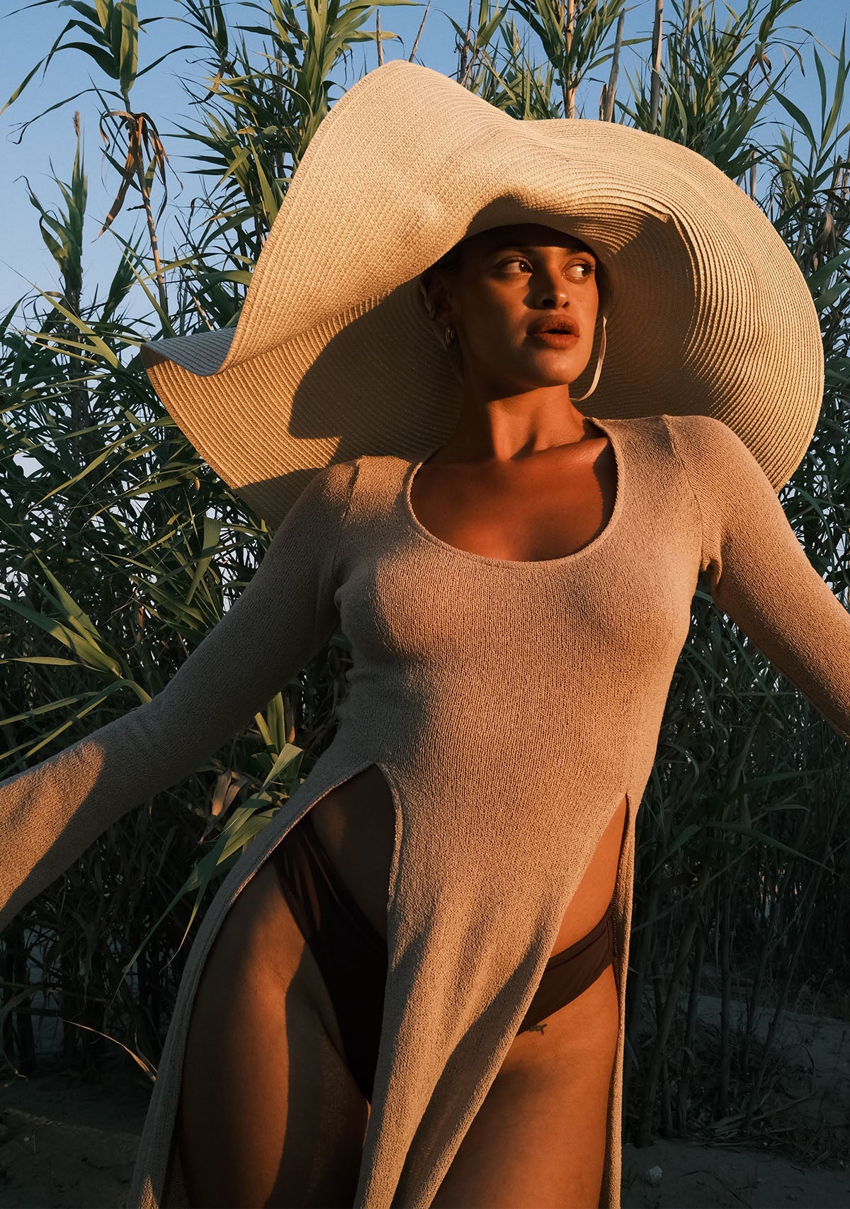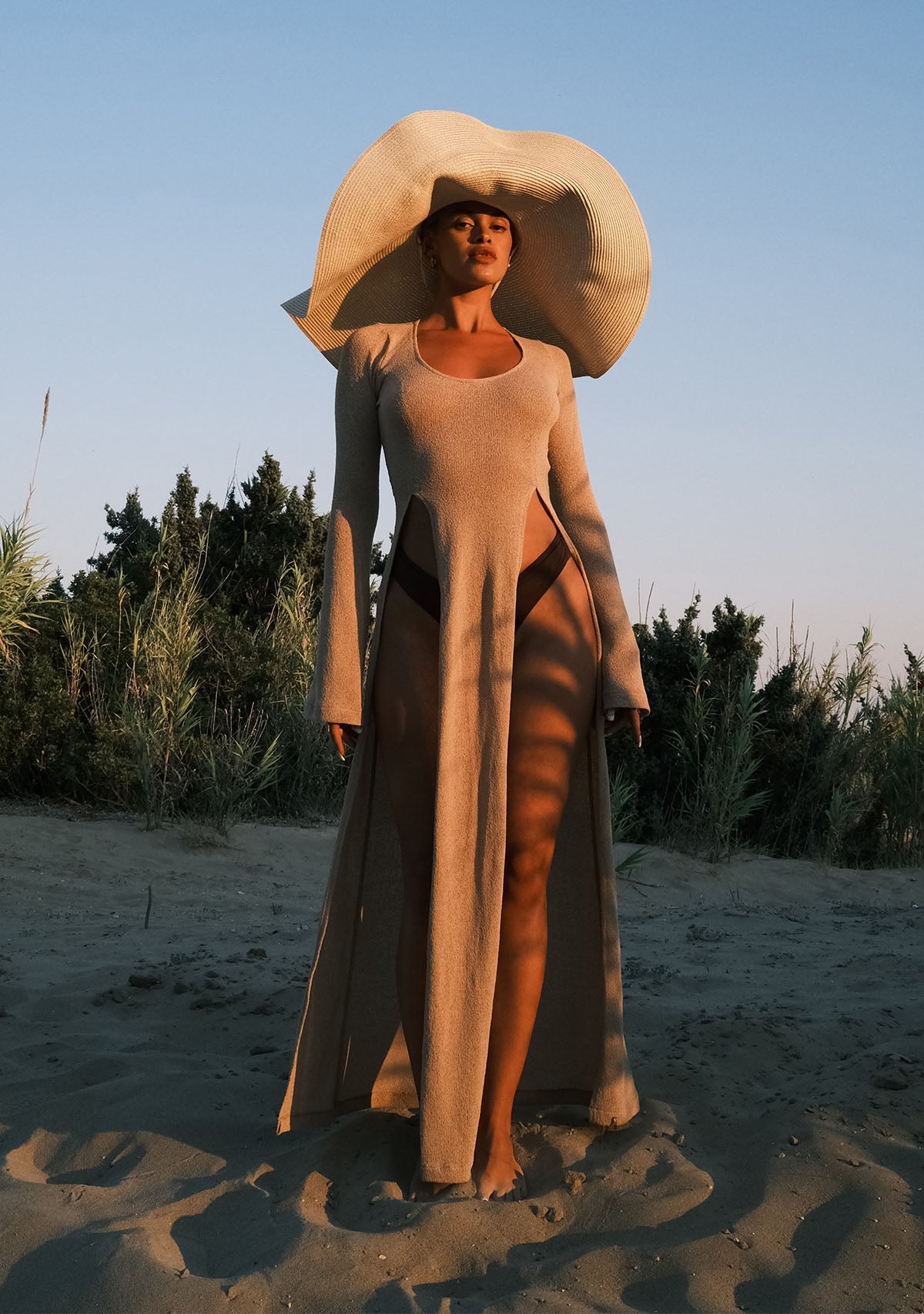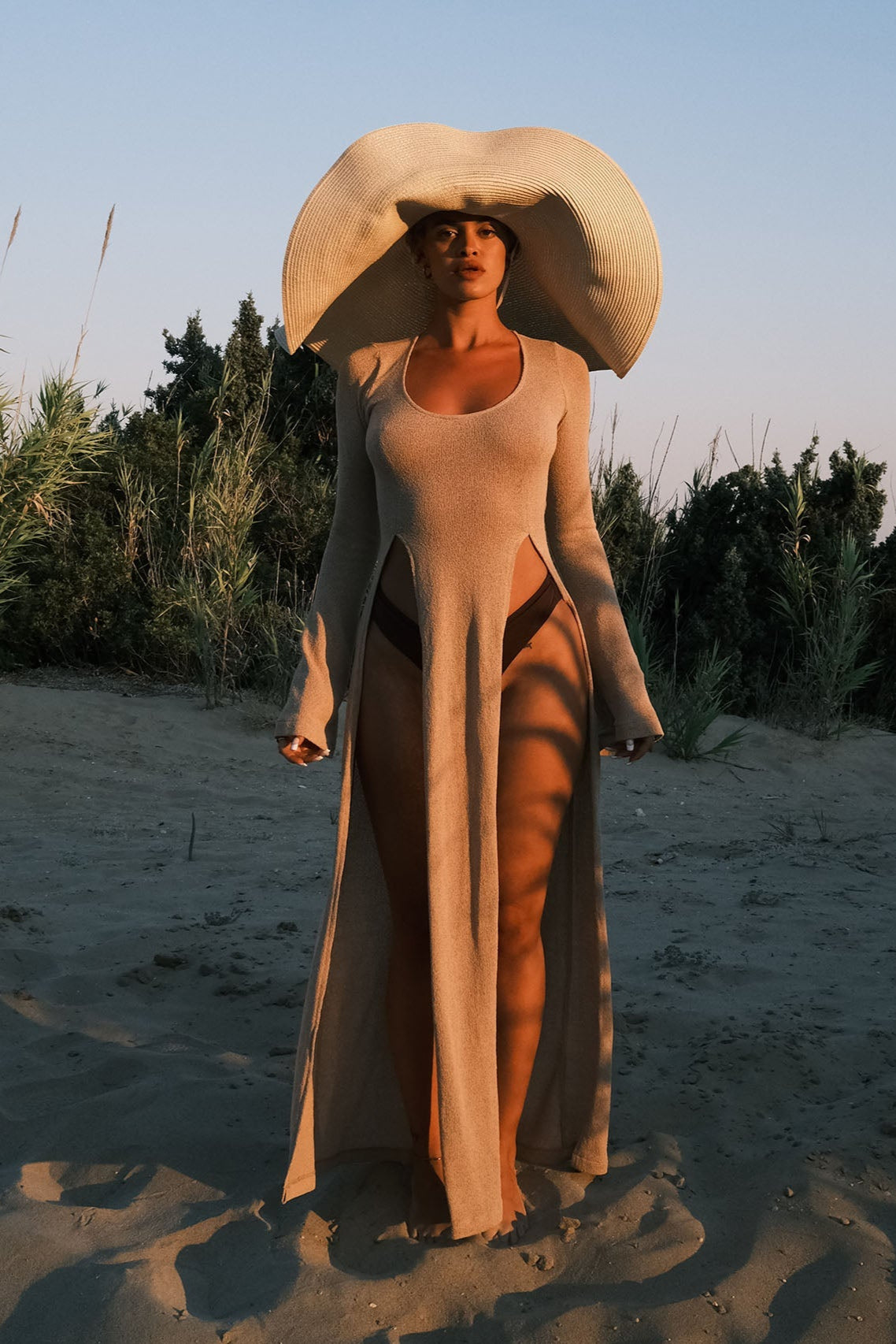 - Derin Yırtmaçlı Bej Triko Elbise Etek kısmında göbeğe kadar uzanan derin yırtmaçlarıyla cesur bir görünüm sunarken, çan şeklinde inen uzun kollarıyla da proporsiyonunuzu dengeler.