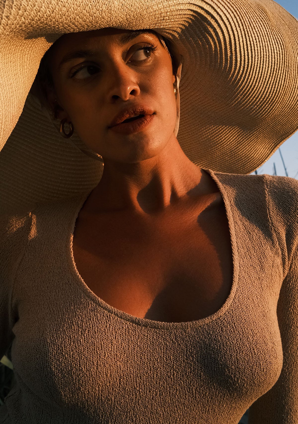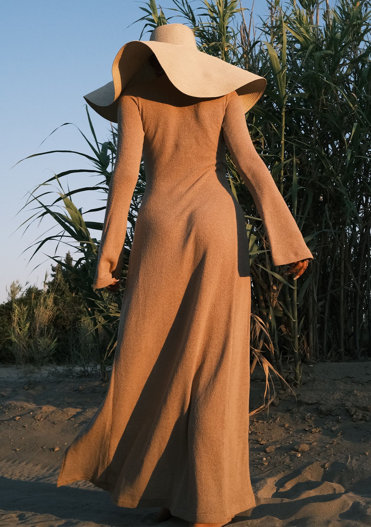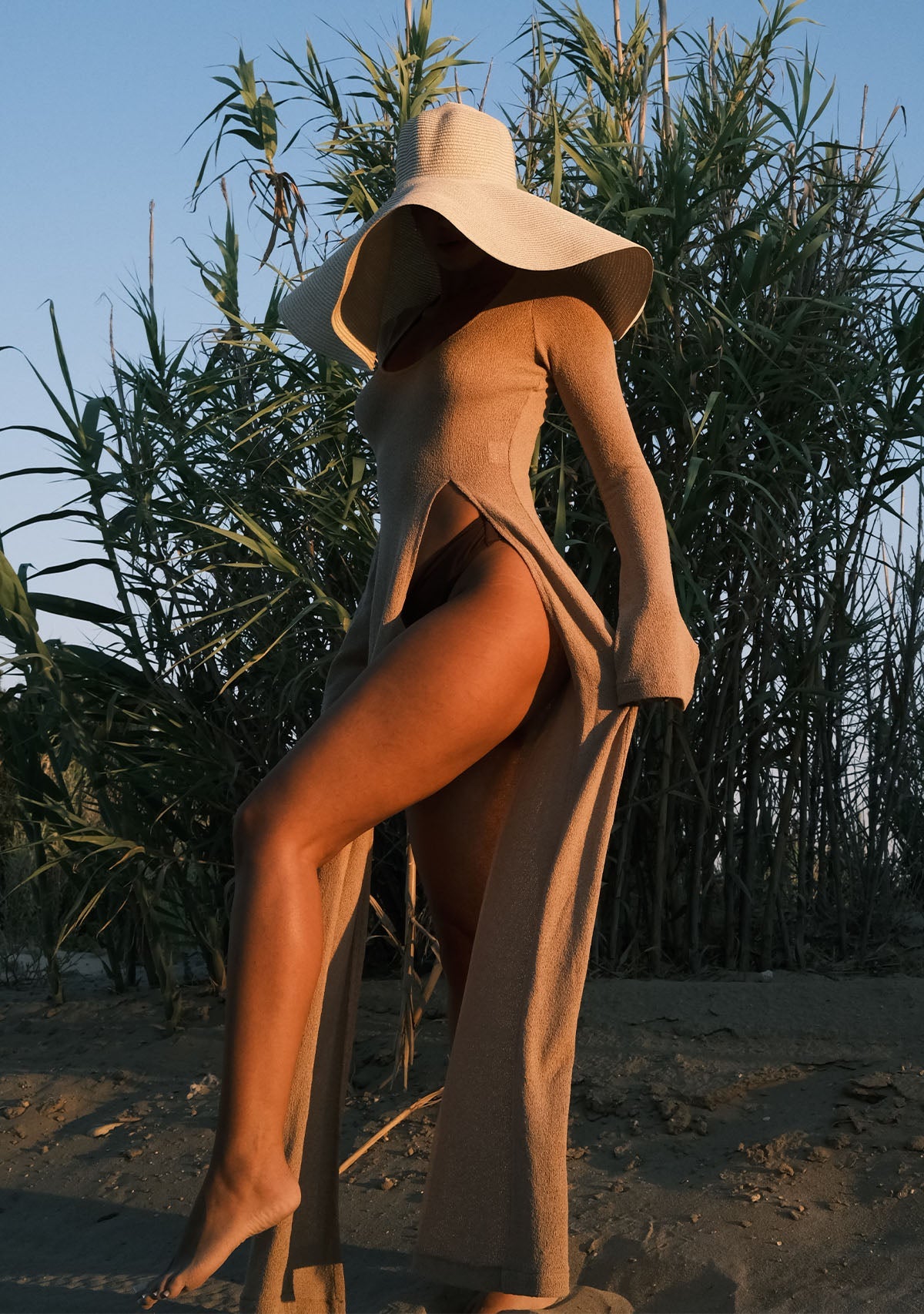 - Derin Yırtmaçlı Bej Triko Elbise Etek kısmında göbeğe kadar uzanan derin yırtmaçlarıyla cesur bir görünüm sunarken, çan şeklinde inen uzun kollarıyla da proporsiyonunuzu dengeler.