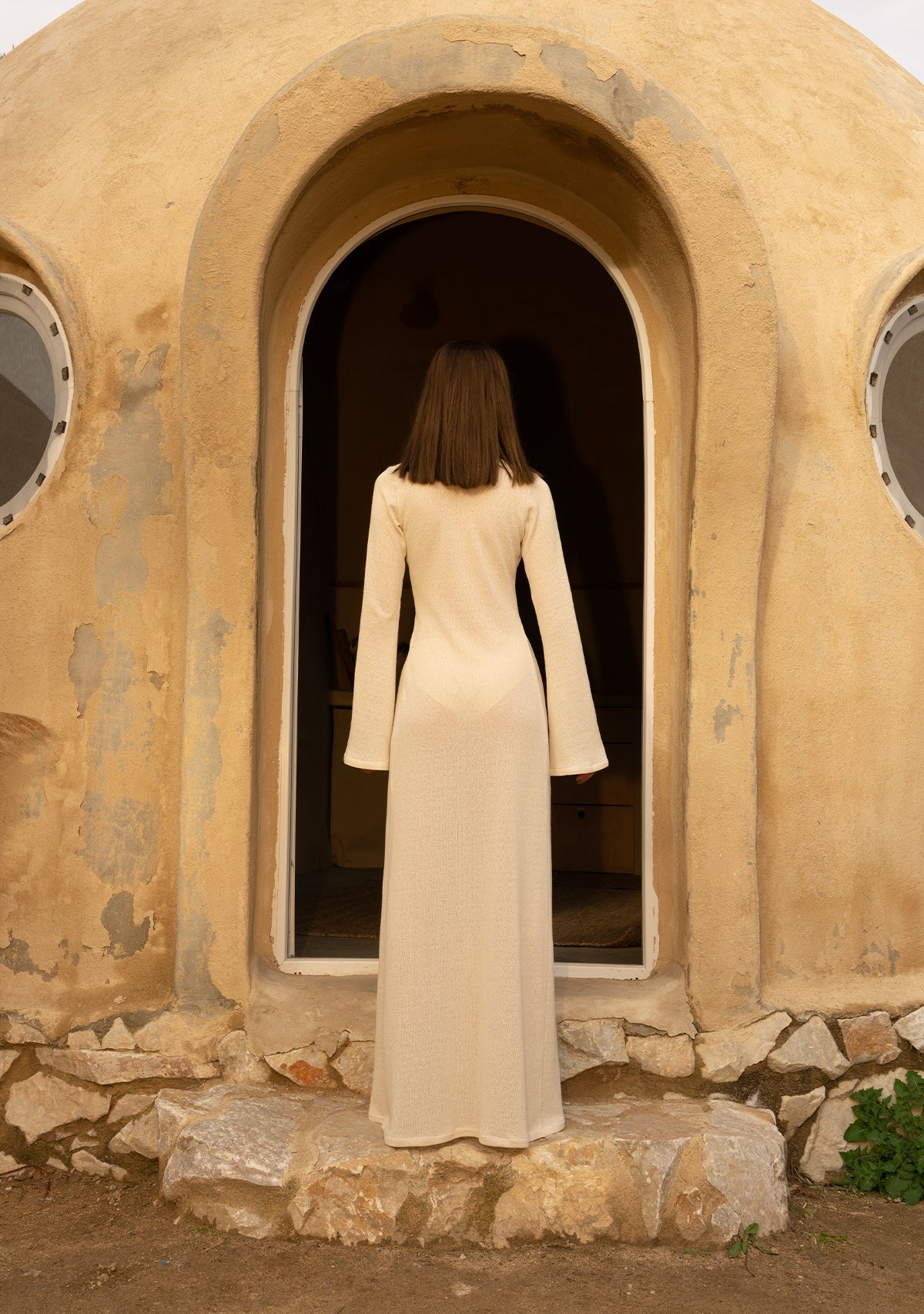 - Derin Yırtmaçlı Krem Triko Elbise Etek kısmında göbeğe kadar uzanan derin yırtmaçlarıyla cesur bir görünüm sunarken, çan şeklinde inen uzun kollarıyla da proporsiyonunuzu dengeler.
