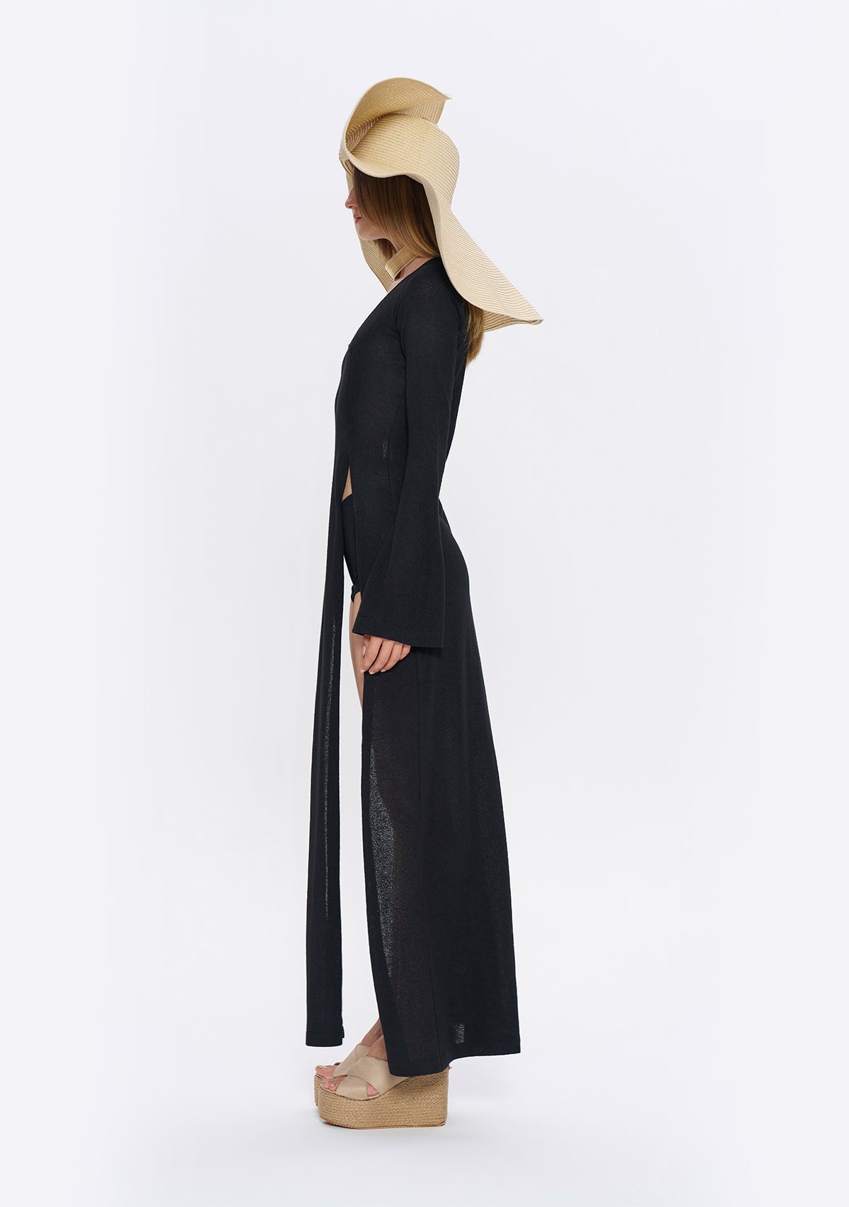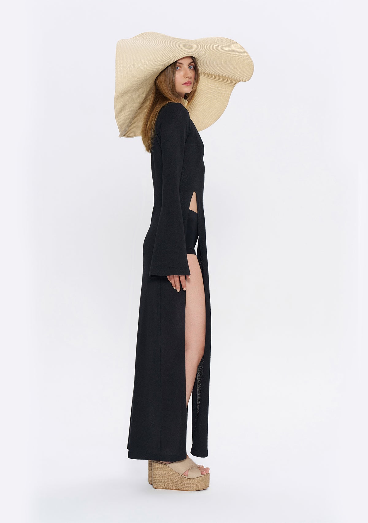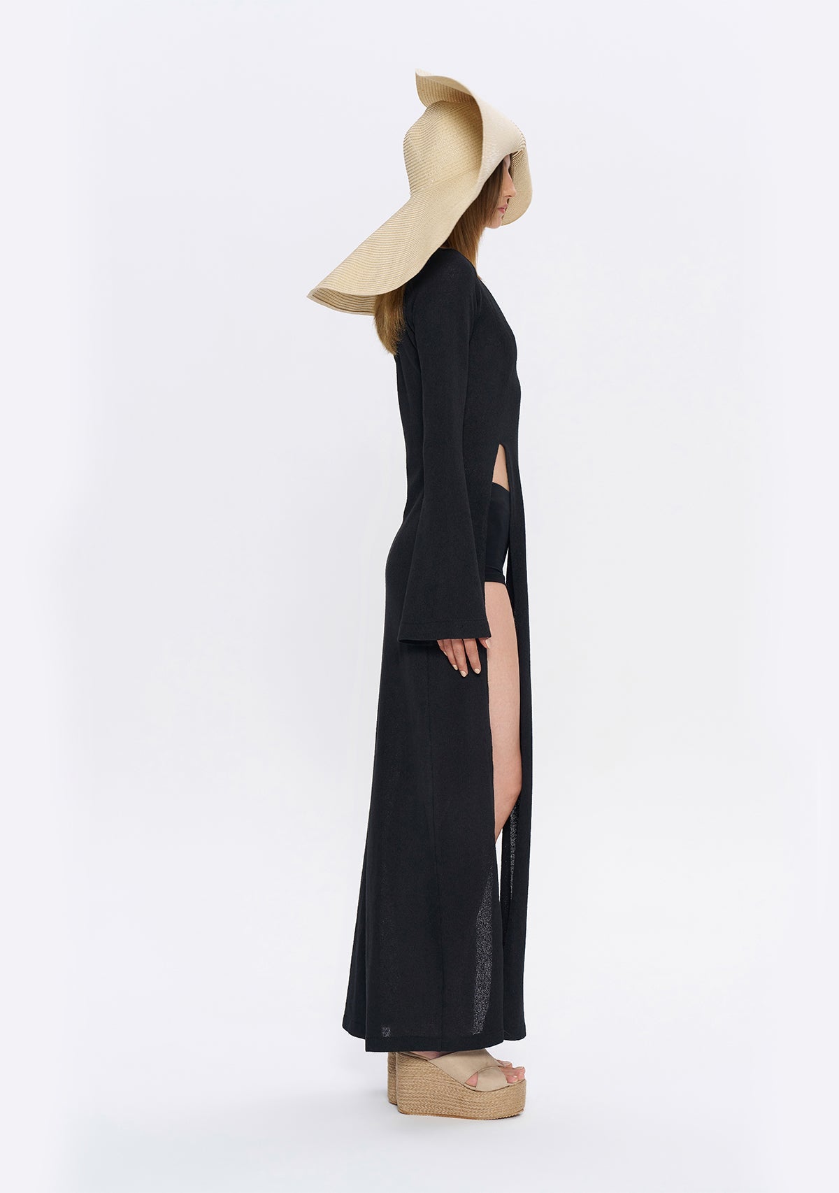 - Derin Yırtmaçlı Siyah Triko Elbise, etek kısmında göbeğe kadar uzanan derin yırtmaçlarıyla cesur bir görünüm sunarken, çan şeklinde inen uzun kollarıyla da proporsiyonunuzu dengeler.