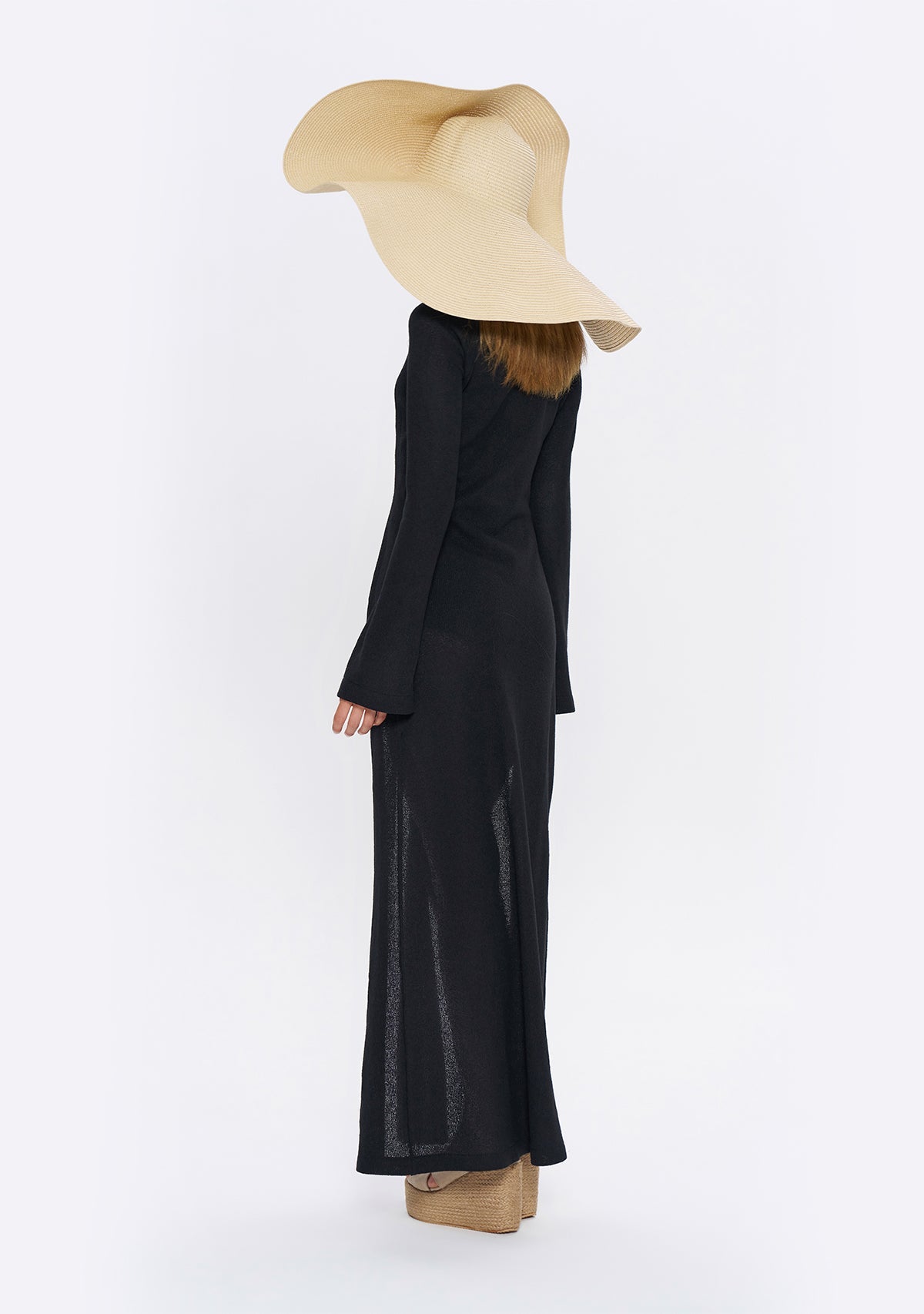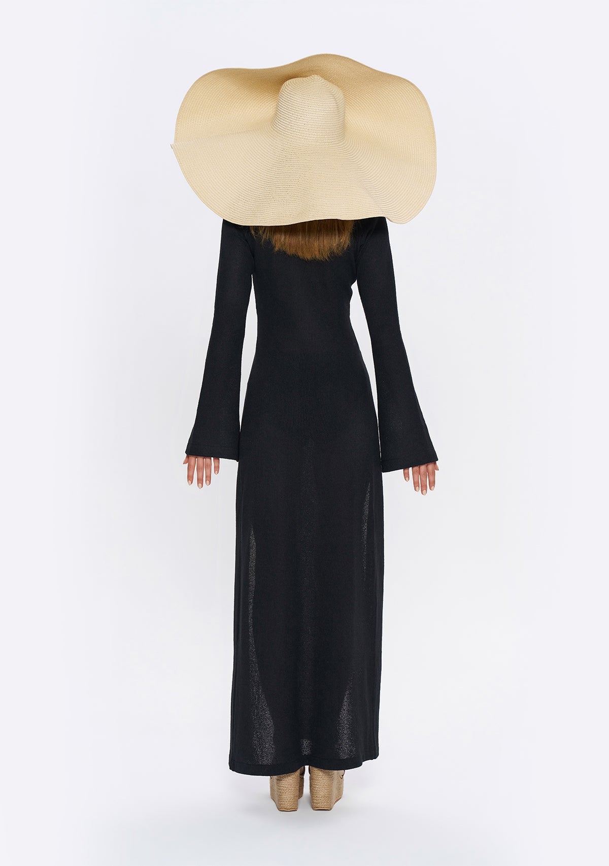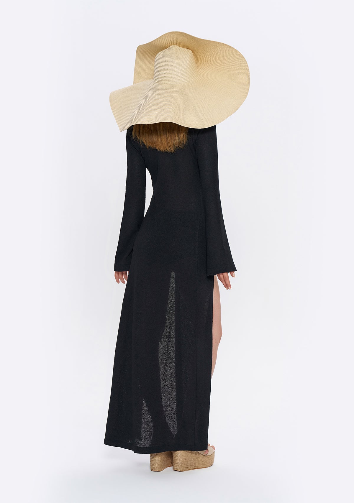 - Derin Yırtmaçlı Siyah Triko Elbise, etek kısmında göbeğe kadar uzanan derin yırtmaçlarıyla cesur bir görünüm sunarken, çan şeklinde inen uzun kollarıyla da proporsiyonunuzu dengeler.