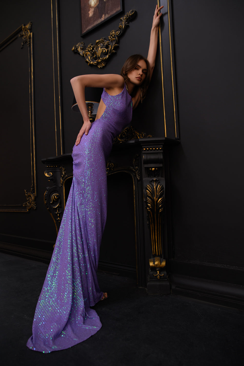 Lila Payetli Sırt Dekolteli Kuyruk Detaylı Uzun Elbise