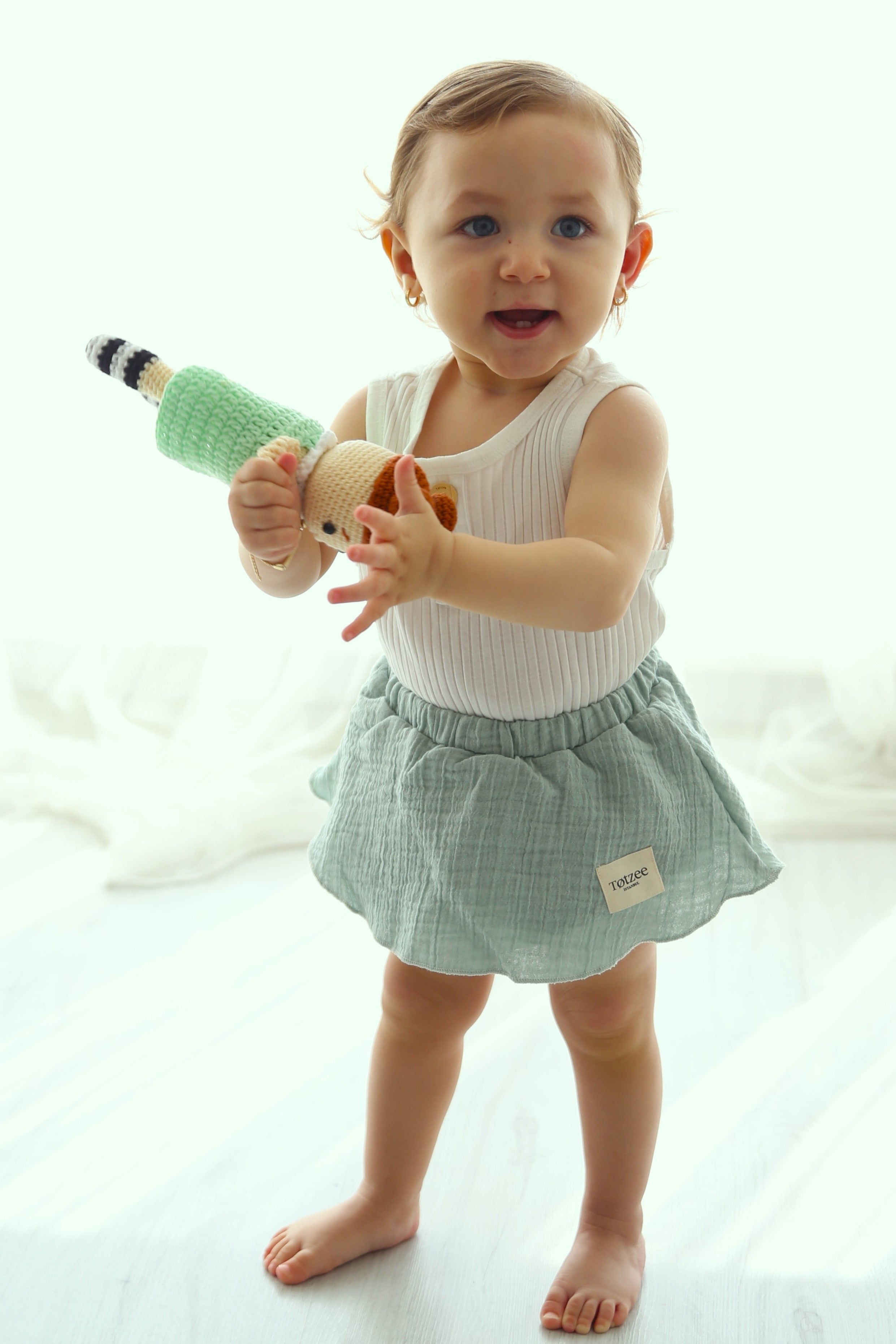 Kız bebek için tasarlanan bu özel Müslin Etekli Şort, hem şıklığı hem de konforu bir araya getiriyor. Müslin kumaşın doğal, hafif ve nefes alabilir yapısı sayesinde bebeğiniz yaz sıcaklarında bile rahat ederken, etek detayı ile birlikte şık bir görünüm kazanıyor. Her anını özel kılan minik prensesler için ideal bir seçim olan bu şort, bebeğinizin cildini korurken ona hareket özgürlüğü de sunar.