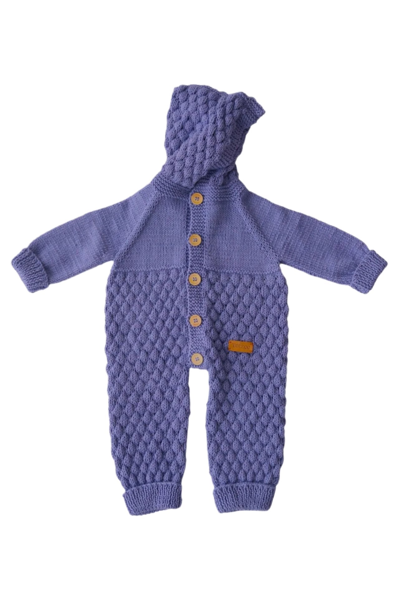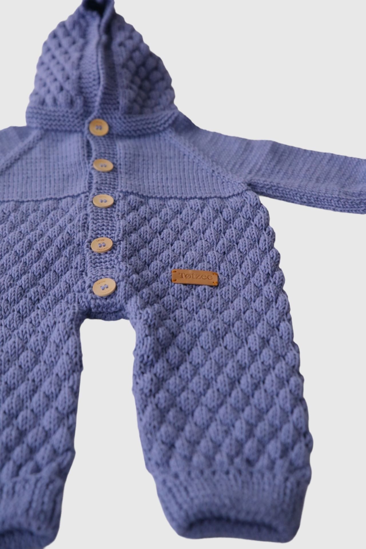 Organik El Örgüsü Kapüşonlu Önden Düğmeli Tulum Orkide Mavisi