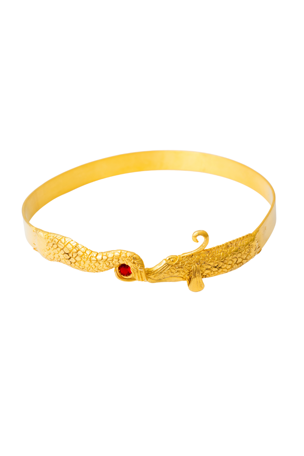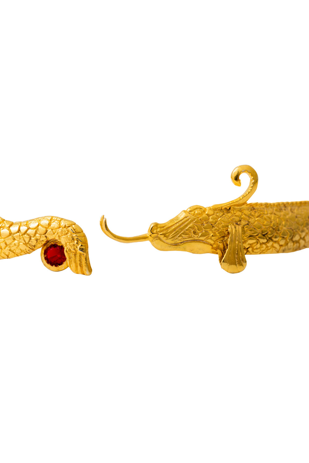 Her bir parça, özenle arıtılmış bronzdan üretilmiş ve ışıltılı, parlak bir görünüm için 24 ayar altın kaplama ile tamamlanmıştır. Lal taşı kullanılmıştır.
