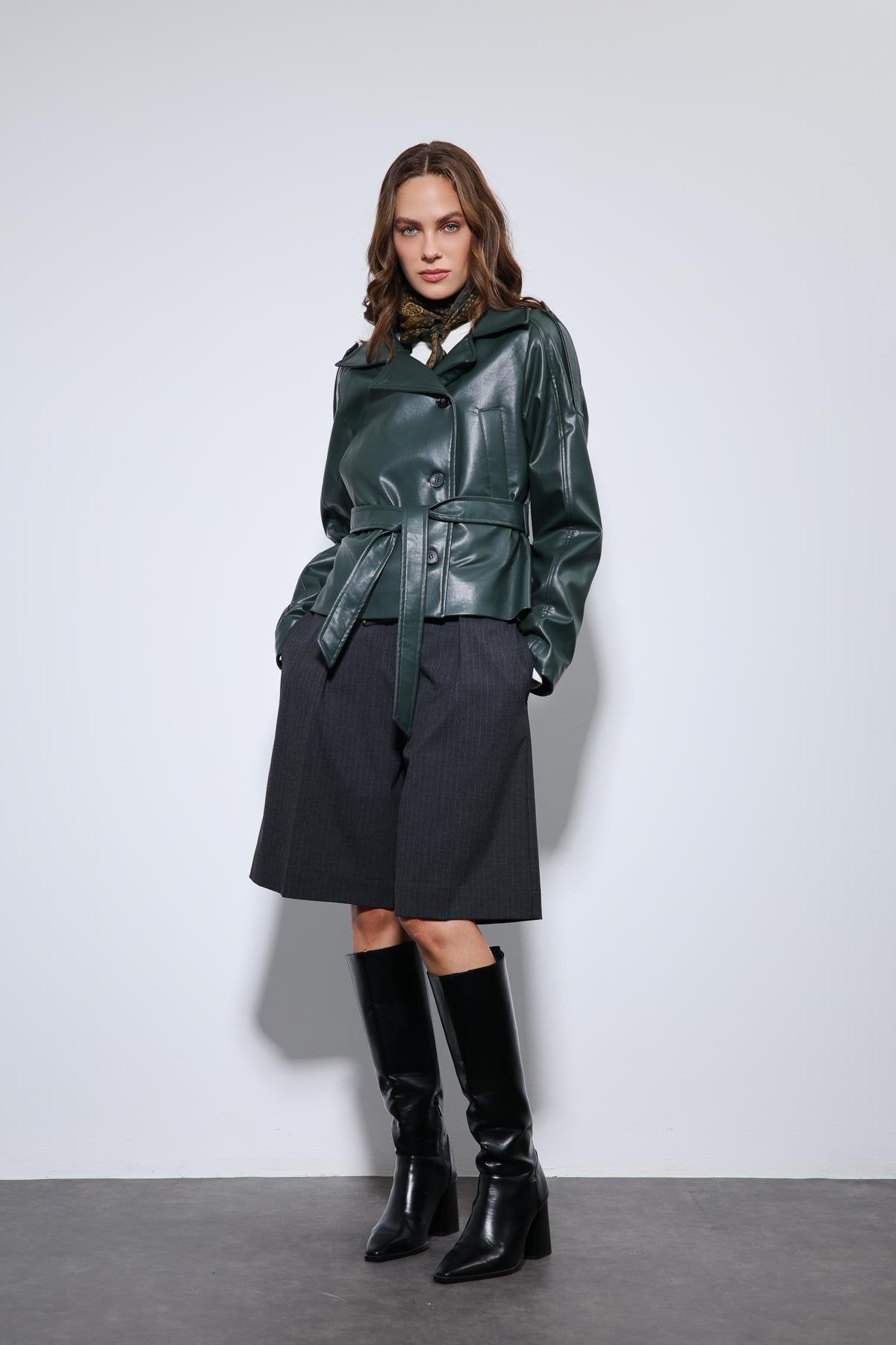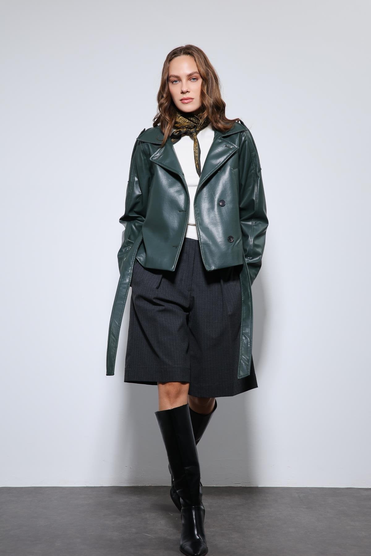 Modern kesimi ve şık suni deri dokusuyla öne çıkan bu mont, bel kısmındaki kemer detayıyla form kazandırır. Sezon boyunca hem şehir stiline hem de günlük kombinlere güçlü bir görünüm ekler. Minimal tasarımı sayesinde farklı parçalarla kolayca uyum sağlar.