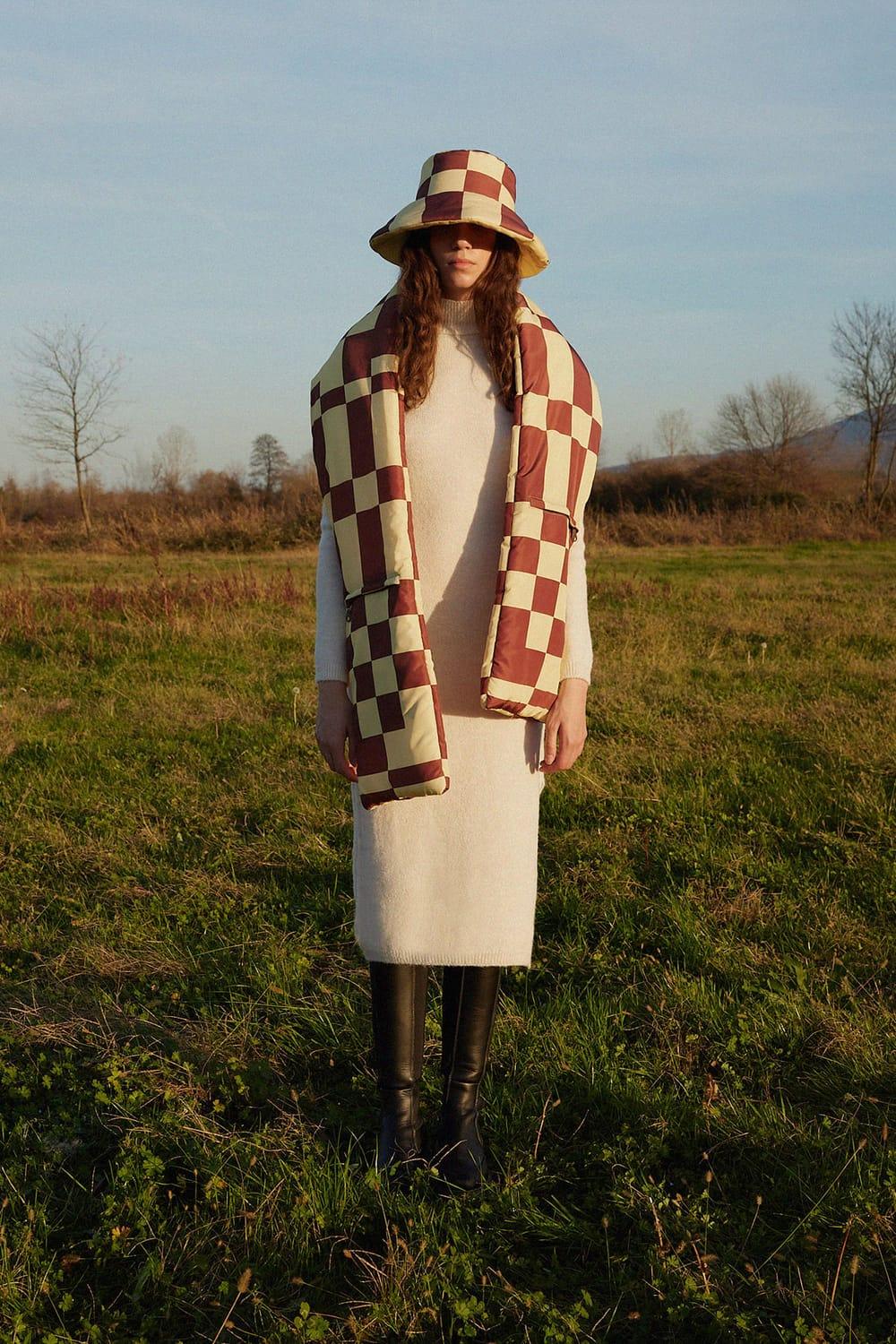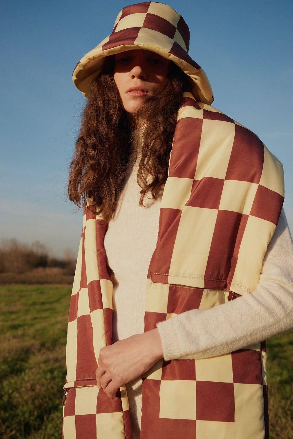 Cosmic Distortion Brown & Yellow Checker Pattern Puffer Hat
