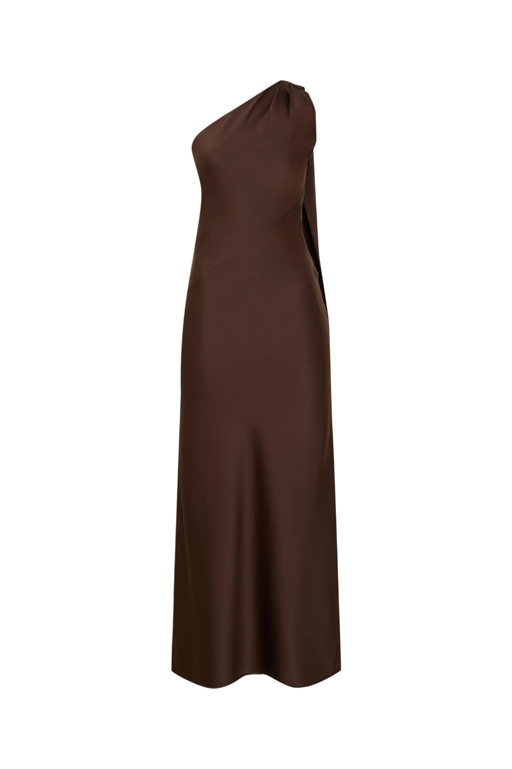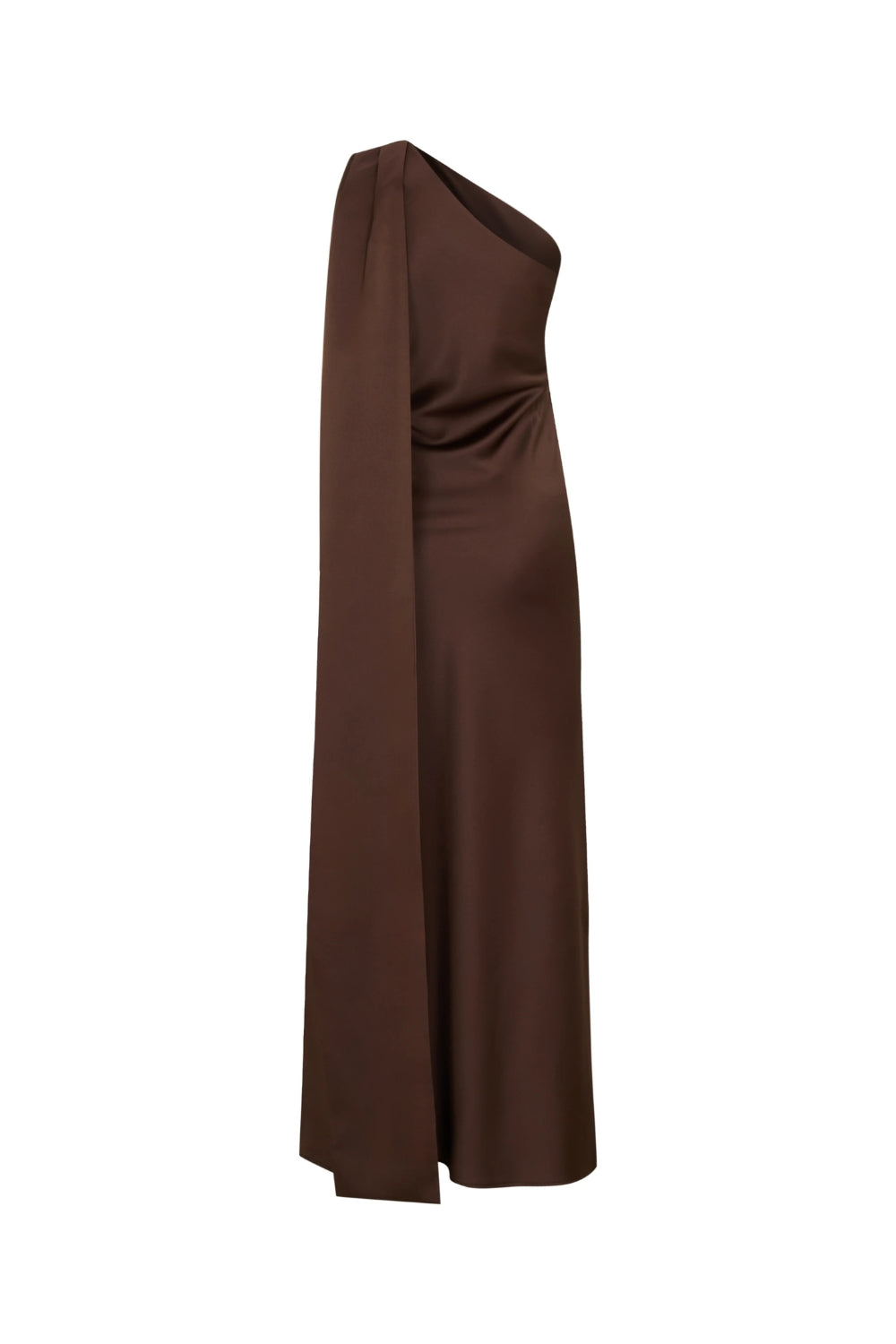 Acı Kahve Şal Detaylı Tek Omuz Maxi Saten Elbise