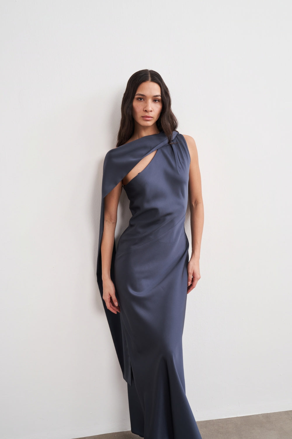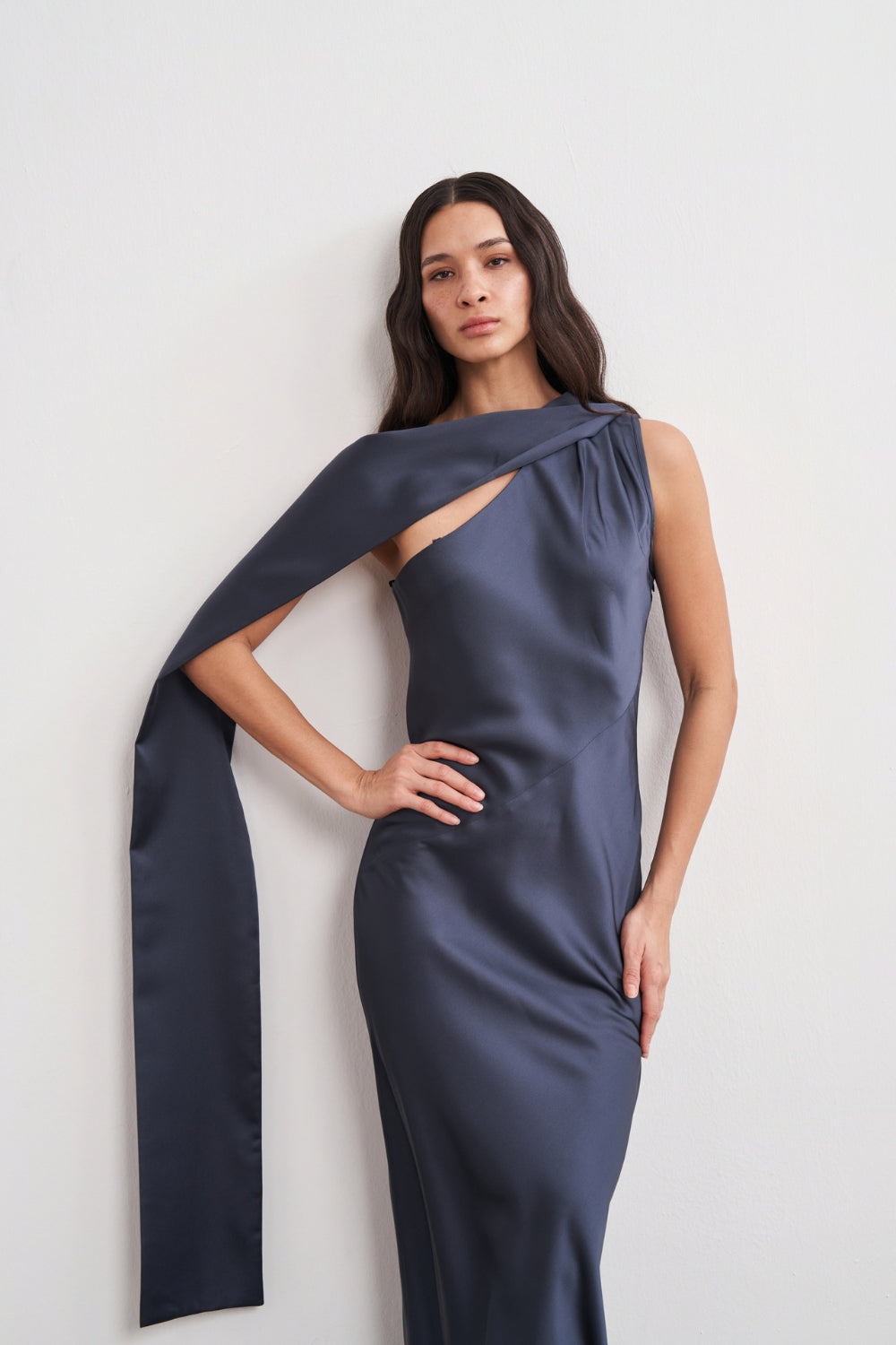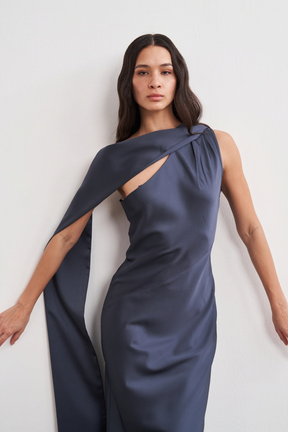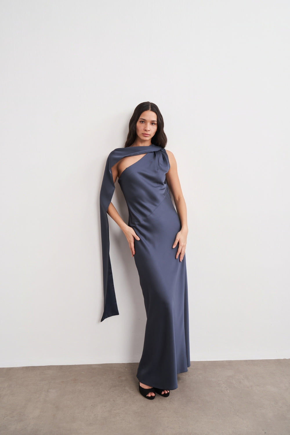 WINGCOTT Şal Detaylı Tek Omuz Maxi Saten Elbise