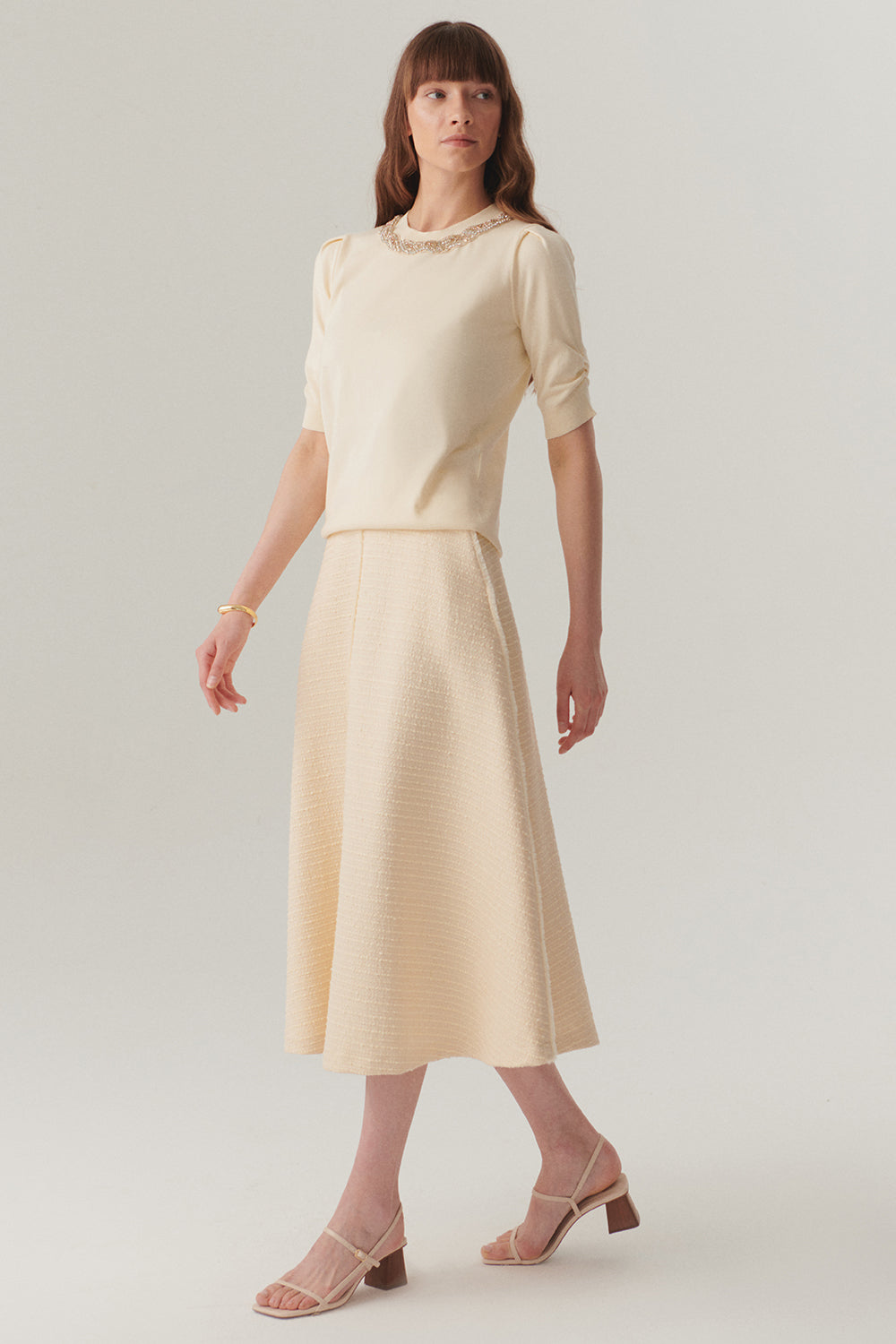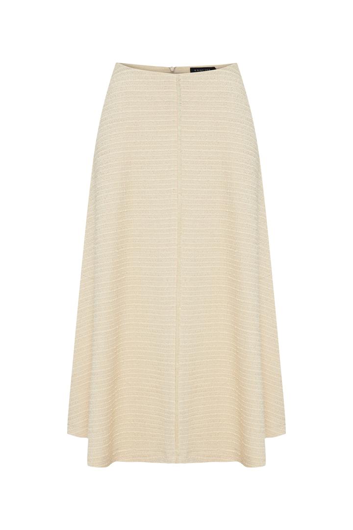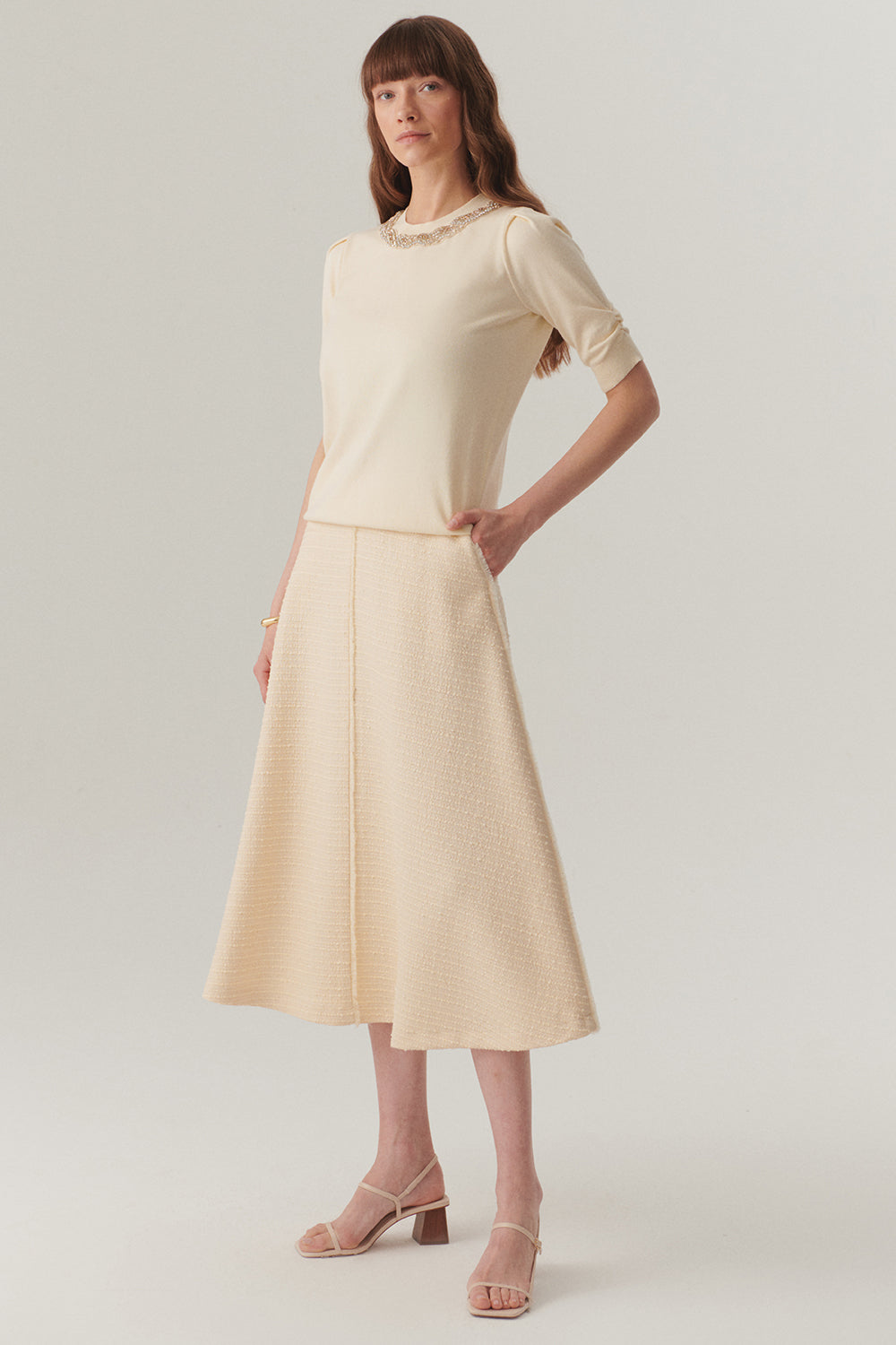 Ekru Renk Dokulu Kumaş Diz Altı Kloş Etek
