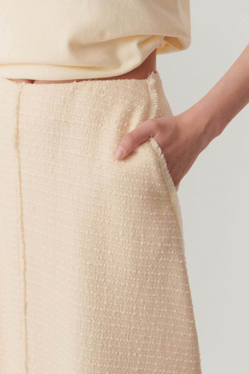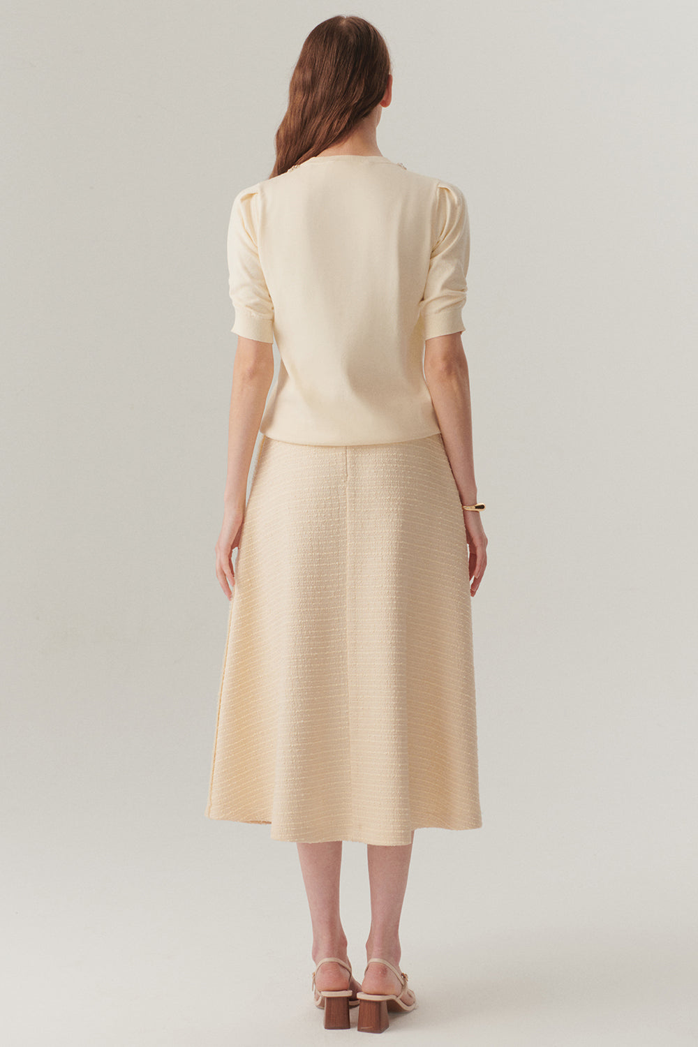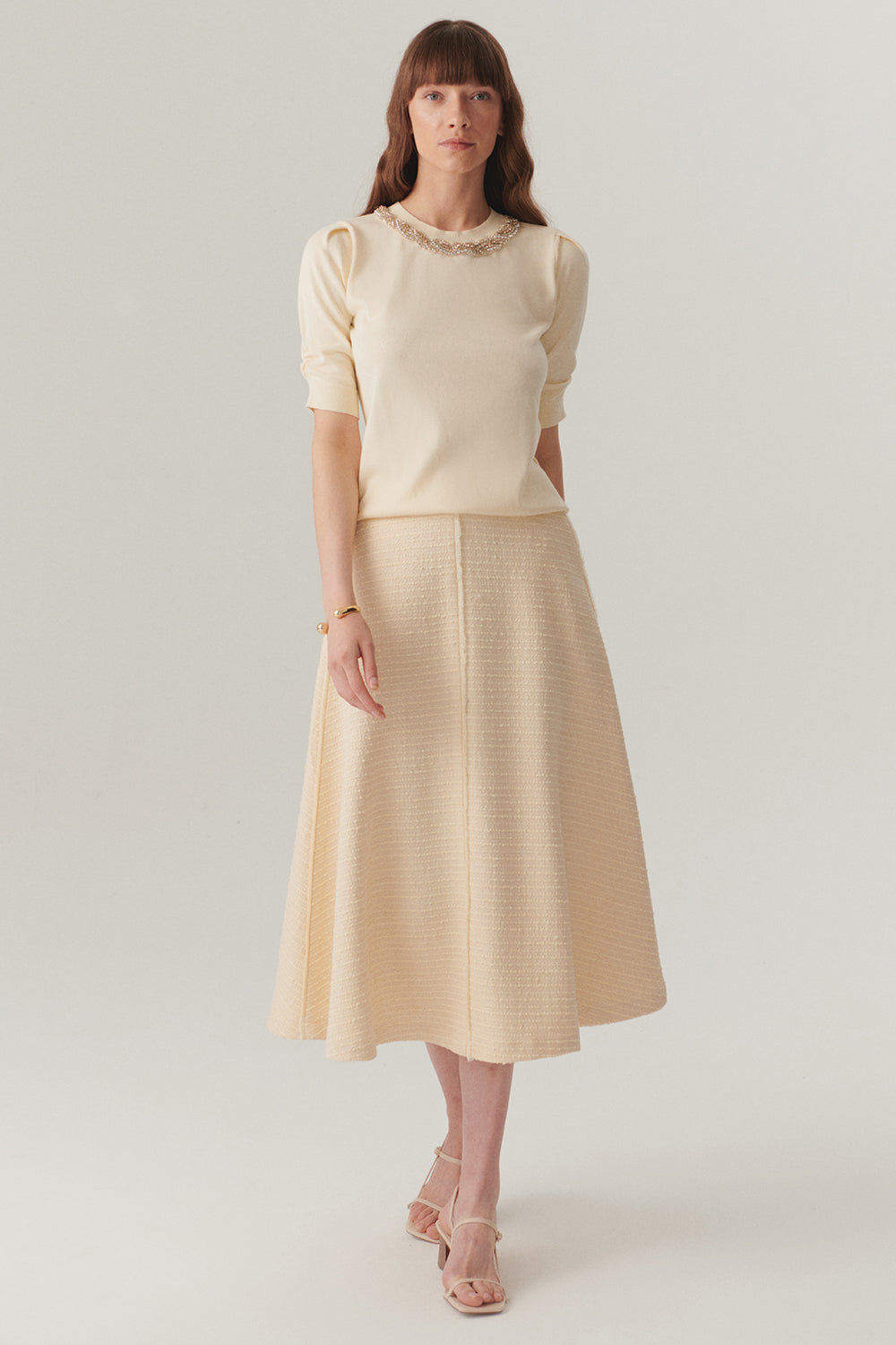 Ekru Renk Dokulu Kumaş Diz Altı Kloş Etek