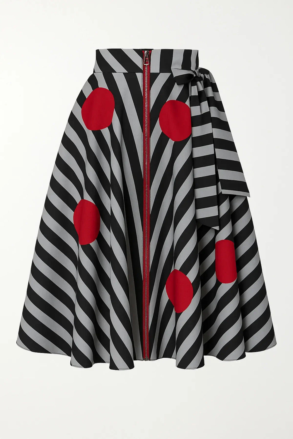 Kuşakla Bağlama Detaylı & Puantiyeli Yüksek Bel Çizgili İpek Tafta Etek