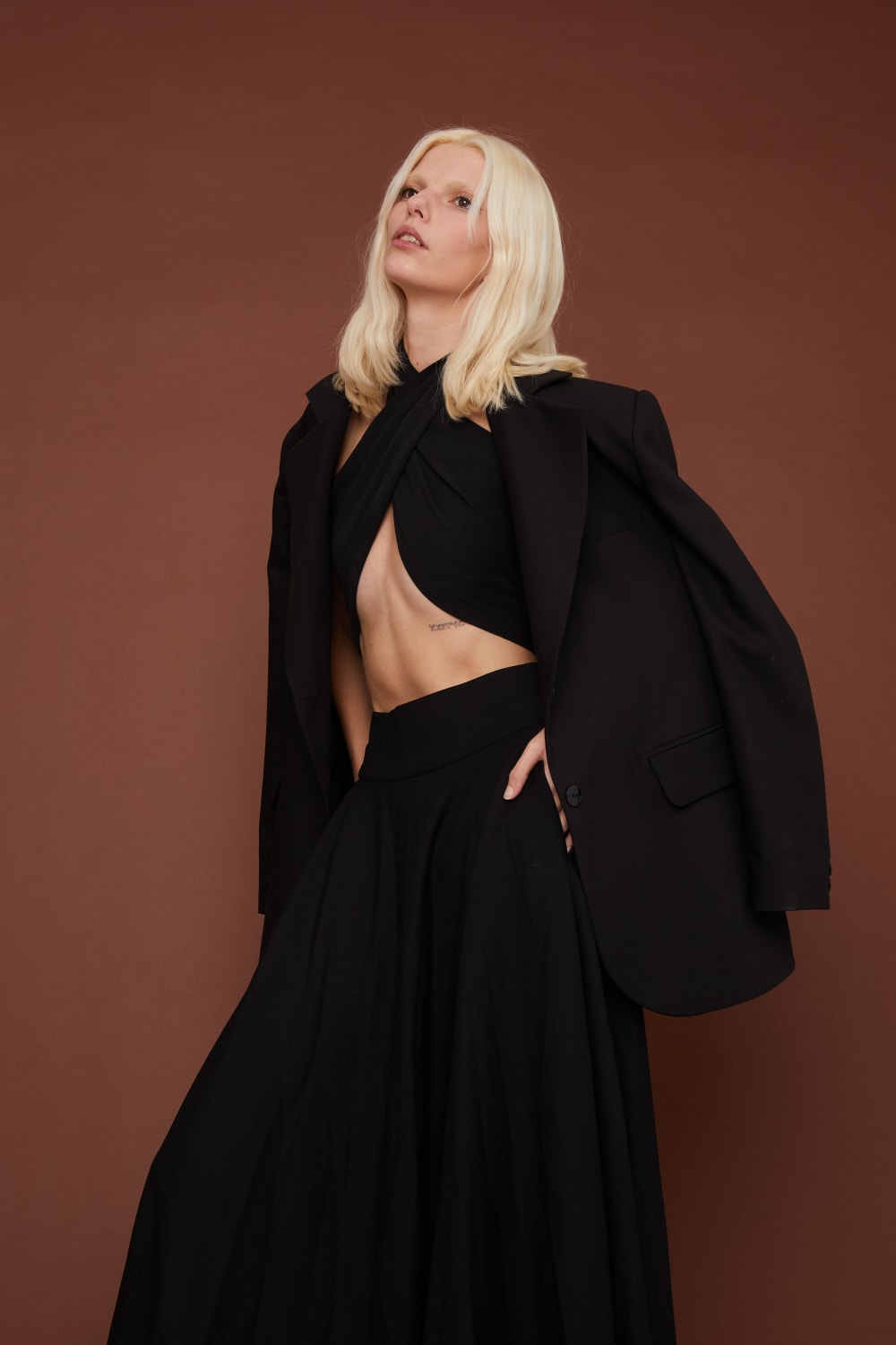 Maksi boy, yüksek bel, gizli cep detaylı, yırtmaçlı etek.