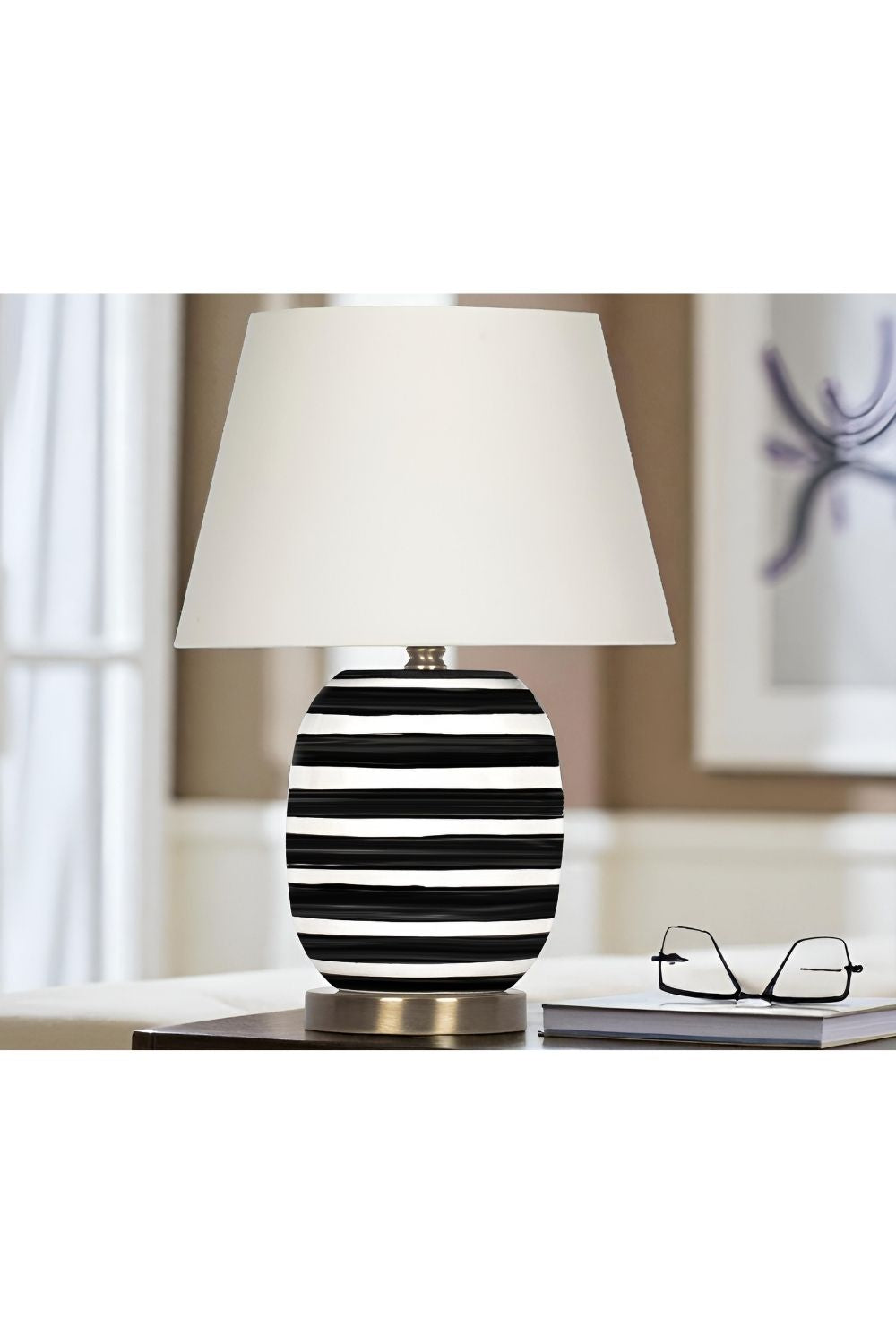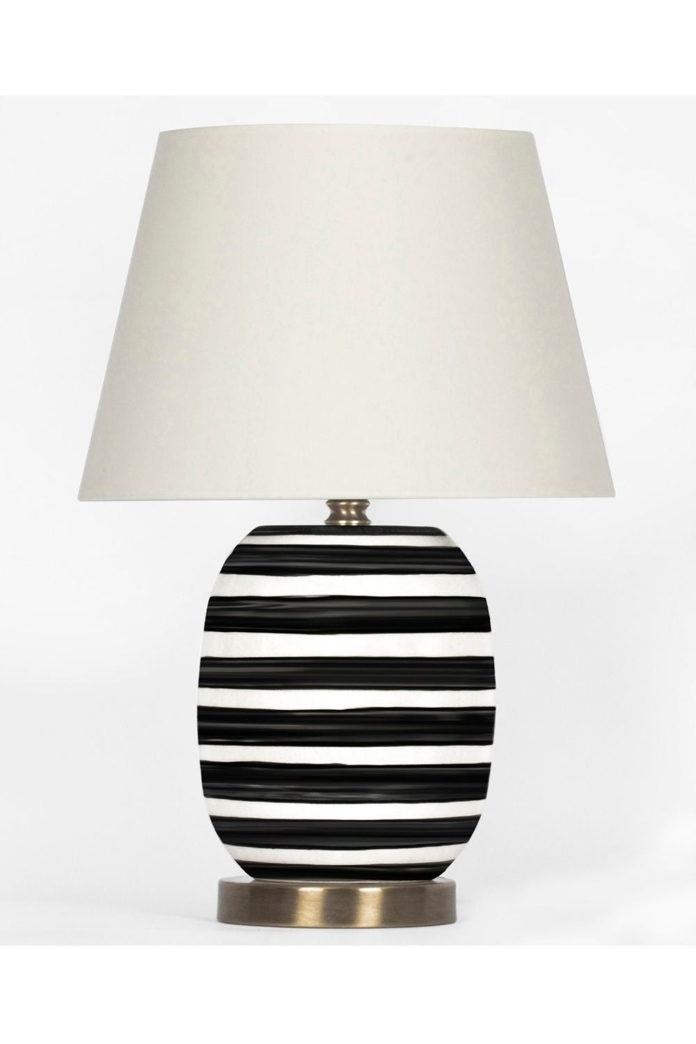 Siyah-beyaz çizgili seramik gövdesi, sade siyah kumaş abajuruyla birleşerek hem