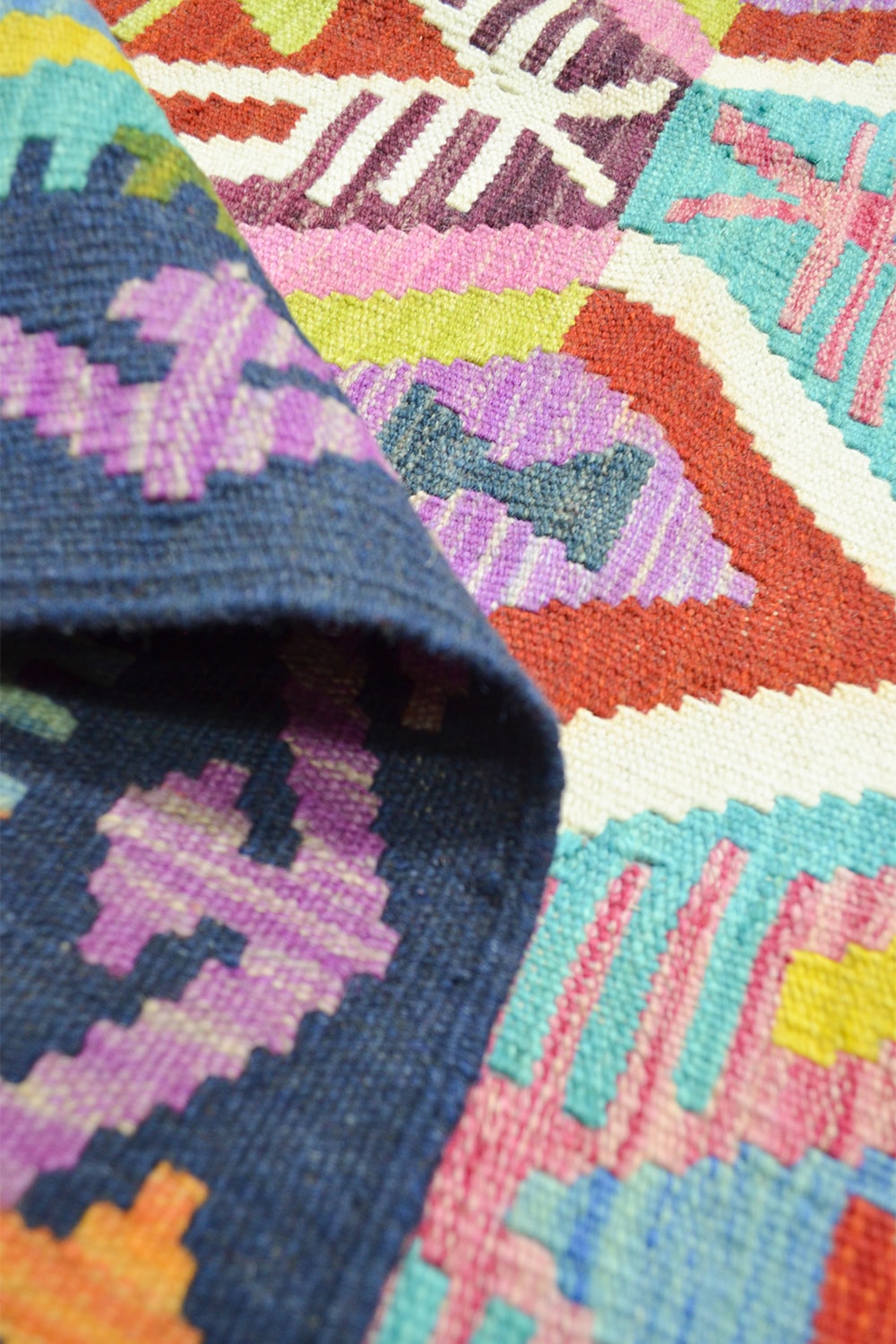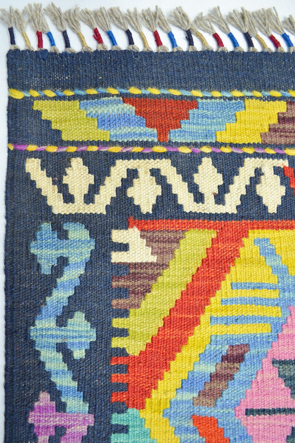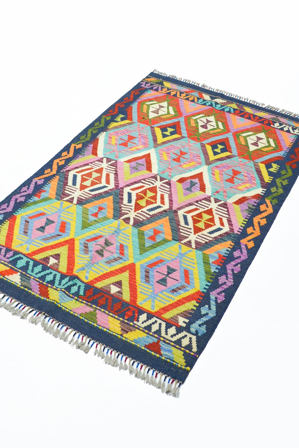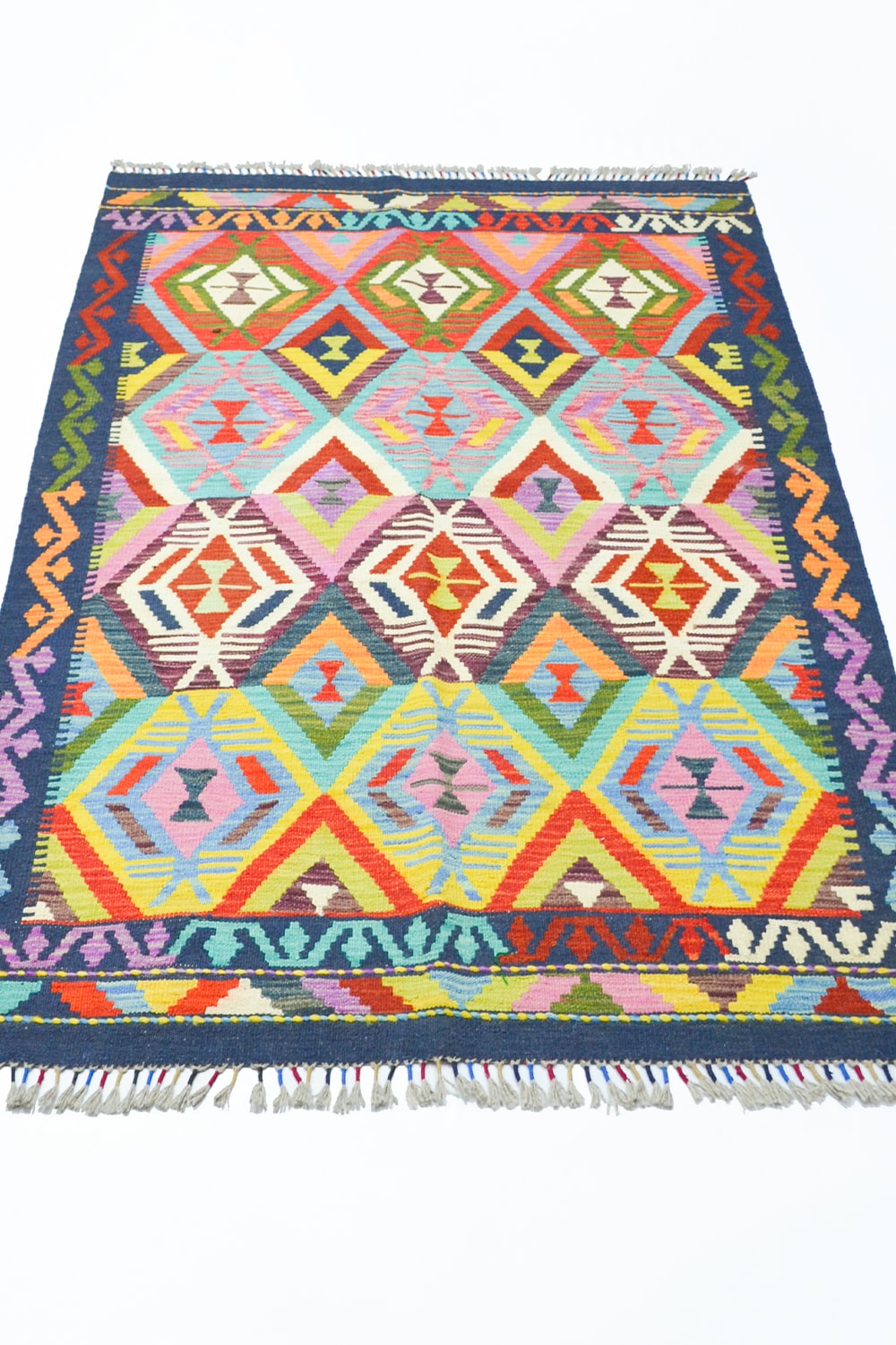 Afganistan’ın köklü dokuma geleneğini yansıtan bu el dokuma kilim, 121x178 cm (2.15 m²) ölçülerindedir. %100 yünden üretilen kilim, canlı ve çok renkli tasarımıyla mekânlara hareket ve enerji katar.