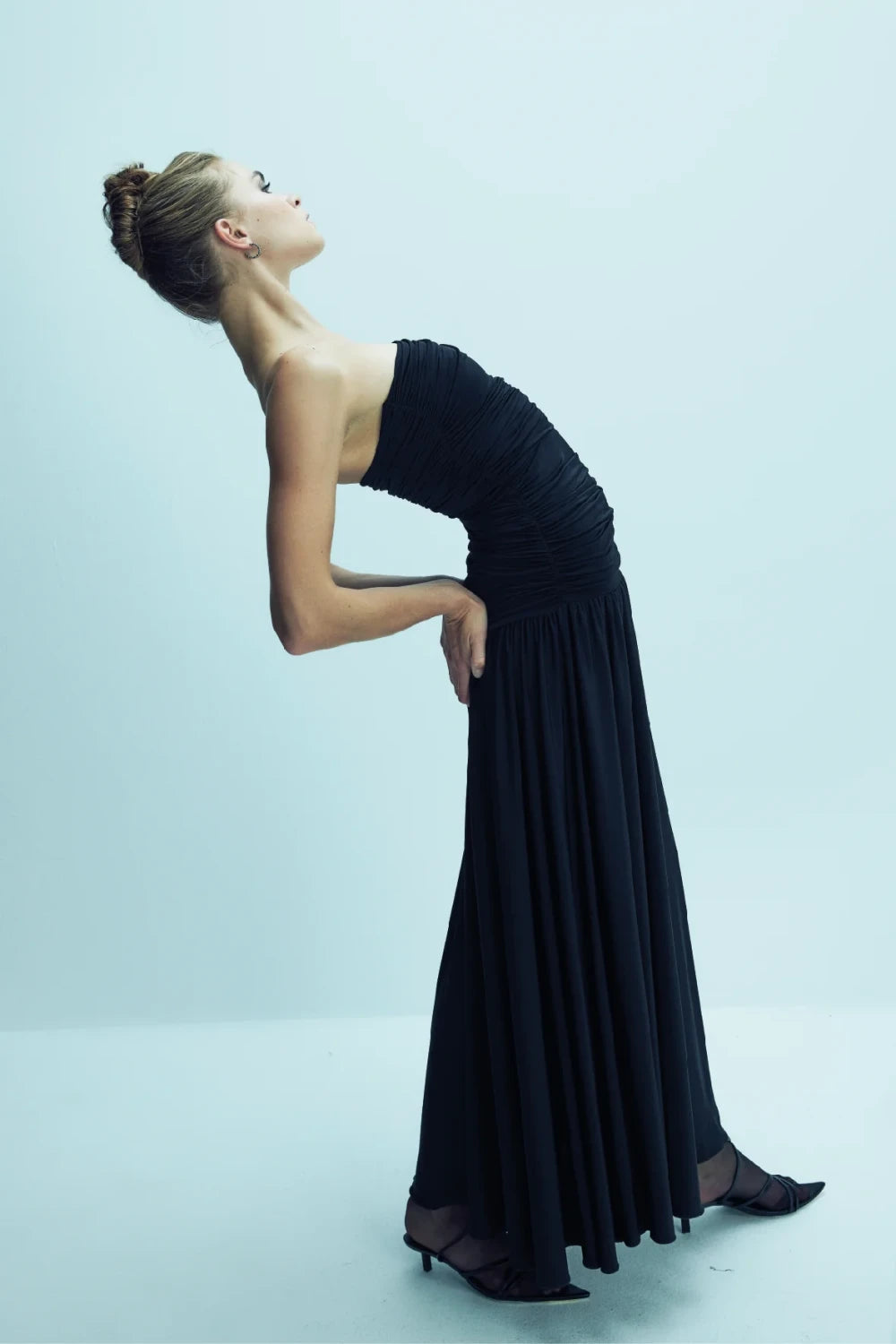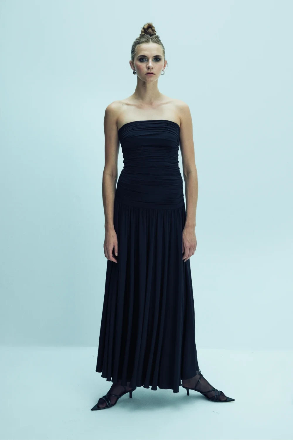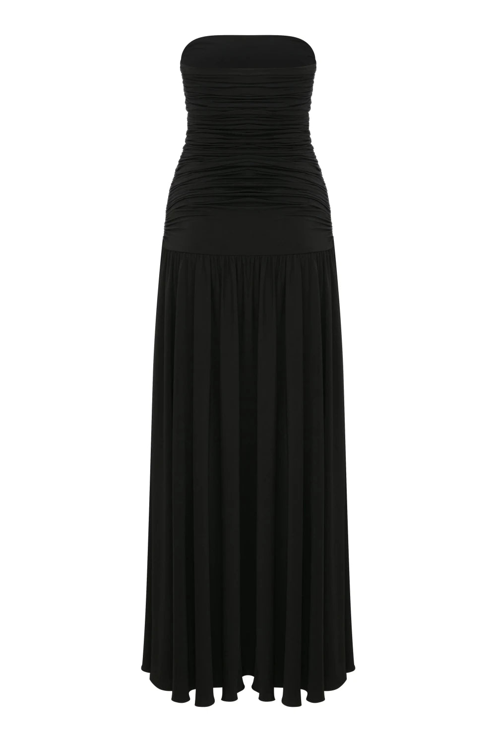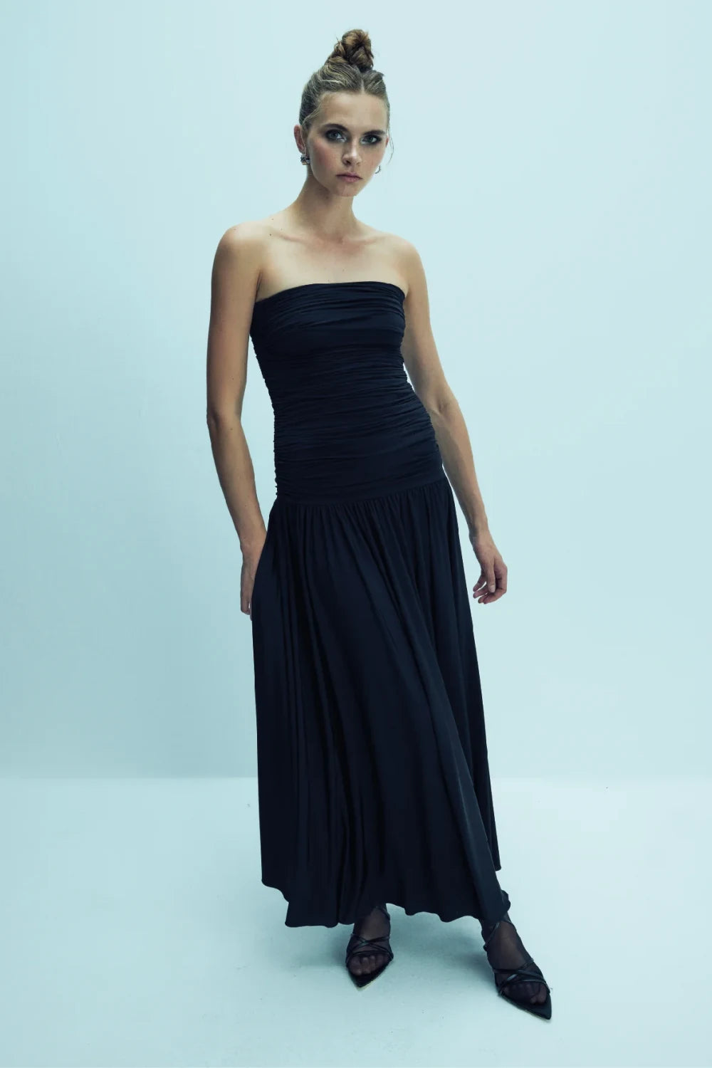 Amber elbise, şıklığı ve rahatlığı bir araya getiriyor. Straplez, askısız tasarımıyla dikkat çeken bu elbise, bel ve göğüs bölgesindeki özel büzgü detaylarıyla vücudu kusursuzca sarıyor.