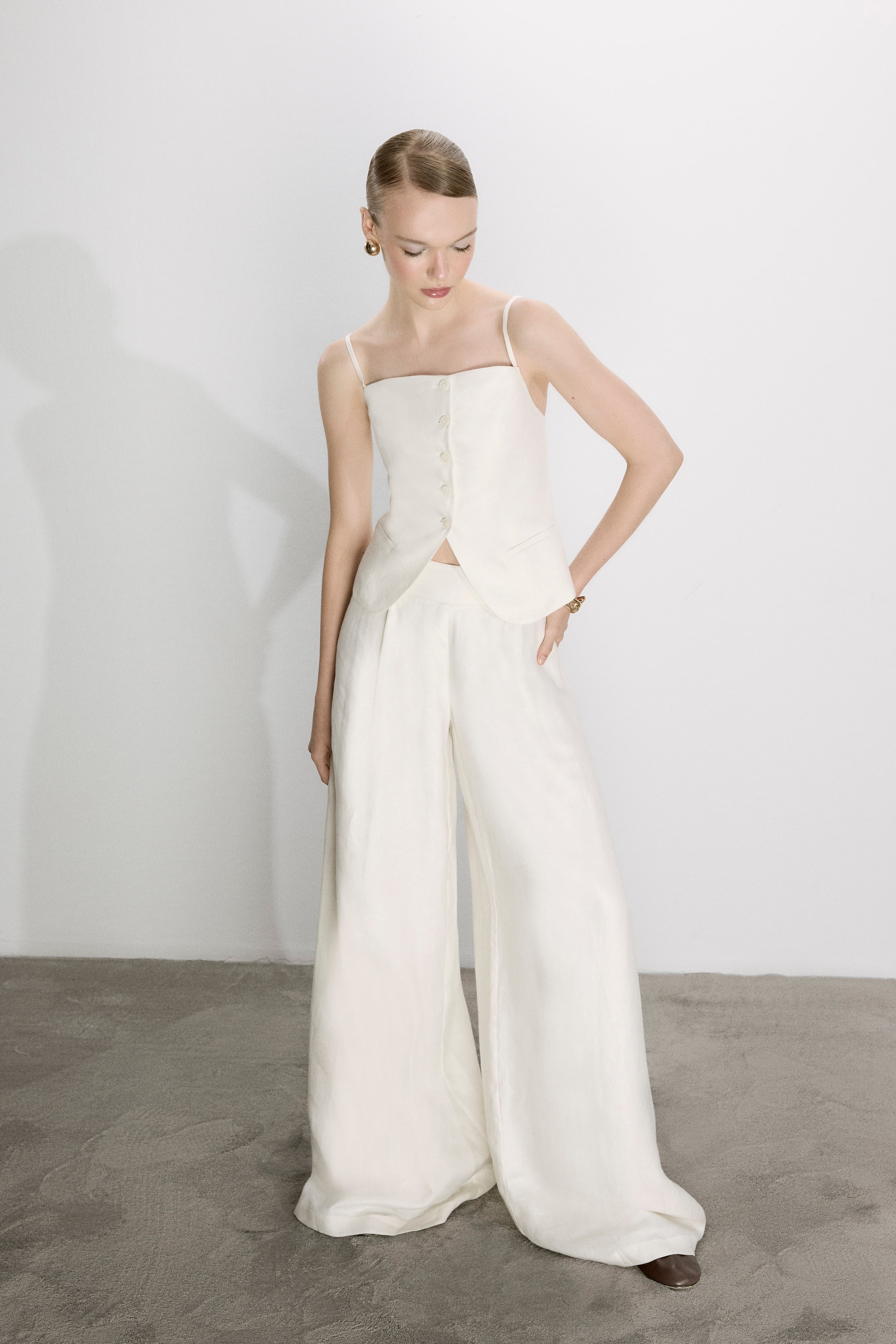 Mui Keten Pantolon, geniş paçalı, yandan gizli fermuar ile tamamlanmıştır. Brita Keten Yelek, Marona Top yada Ravenna Keten gömlek ile kombinlenebilir.