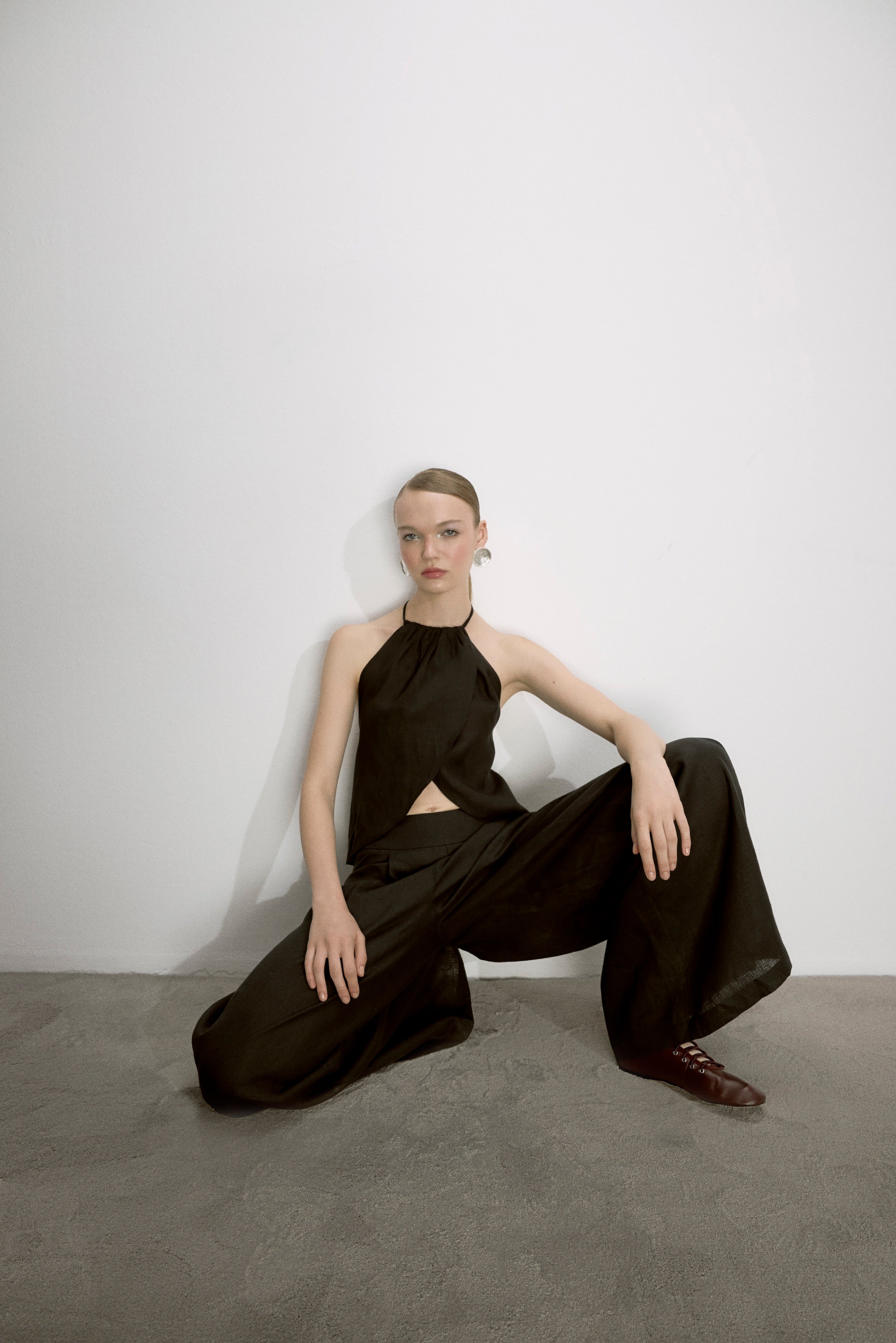 Mui Top, %100 Doğal keten kumaştan üretilmiş. Ön taraftan birbirinin üzerine binen iki parçalı tasarımı dikkat çekici olup konforlu bir görünüm sunar. Mui Keten Pantolon ile kombinlenebilir.
