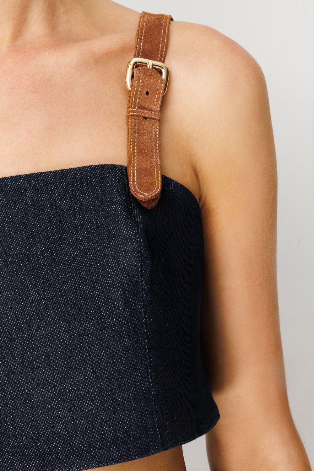 Modern silüeti klasik detaylarla birleştiren askılı denim büstiyer, arka ortasından fermuarla birleştirilen ve vücudu feminen gösteren sofistike bir tarza sahiptir. Koleksiyonun tüm parçalarıyla kombinlenebilir, hem gündüz hem gece şıklığına uyarlanabilir.