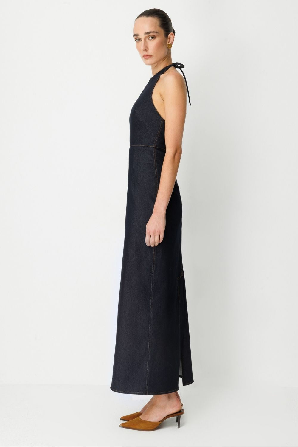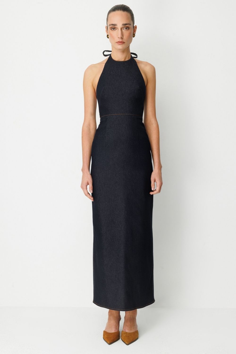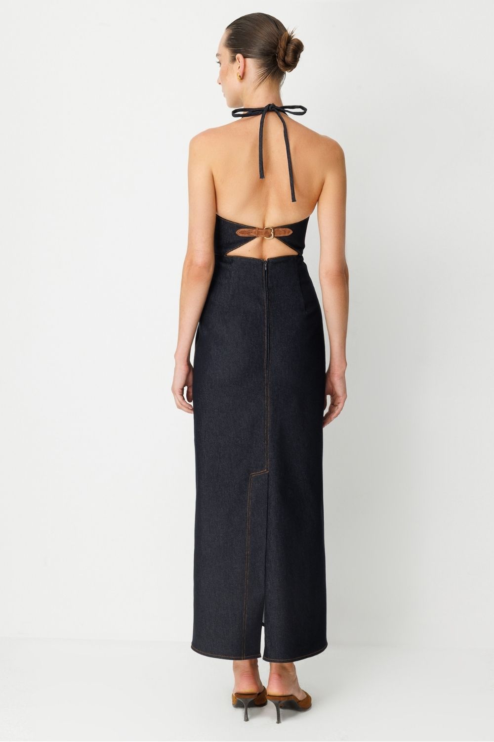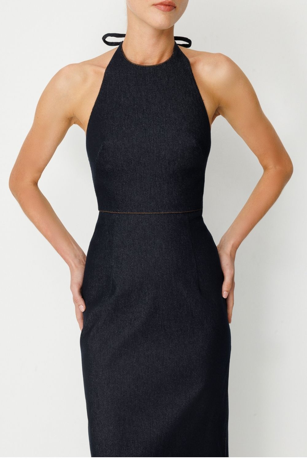 Feminen detayları güçlü bir denim duruşla birleştiren bu elbise, modern kadının özgüvenli stilini yansıtıyor. Halter yaka kesimi, sırt açıklığı ve zarif süet kemer ve altın kaplama toka detayıyla dikkat çeken bu model; iddialı ama sade bir görünüm arayanlar için ideal. Halter yakalı üst kısım, ense kısmından bağlanarak vücuda ayarlanabilir bir form sunar. Sırtta, bele kadar açılan kesik detay, elbiseye hem modern hem cesur bir dokunuş katar. Belde kullanılan kontrast renkli süet kemer detayı, altın kaplama tokasıyla birlikte vurgulayıcı bir aksesuar görevi görür. Elbisenin düz ama etkileyici silueti, vücuda hafif oturan bir yapıdadır. Arkadaki yırtmaç detayı elbiseye hareket kazandırır.