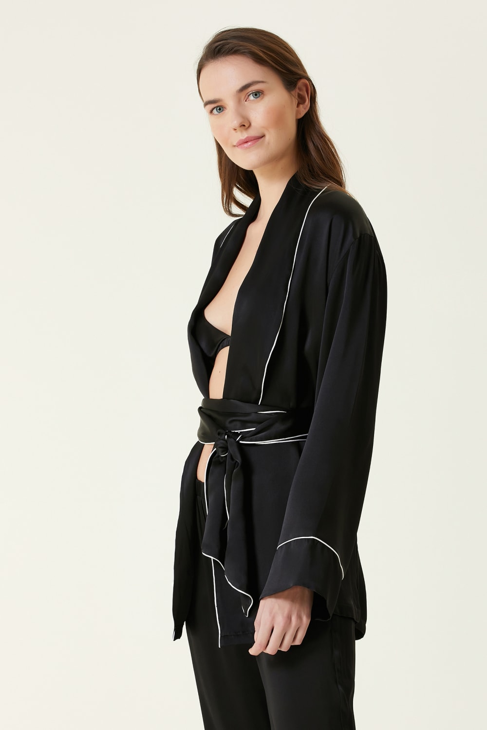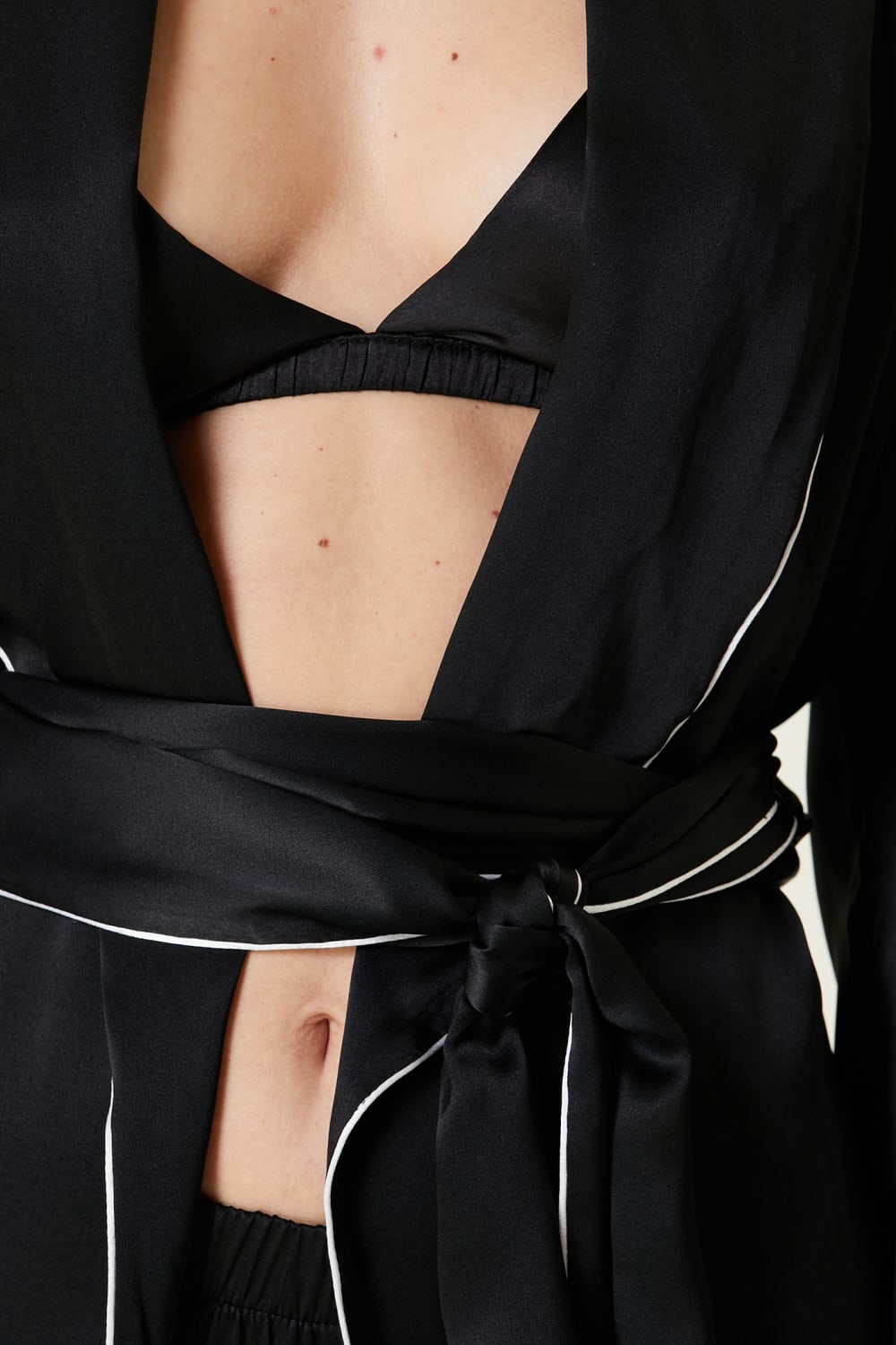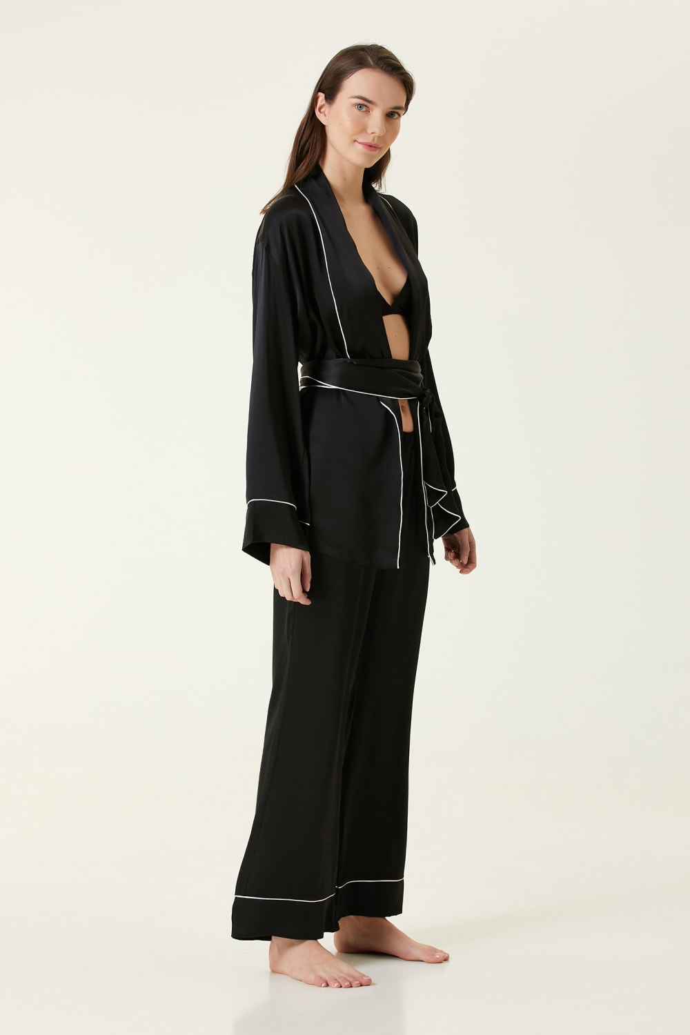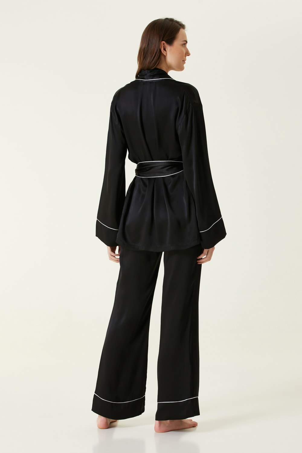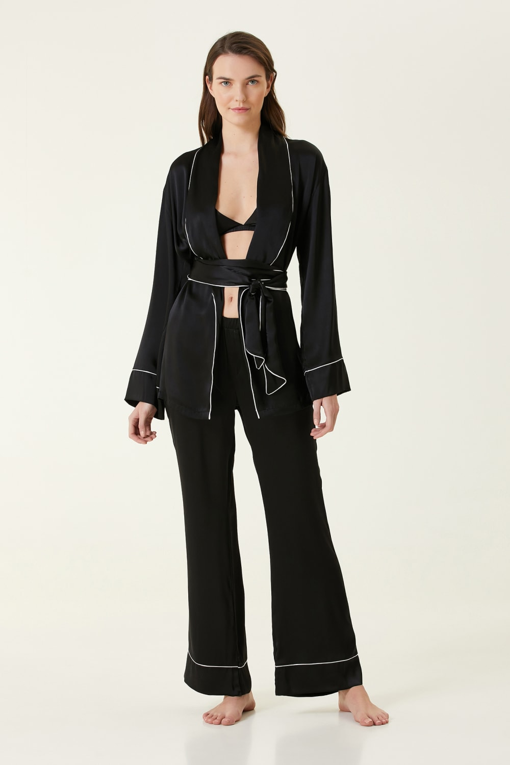 İpek Sabahlıklı 3'lü Siyah Kadın Pijama Set