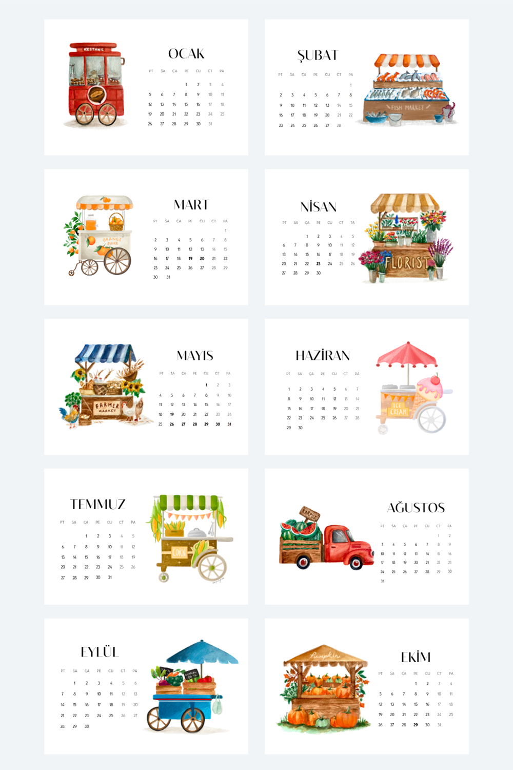 Çocukluğumdan beri yerel pazarların ve rengarenk yiyecek tezgahlarının büyüsüne kapılmışımdır. Her biri kendine özgü lezzetleri, kokuları ve karakteriyle sıralanan bu tezgahlarda dolaşmak, benim için daima ilham verici bir deneyim olmuştur. Geçen ilkbahar, bu ilhamı hayata geçirip, farklı kültürlerin yiyecek tezgahlarını bir araya getiren bir takvim yapma fikriyle yola çıktım. Taze meyve kamyonlarından simit arabalarına kadar her ay, bu sevilen pazarların özünü yakalayan bir tezgah sunuyor.