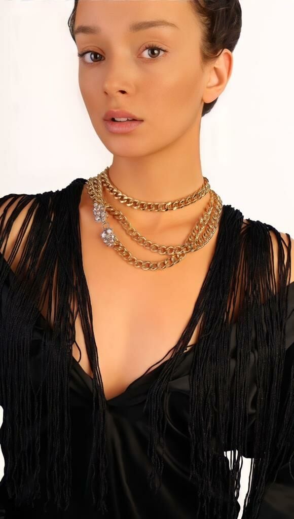 FIORE Altın Kaplama Çoklu Kolye, lüks ve gösterişin simgesi olarak tasarlandı. Üç katmanlı bu büyüleyici tasarım, 22 ayar altın kaplama pirinç zincirlerin sıcak ışıltısıyla her stili kusursuz bir şekilde tamamlar. En uzun zincirde yer alan ve kristal taşlarla bezenmiş çiçek sembolü, doğanın yeniden doğuşunu ve ölümsüz güzelliğini simgeler, parlak taşlarla birleşerek FIORE Altın Kaplama Çoklu Kolye'ye zarif bir parlaklık kazandırır. Her bir katman, giyeni kendi özgün hikayesini yaratmaya davet ederken, aynı zamanda göz alıcı bir uyum sergiler. FIORE Altın Kaplama Çoklu Kolye, göz kamaştırıcı detayları ve altın ışıltısıyla, sahibine sadece bir aksesuar değil, aynı zamanda bir duruş ve ifade biçimi sunar.