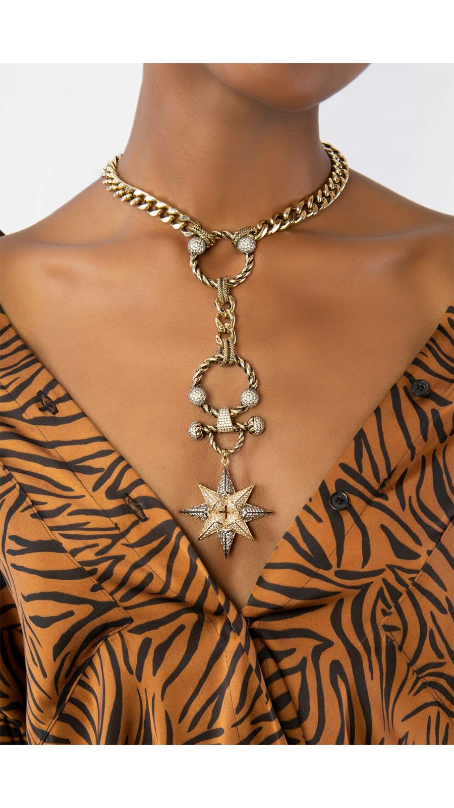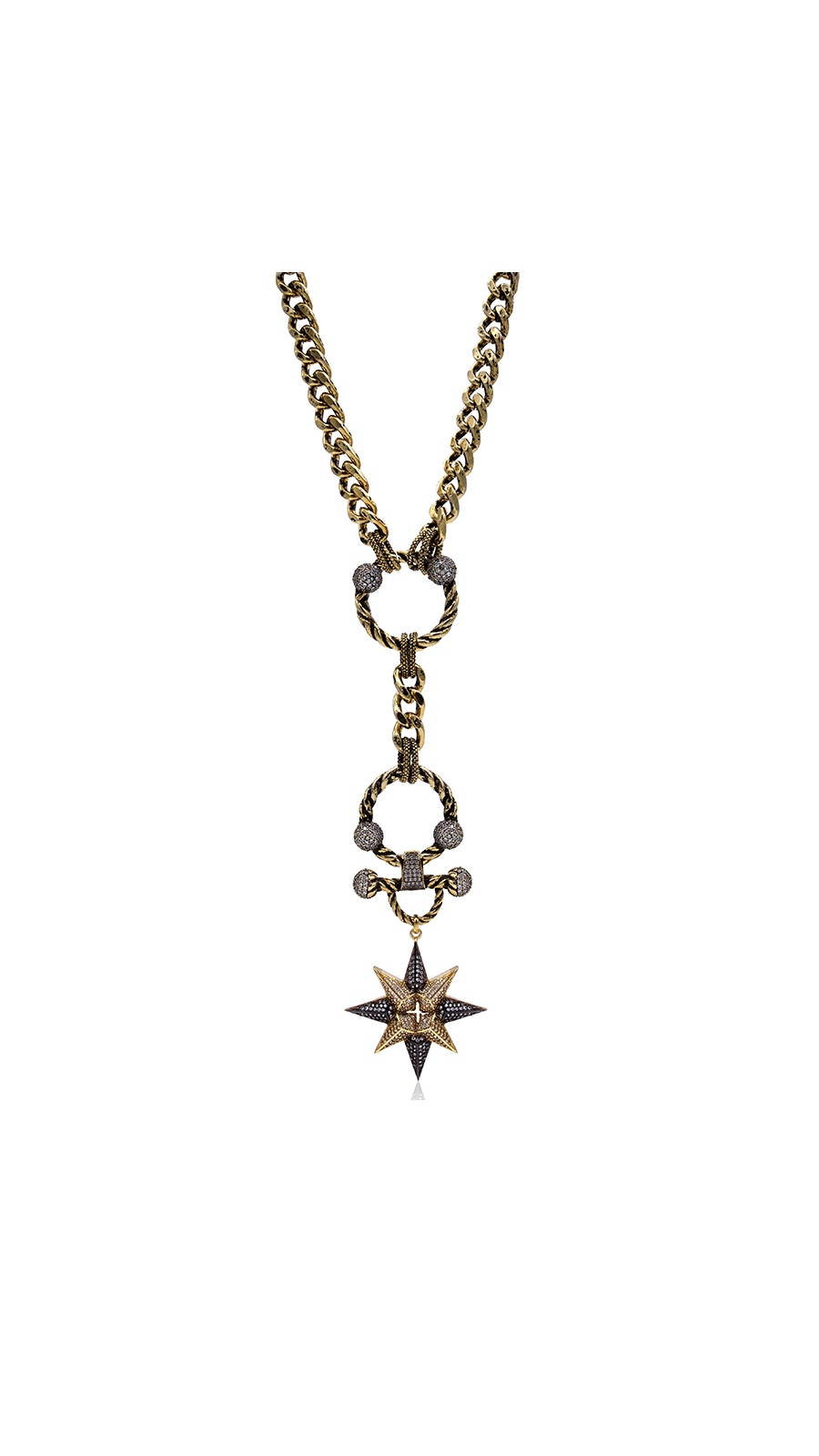 Bayemeyc'in Loadstar Altın Kaplama Yıldız Kolyesi, gökyüzünün yıldızlarından ilham alarak tasarlanmış bir parça. Bu zarif kolye, 22 ayar altın kaplama pirinç zincirin ihtişamı ile göz kamaştırıyor. Loadstar Altın Kaplama Yıldız Kolye'nin merkezi, halka şeklinde bir bağlantı noktası olarak dikkat çekerken, bu halkadan inen ikinci bir zincir, tasarımın hareketini ve akışını vurguluyor. Bu zincirin sonunda asılı duran, kristal taşlarla süslenmiş yıldız sembolü, ışıltısıyla gece gökyüzünün en parlak yıldızını andırıyor.