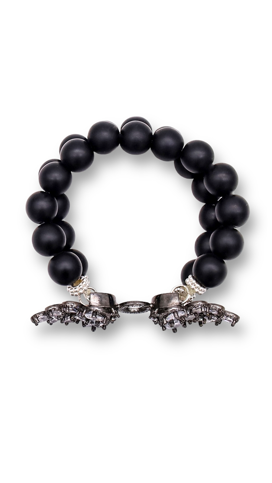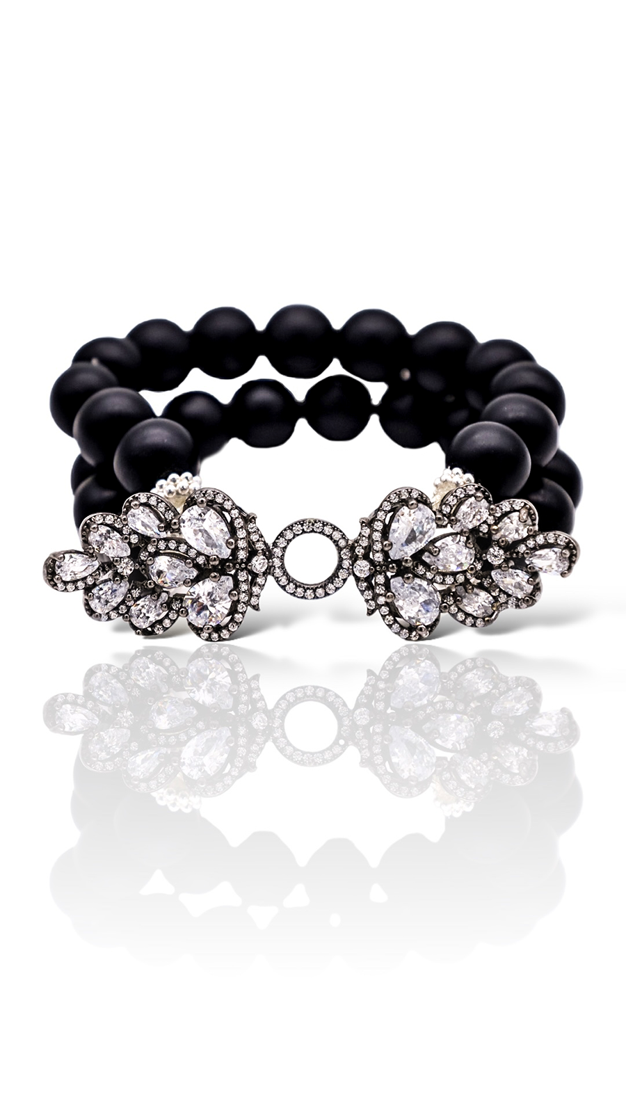 Noche Doğal Taş Kristal Bileklik, şıklığın ve mistik gücün somut bir ifadesidir. Bu zarif bileklik, doğal oniks taşlarının cesur ve güçlü iki sıra dizilimiyle başlayarak, kişisel ifadenizi vurgular. Merkezde yer alan kristal taşlarla bezeli çiçek sembolü, bilekliğe bir lüks ve sofistikasyon katmanı eklerken, oniks taşlarıyla bağlantısını kuran 925 ayar gümüş kaplama halkalar, detaylara olan ince dikkati gözler önüne serer. Noche Doğal Taş Kristal Bileklik, hem gündüz hem de gece kullanımı için mükemmel bir seçim olup, her el hareketinde size eşlik edecek bir parlaklık ve karakter sunar.