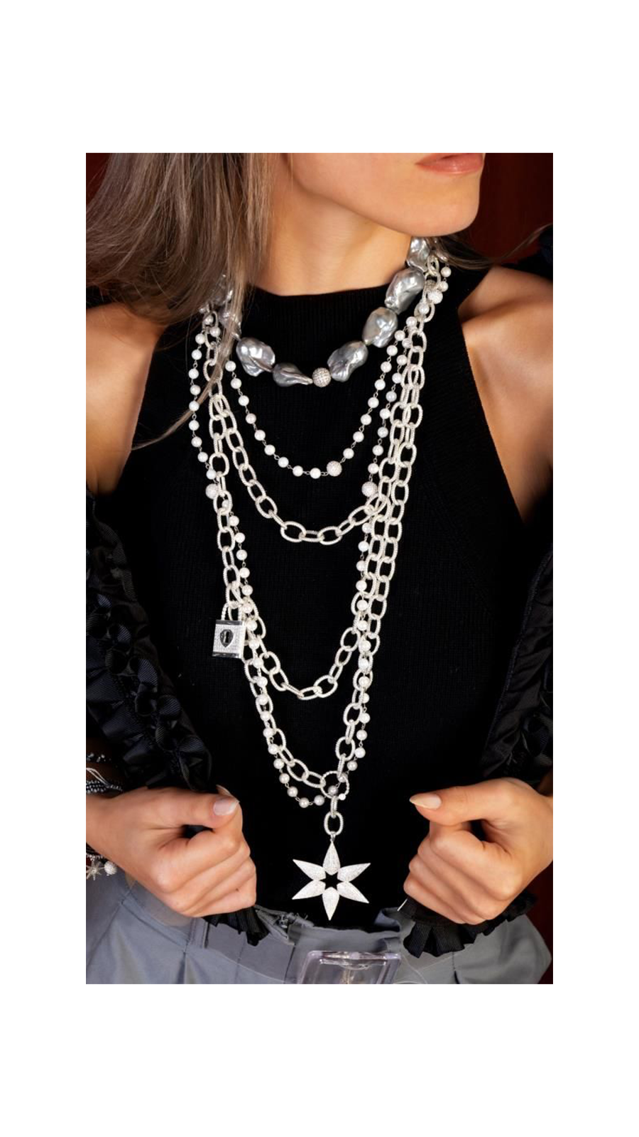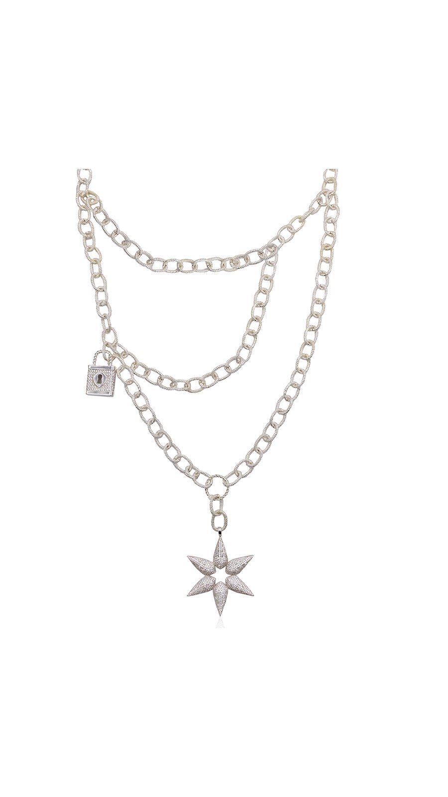 RIGEL Gümüş Kaplama Zincir Kolye, gecenin ışıltısını boynunuza taşıyan eşsiz ve göz alıcı bir parçadır. Üç farklı gümüş kaplama pirinç zincirin asimetrik ve katmanlı dizilimiyle dikkat çeken RIGEL Gümüş Kaplama Zincir Kolye, günlük giyimden özel gecelere kadar her anınıza uyum sağlayacak şekilde tasarlanmıştır. İkinci sırada yer alan kilit sembolü, sevgi ve bağlılığın sonsuz kapanmazlığını simgelerken, en alt sıradaki yıldız sembolü ise üzerindeki kristal taşlarla birlikte parıldayarak her hareketinizde ışık saçar.