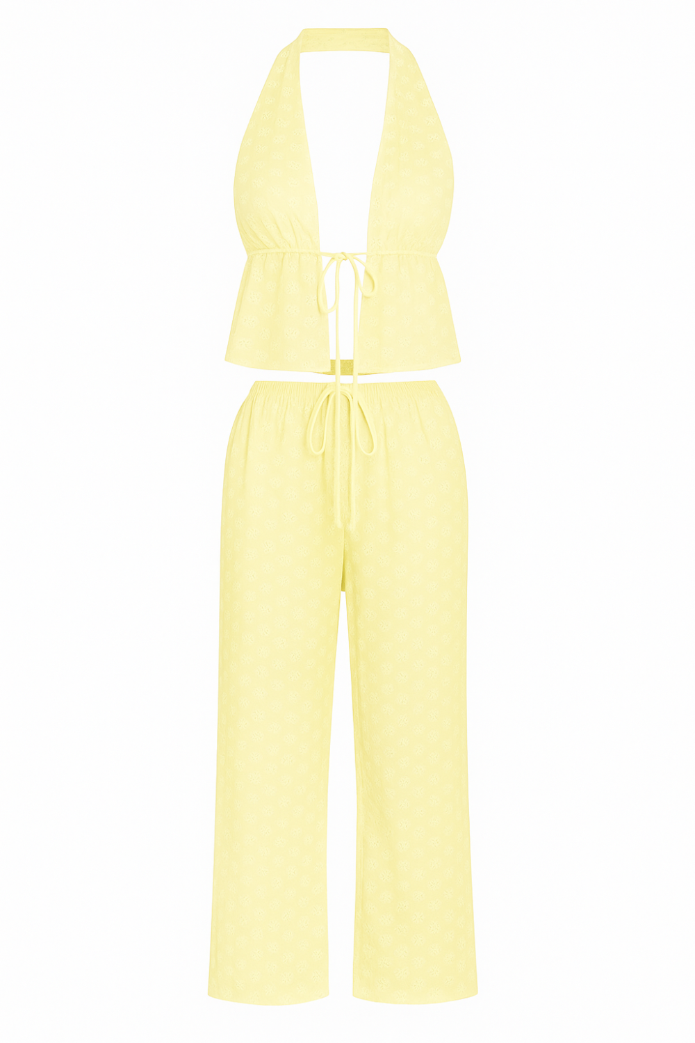Güneşin sıcaklığını üzerinde taşımak isteyenler için tasarlandı. Hafif keten kumaşı ve zarif desen dokusuyla gün boyu ferahlık sunarken, ip detaylı üst tasarımı feminen bir dokunuş katıyor. Rahat kesimli pantolonu ise hem şık hem konforlu. Yaz akşamlarında, sahil yürüyüşlerinde ya da şehirde stilini yansıtmak isteyenler için mükemmel bir seçenek.