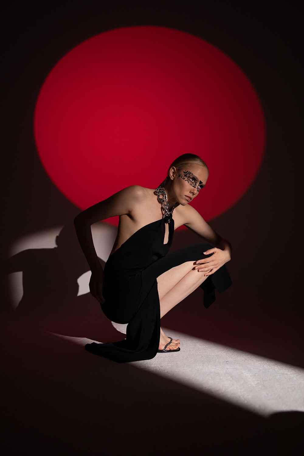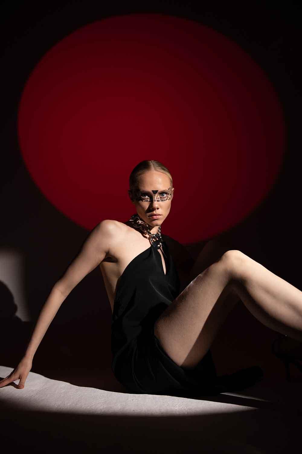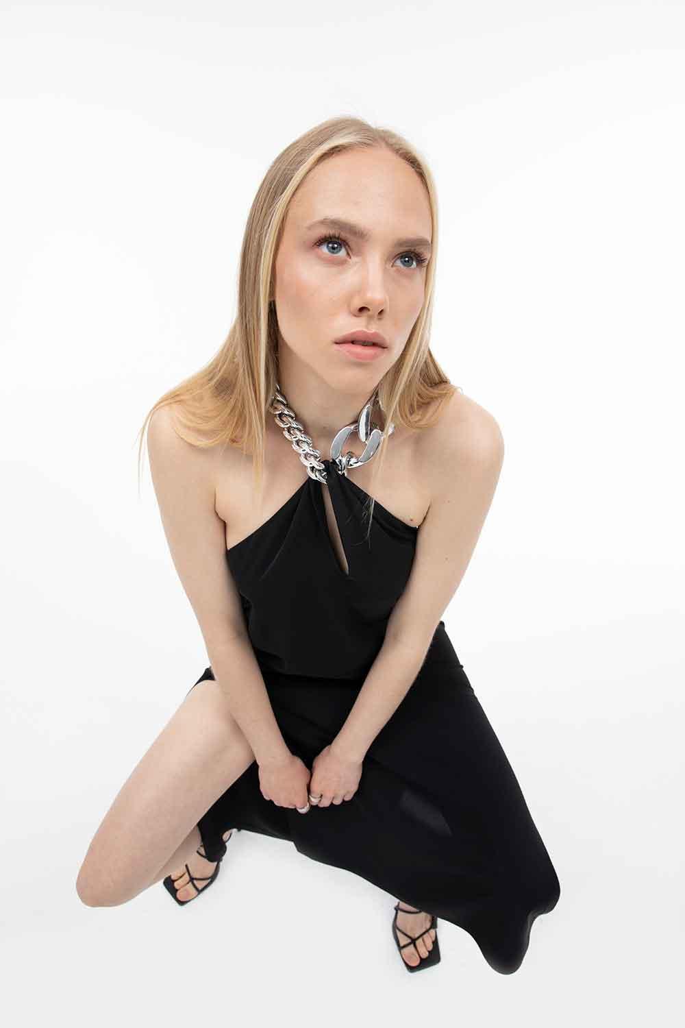 Creating an assertive look can sometimes restrict movements. The comfortable cut of the Coleto Dress will not prevent you from moving freely. All eyes will be on you with the large chain necklace accessory and deep back neckline.