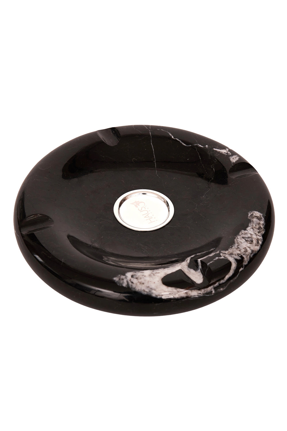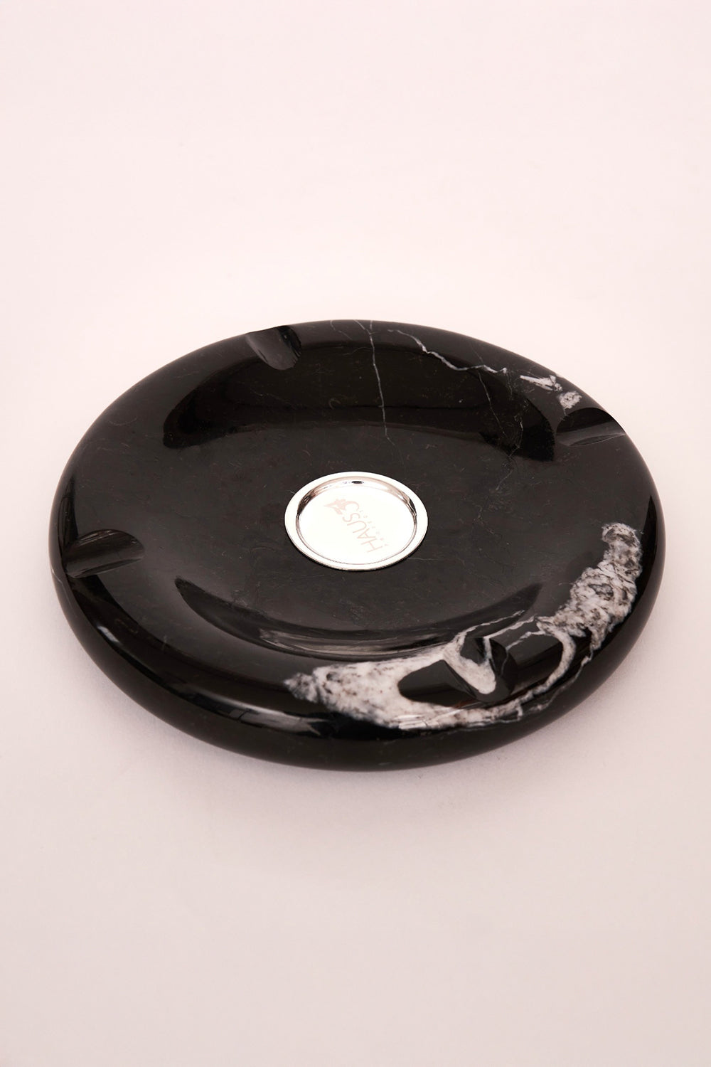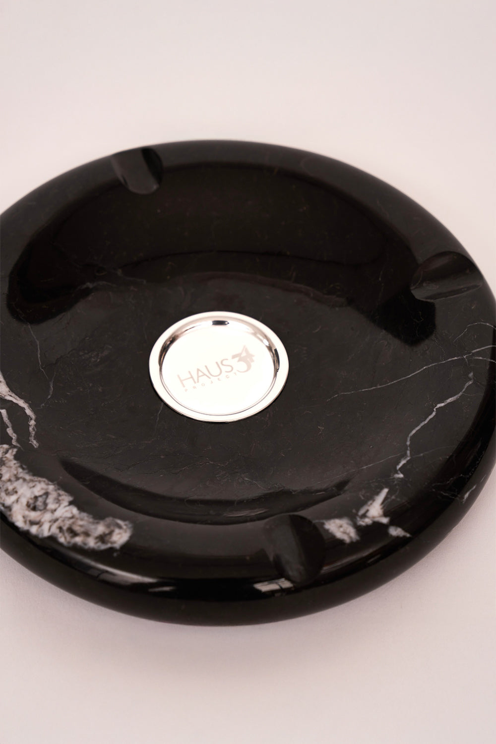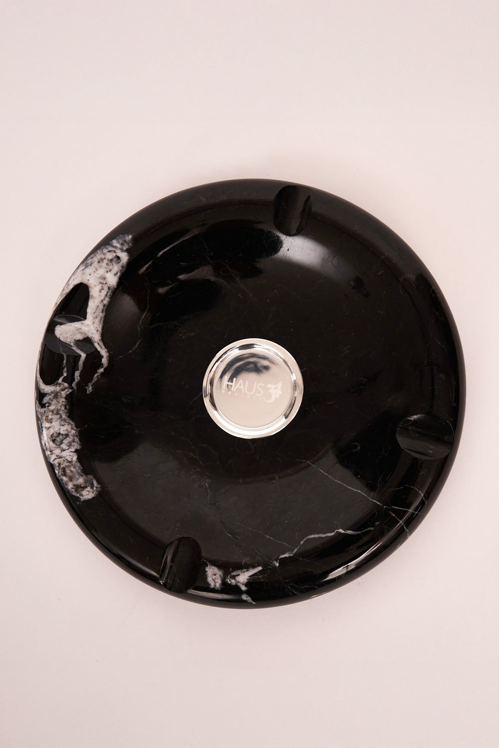 L'arena Toro Puro Küllüğü. Siyah Toros mermerin doğal derinliği, kusursuz yuvarlak formda hayat bulurken, merkezde yer alan pirinç detay gümüş tonlarıyla tasarıma sofistike bir kontrast katar.