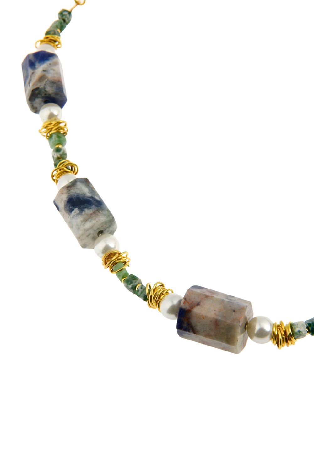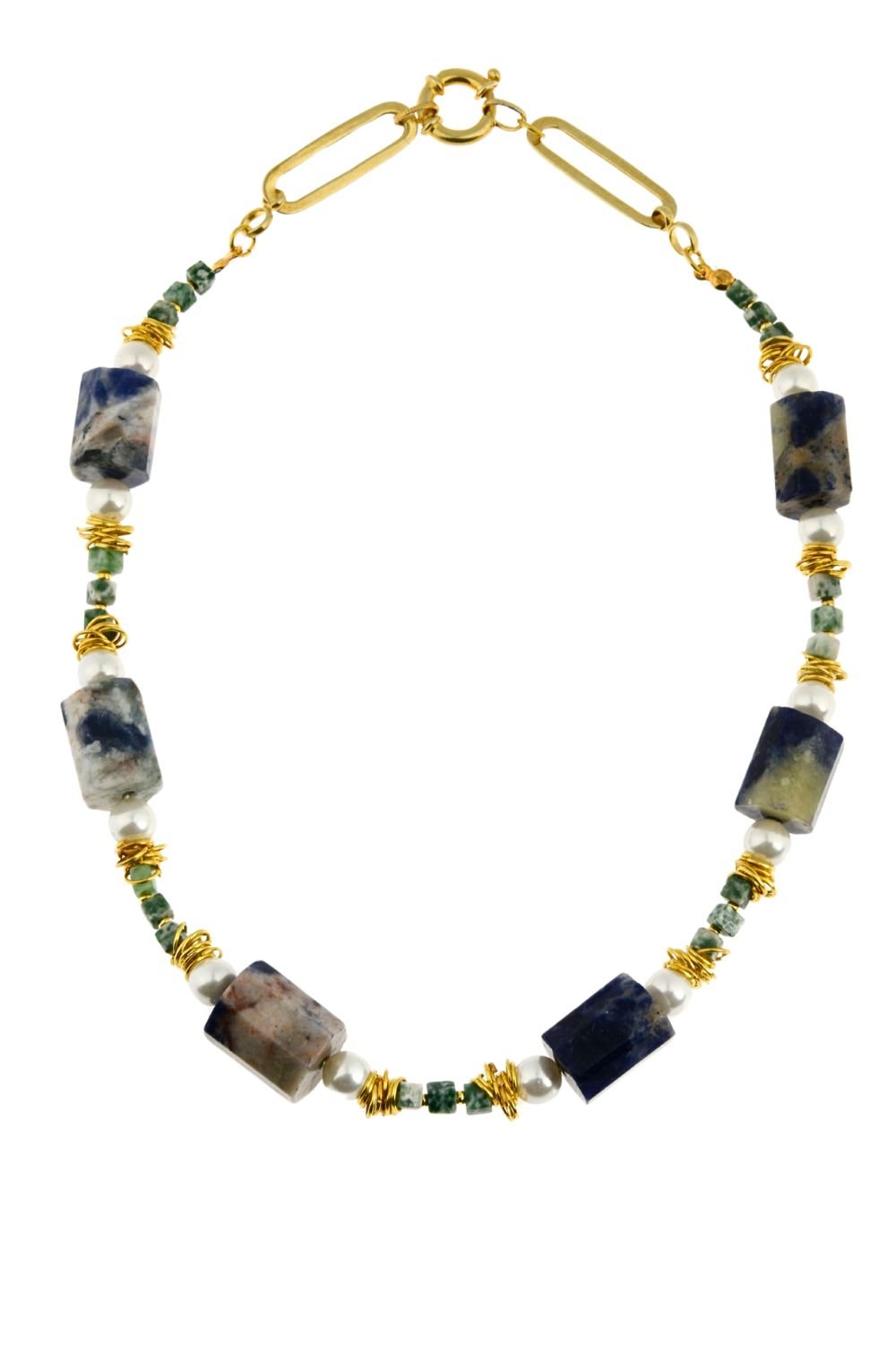 Gümüş & Pirinç Karışımı Kolye | Yeşil Varasit & İnci & Lapis Lazuli Taşı