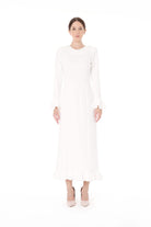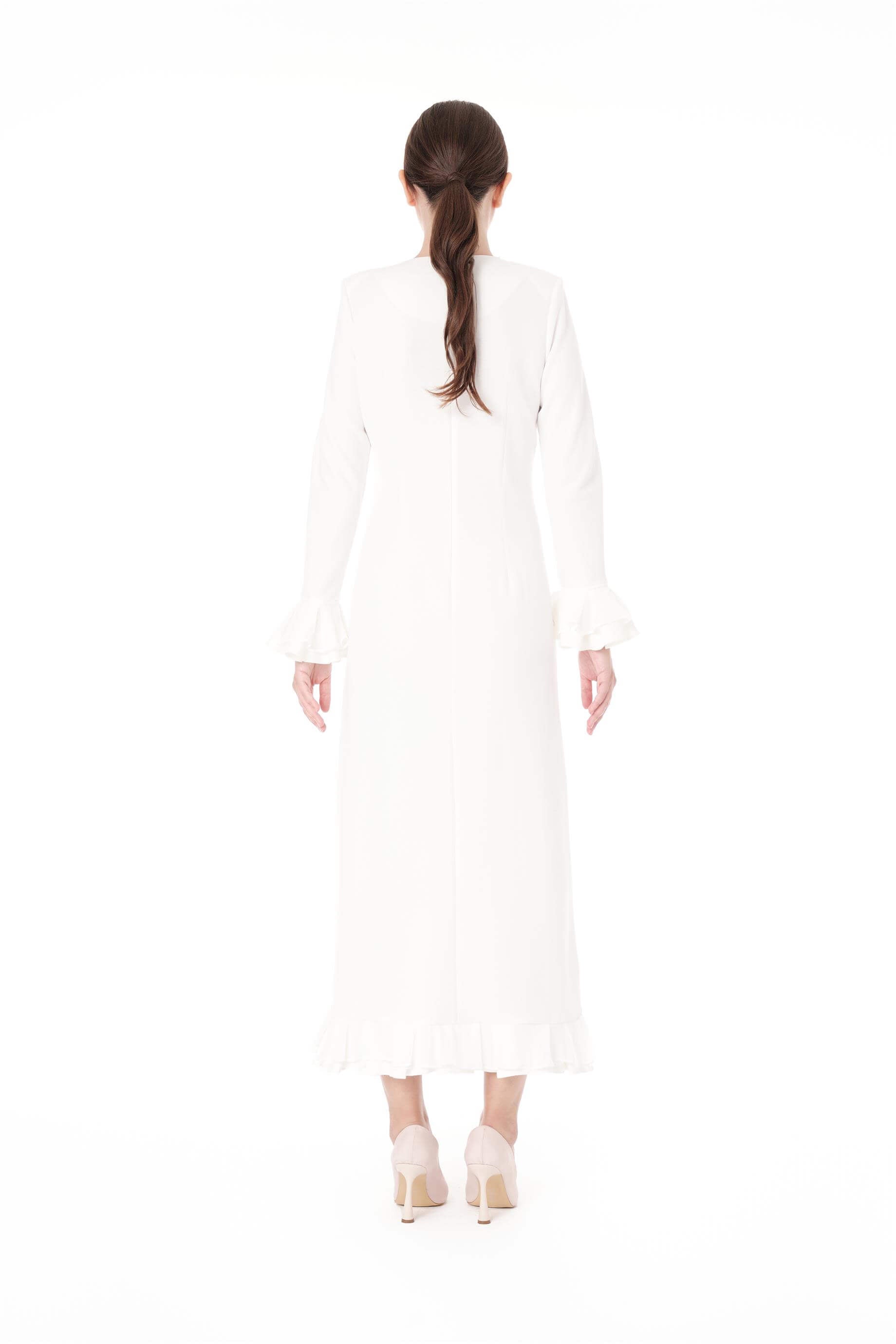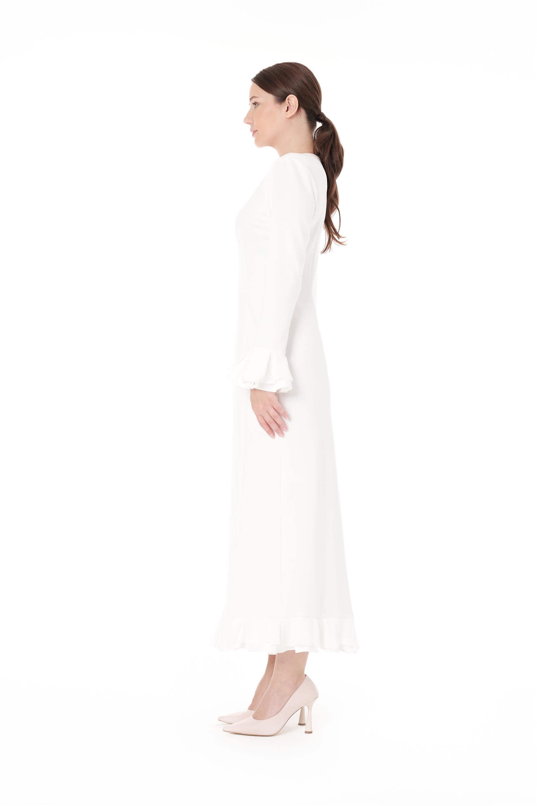 - Ürün Açıklaması: Etek ucu ve kol ağzı iki kat volan detaylı. Arkadan fermuar kapamalı uzun elbise.