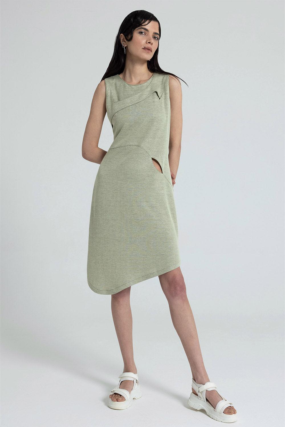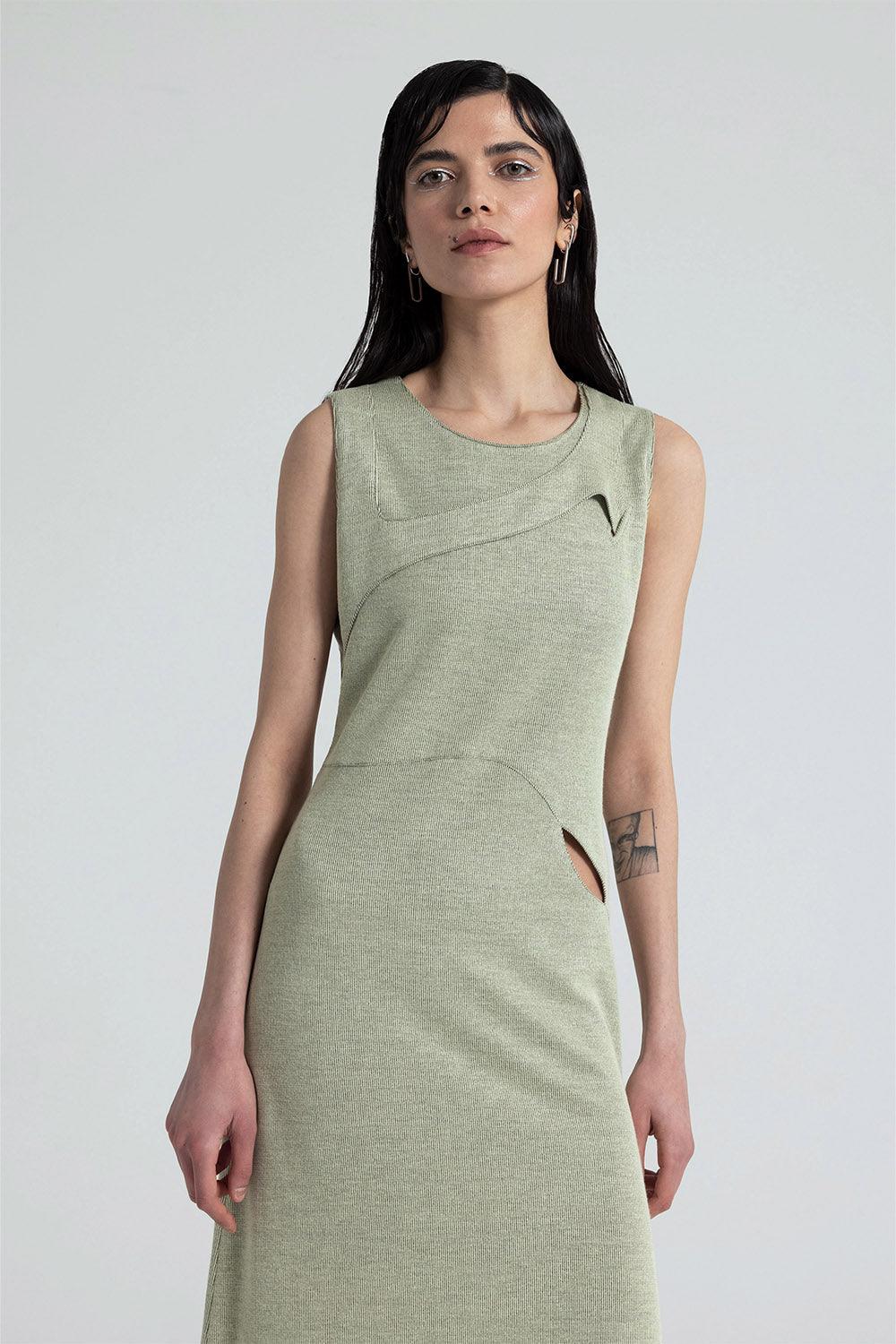 Knitted dress with asymmetrical window details.