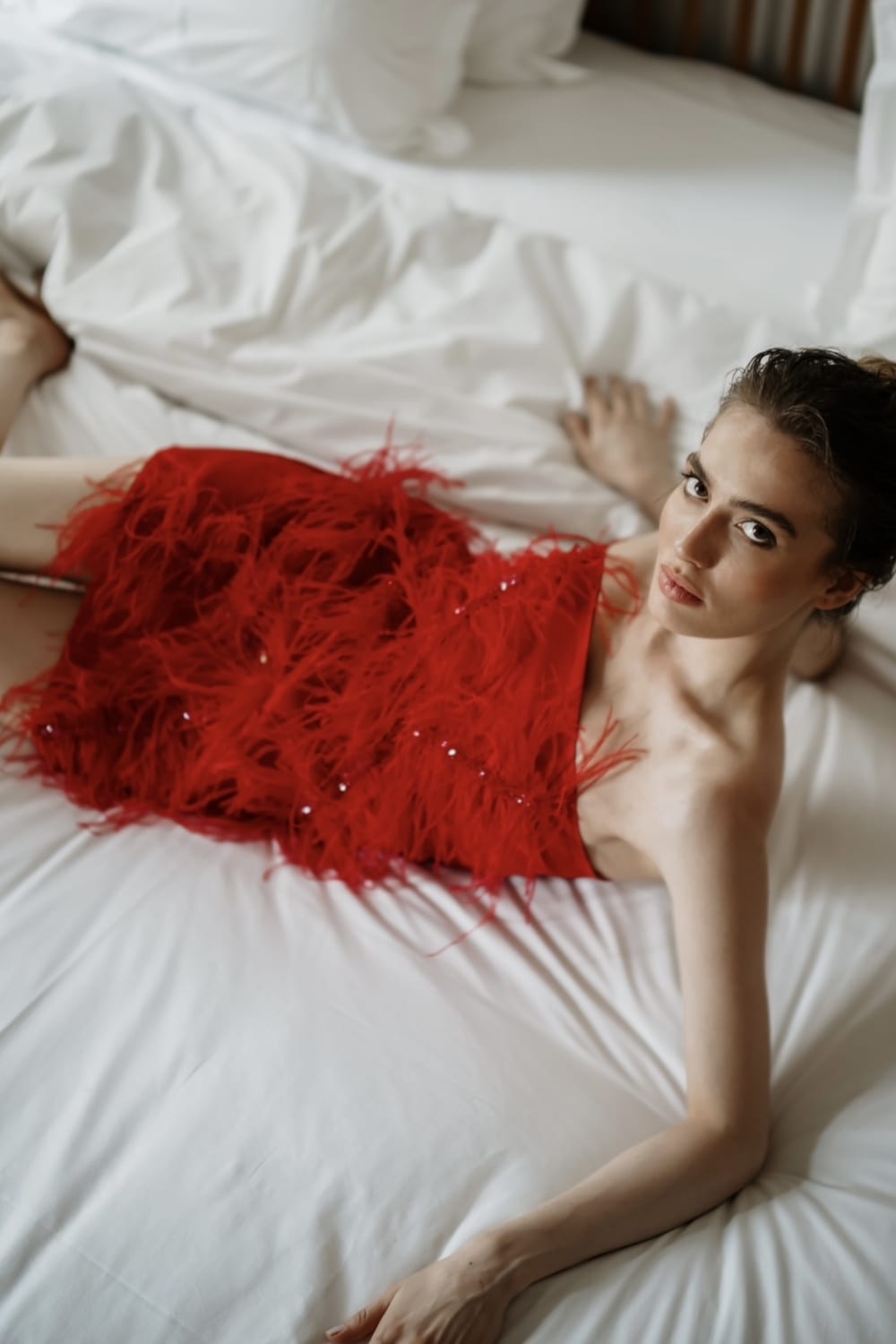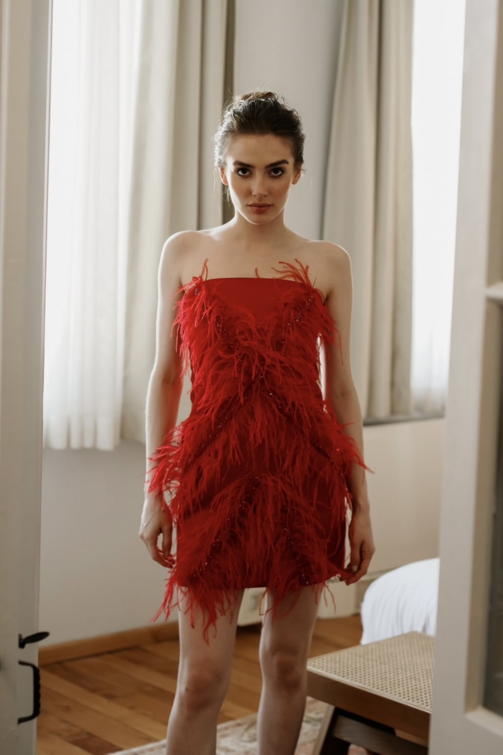 Rebecca Kuştüylü Taş İşlemeli Kırmızı Mini Elbise