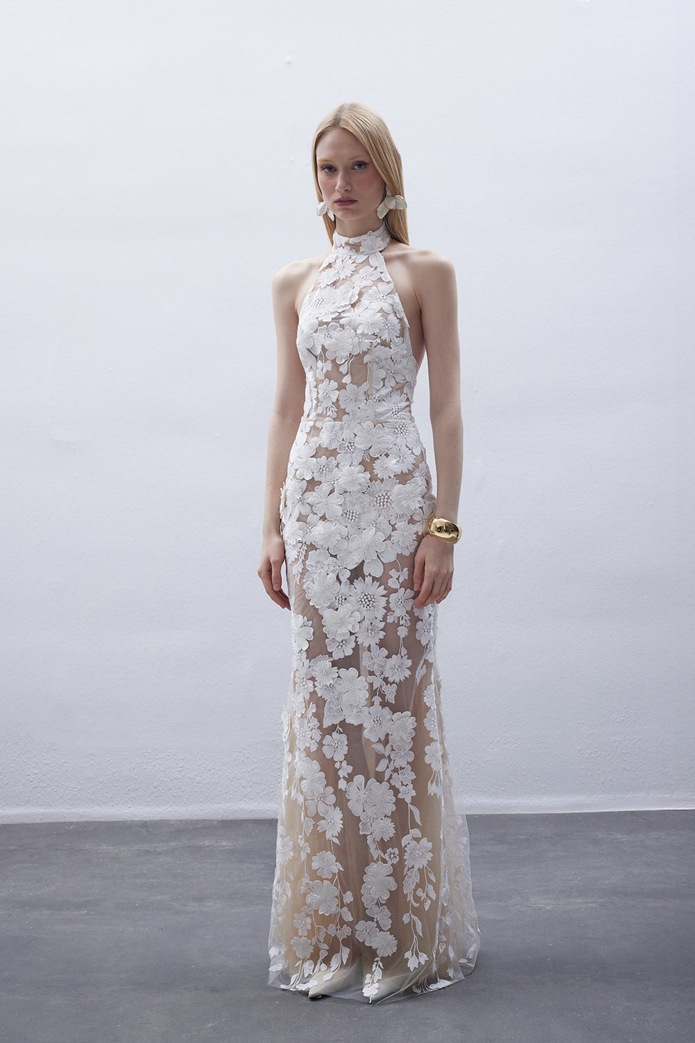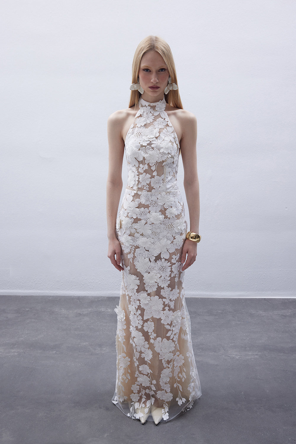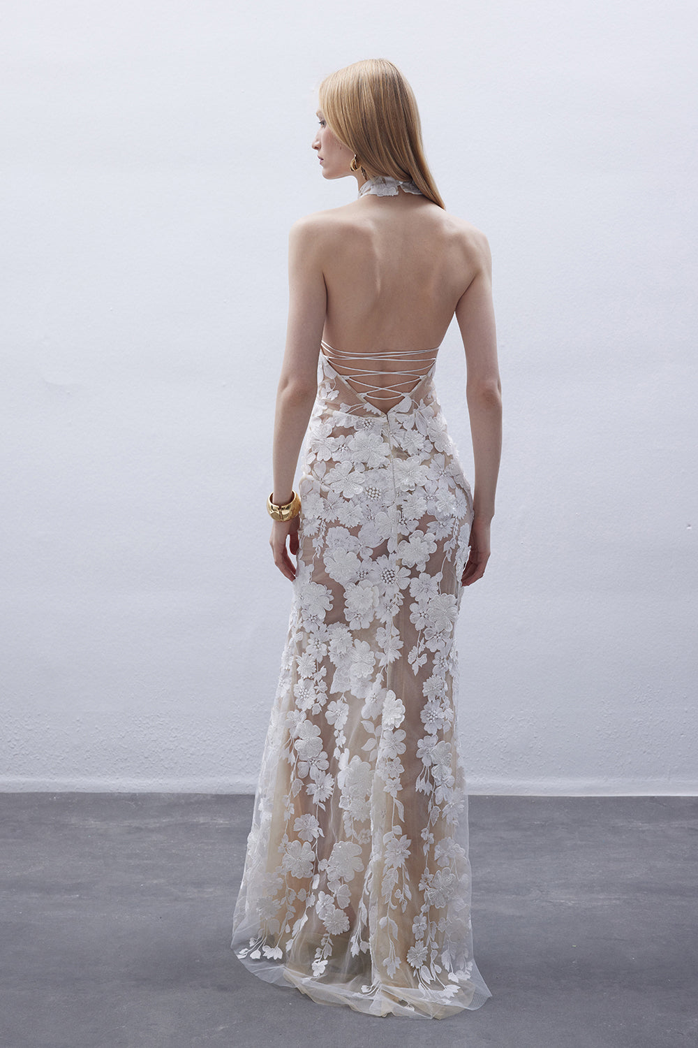 Bu elbise, vücudu zarifçe saran ve hatlarını belirginleştiren transparan, üç boyutlu çiçek desenleriyle tasarlanmıştır. Arka kısmındaki ayarlanabilir bağcık detayları, silueti biçimlendirirken aynı zamanda büyüleyici bir özgürlük hissi sunar.